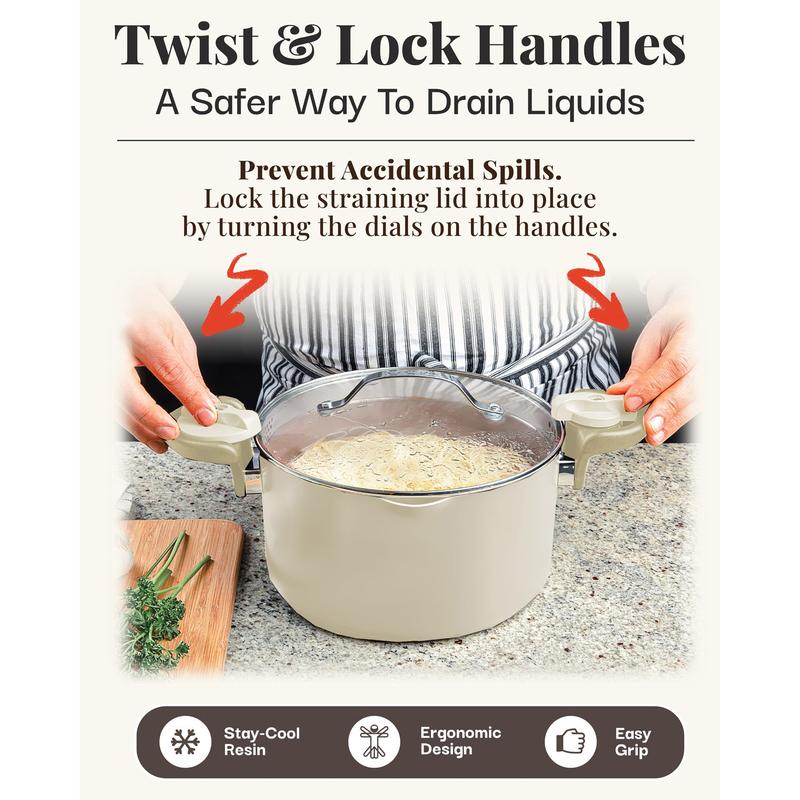 ·TWIST AND LOCK HANDLES: Prevent food spills by securely locking the straining lid in place with a simple twist of the handle dials. Draining liquids is hassle-free.