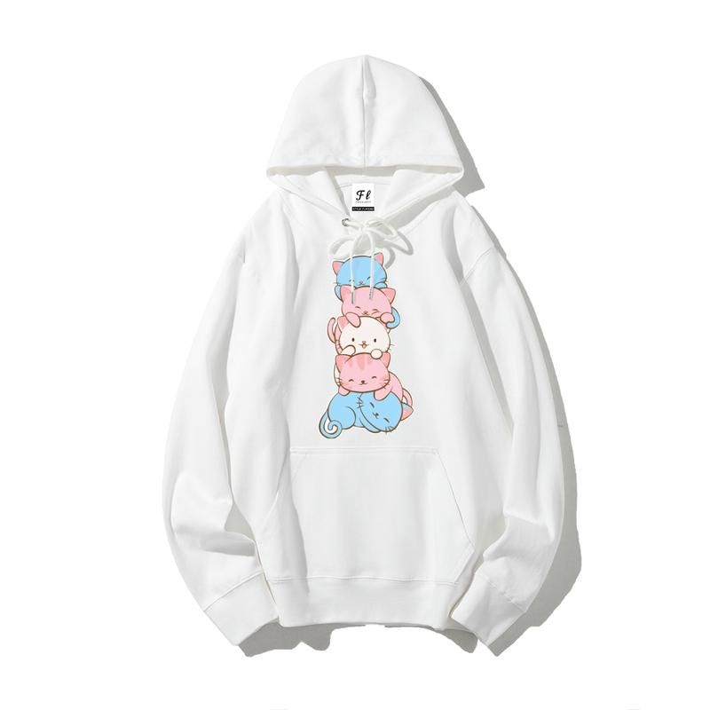 This crisp white pullover features a squishy pile of pastel kittens (soft blues, pinks, all sleepy and snuggled) — pure cuddle energy in a print. Made with ultra-soft fabric (perfect for cat naps, coffee runs, or just looking like a walking hug), it’s the blend of comfort and charm that’ll make your day brighter.