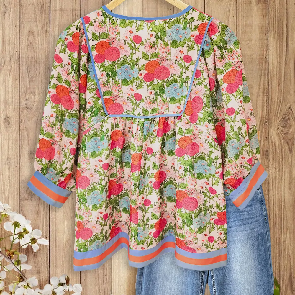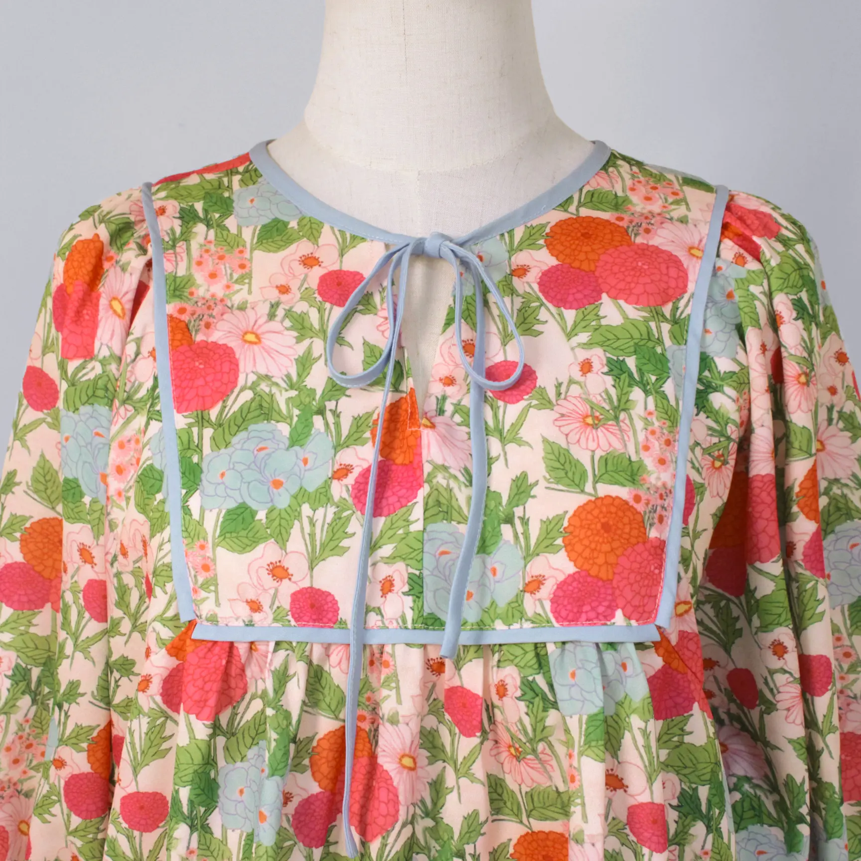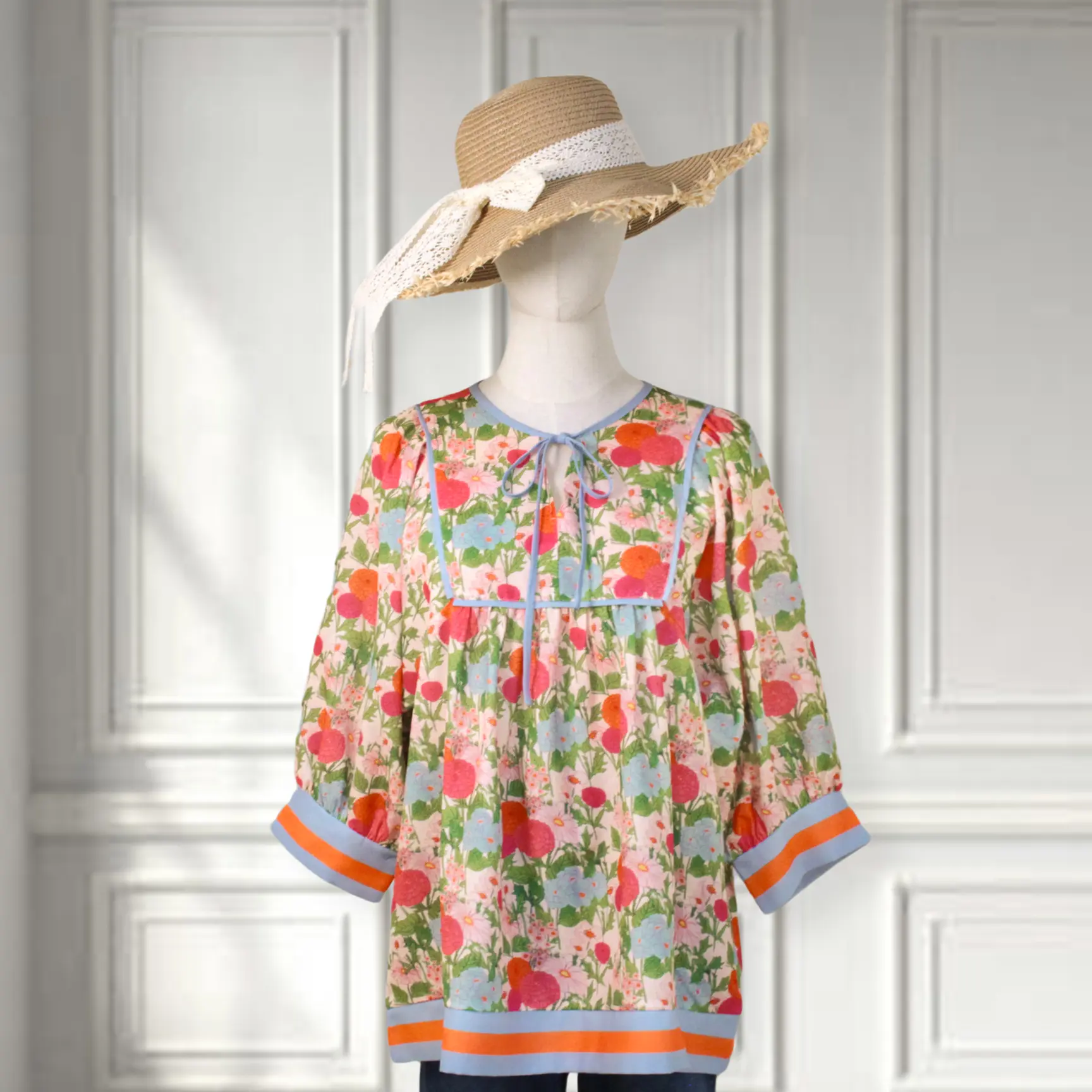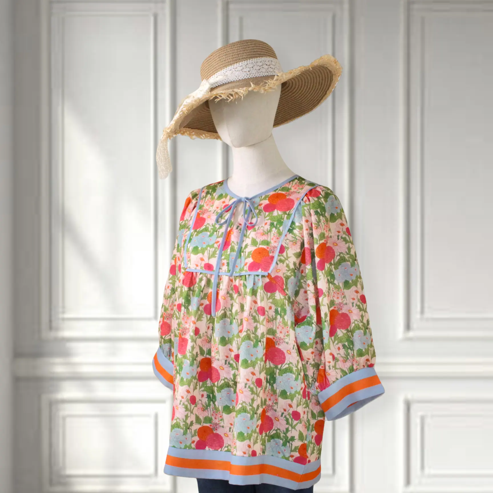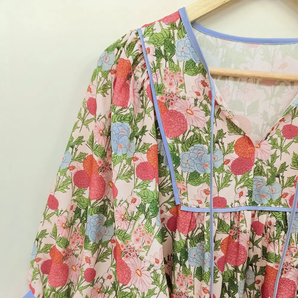 · Soft pastel pink floral print with vibrant blue and orange stripe accents at cuffs and hem – a fresh take on spring style.