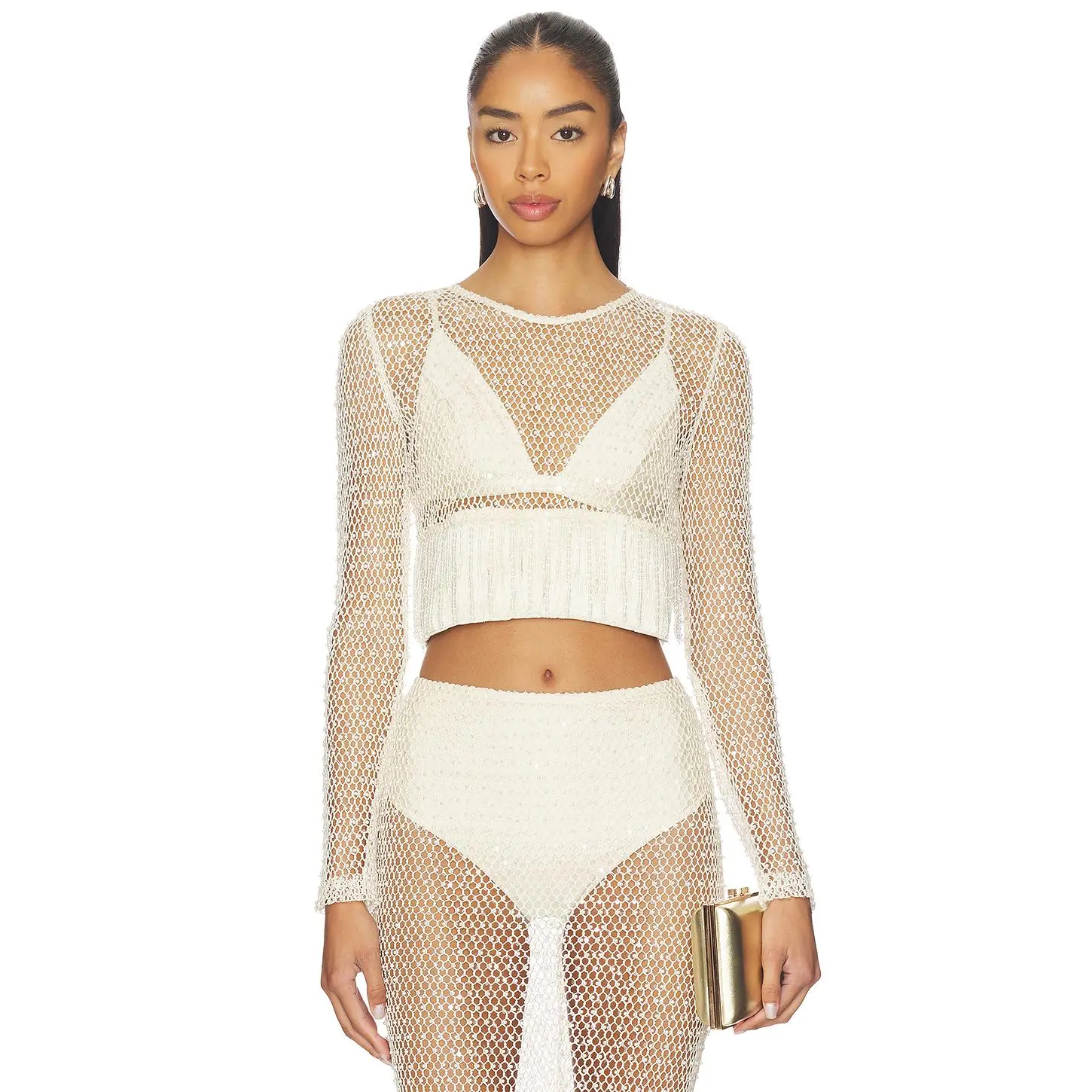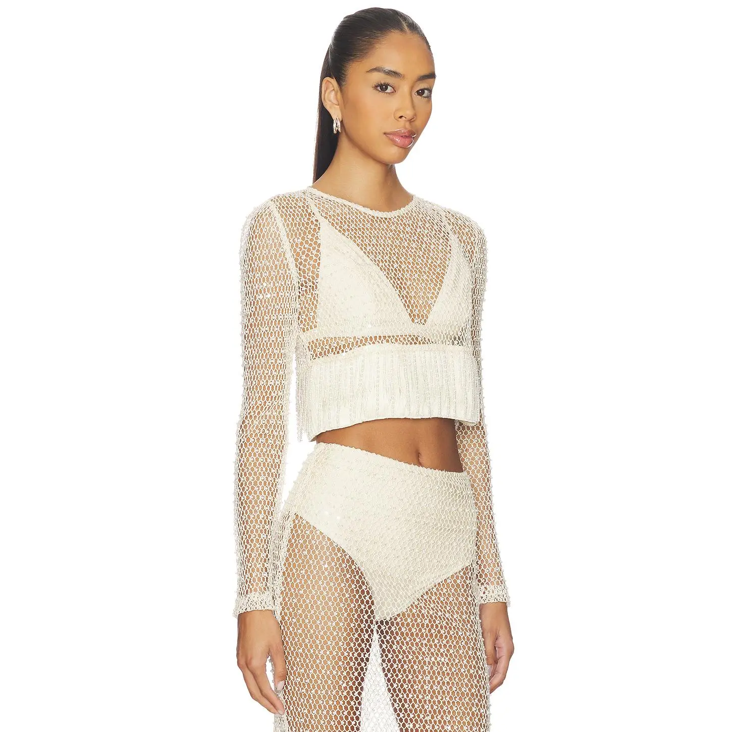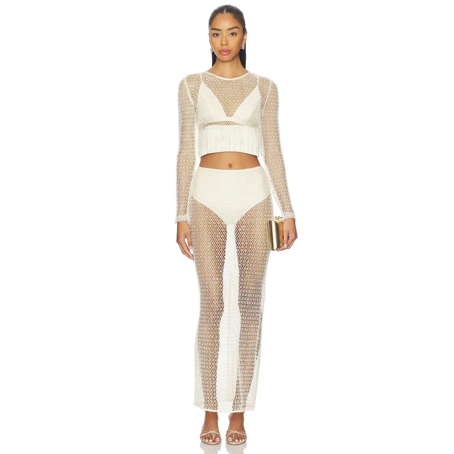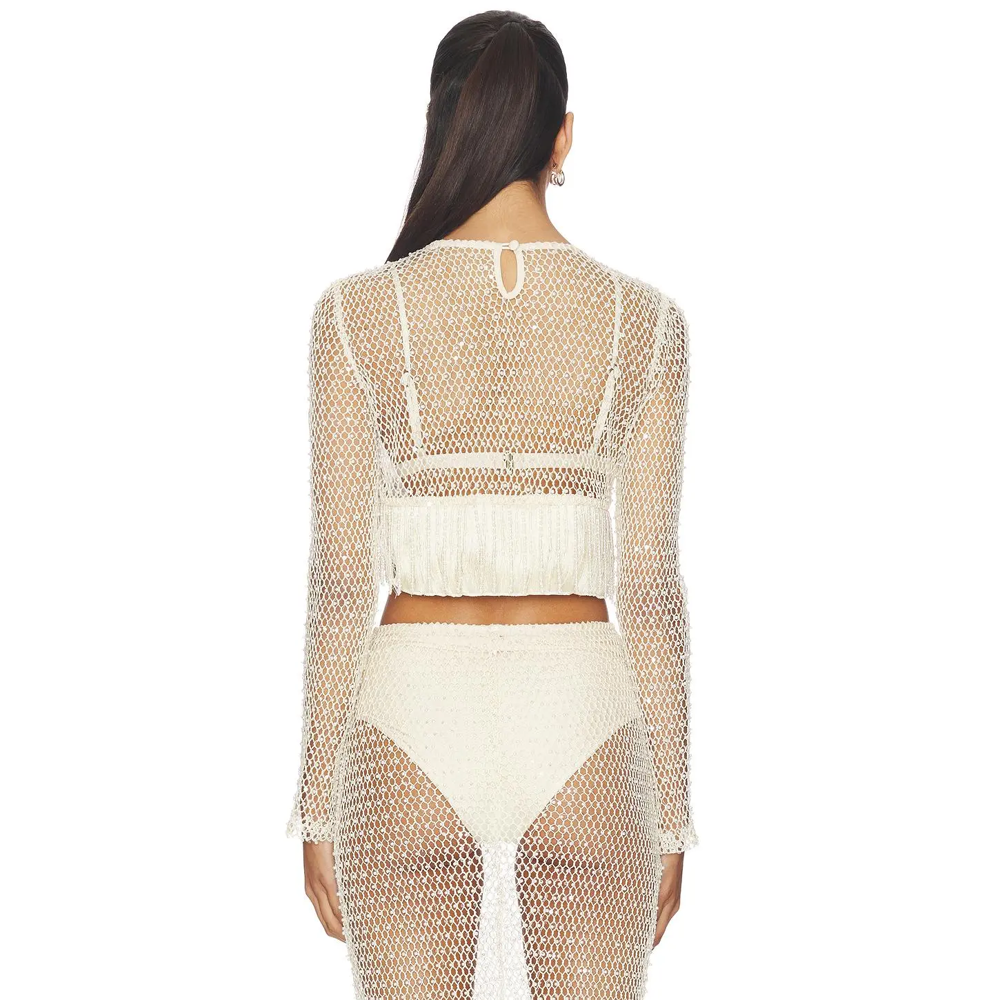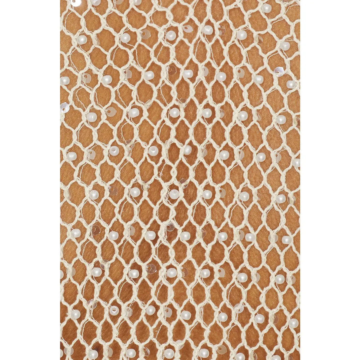 ·Lightweight crochet-knit fabric with faux pearl embellishments