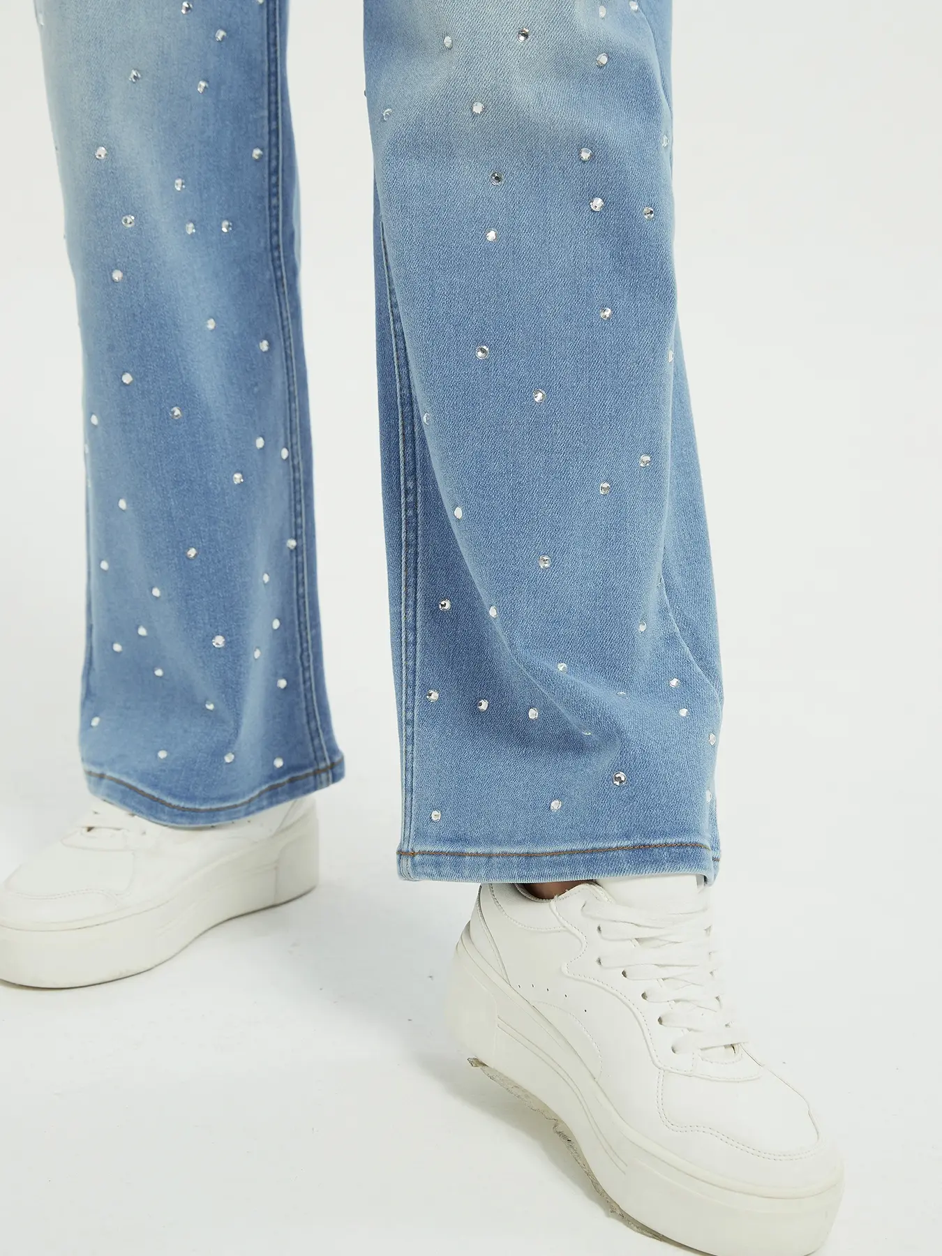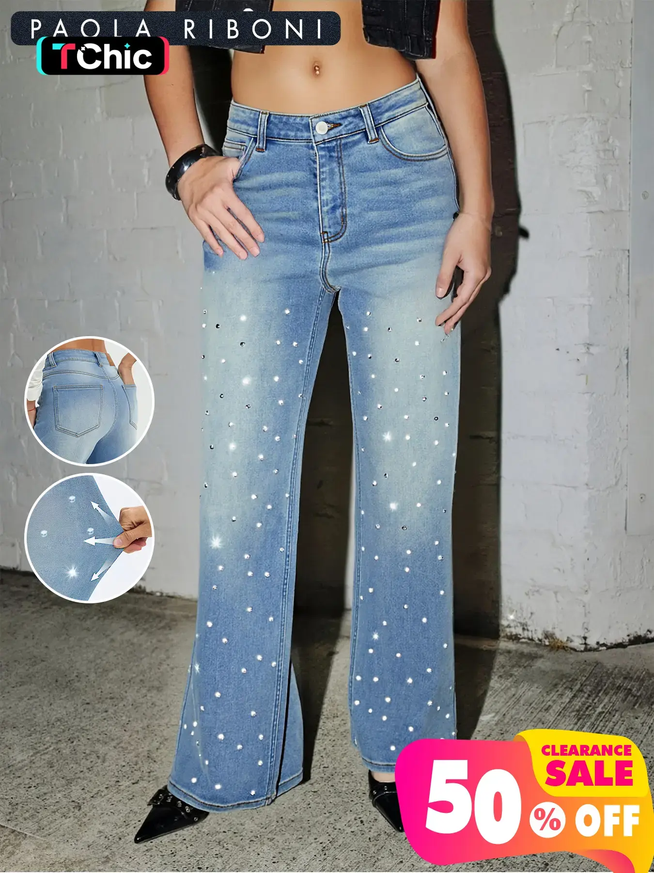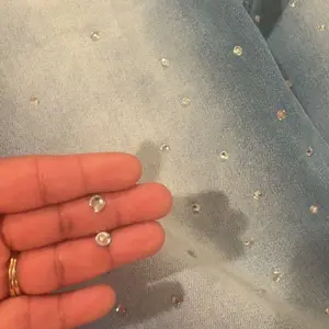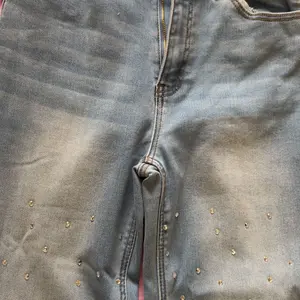 I love these high-waisted pants! The rhinestones don’t bother me at all, and they actually stay in place (none falling off 🙌). The fabric has a nice stretch, so they fit comfortably and move with you. Super flattering and perfect for all-day wear! ✨