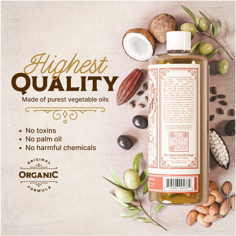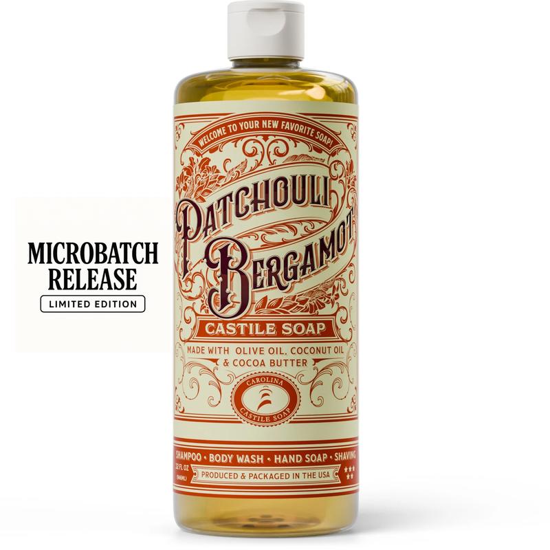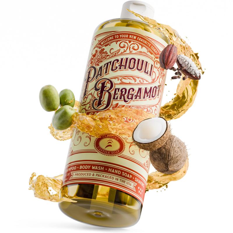 Patchouli Bergamot is an ode to balance — where earth meets light. The deep, resinous body of patchouli unfolds with warmth and quiet strength, softened by the bright, citrus spark of bergamot. Together, they create a scent that feels grounded yet radiant, mysterious yet clean. Luxuriously layered and endlessly wearable, it’s a fragrance that lingers like calm confidence — smooth, natural, and effortlessly refined. Crafted for sensitive skin, Carolina Castile Soap is a gentle, non-drying formula made with fair-trade cocoa butter, olive oil, coconut oil, and kukui nut oil – and none of the harsh, artificial detergent surfactants you’ll find in other soaps. Skin is thoroughly cleansed without dryness or irritation. Our soap is also made a bit more concentrated than the average Castile Soap, formulated with more soap solids and no synthetic thickeners like you’ll find in other liquid "soaps". That means your bottle lasts longer, foams up nicely, and gives you more bang for your buck. Made in the USA with natural plant oils, our Castile soap is manufactured with absolutely no animal testing, artificial dyes, synthetic colors, or foaming agents.