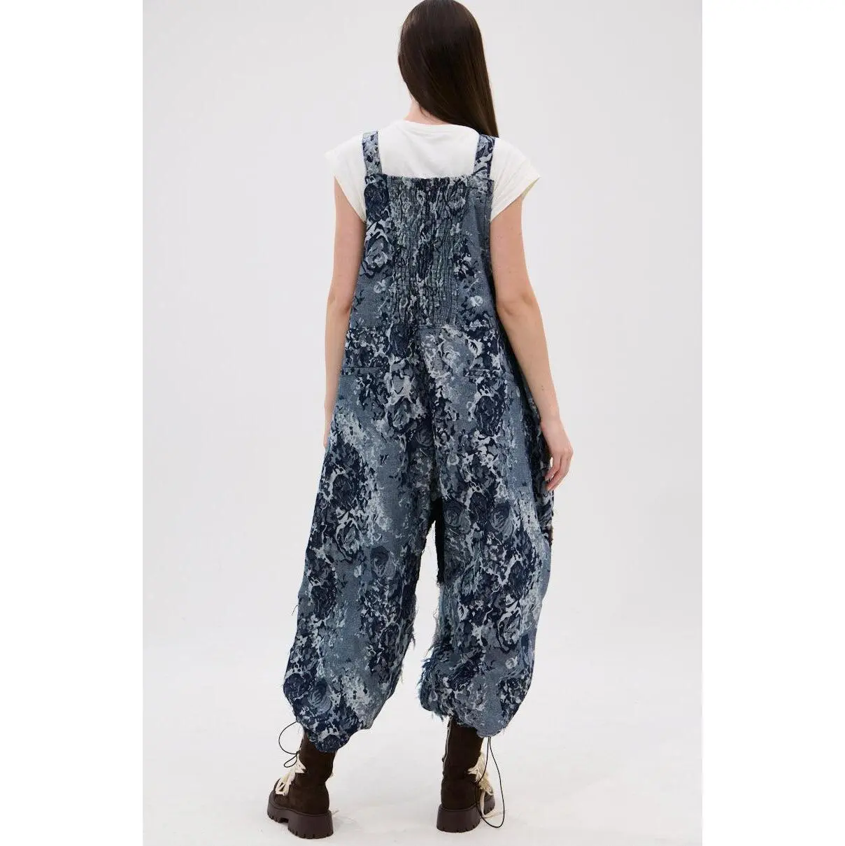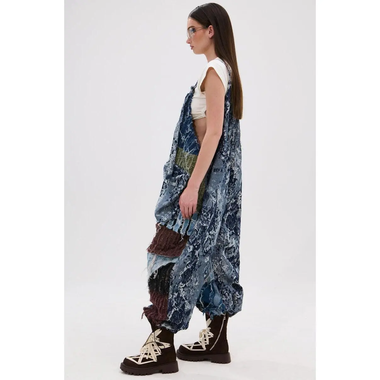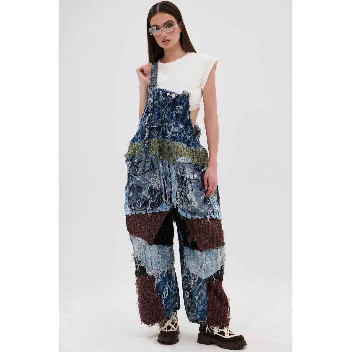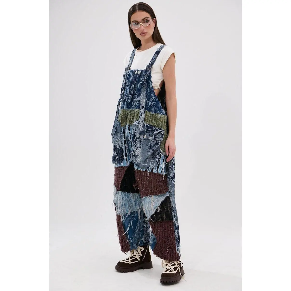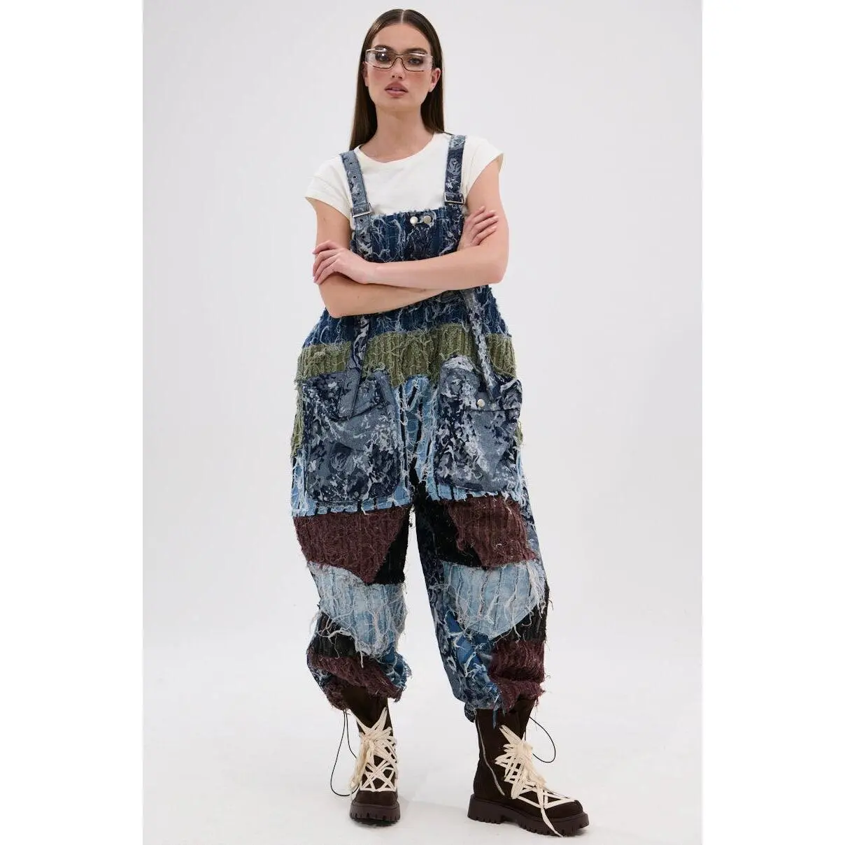 Distressed patchwork denim oversized overalls, perfect for everyday wear and statement streetwear styling. Crafted from a multi-tonal patchwork construction with raw-edged denim, textured knits, and distressed fabrics, these pants are designed with wide, adjustable bib straps, mock flap detailing on the bust, oversized cargo-style waist pockets, and an elasticized back panel. Complete with a loose, ultra-slouchy silhouette. Perfect for layering over fitted tops and long sleeve blouses.- 100% Cotton- No Stretch- Imported(all measurements approximate from size O/S)- 55” Shoulder to Hem- 30” Strap Length (adjustable)- 28” Inseam- Model is 5’9” and is wearing size O/SProduct ID: 1041350