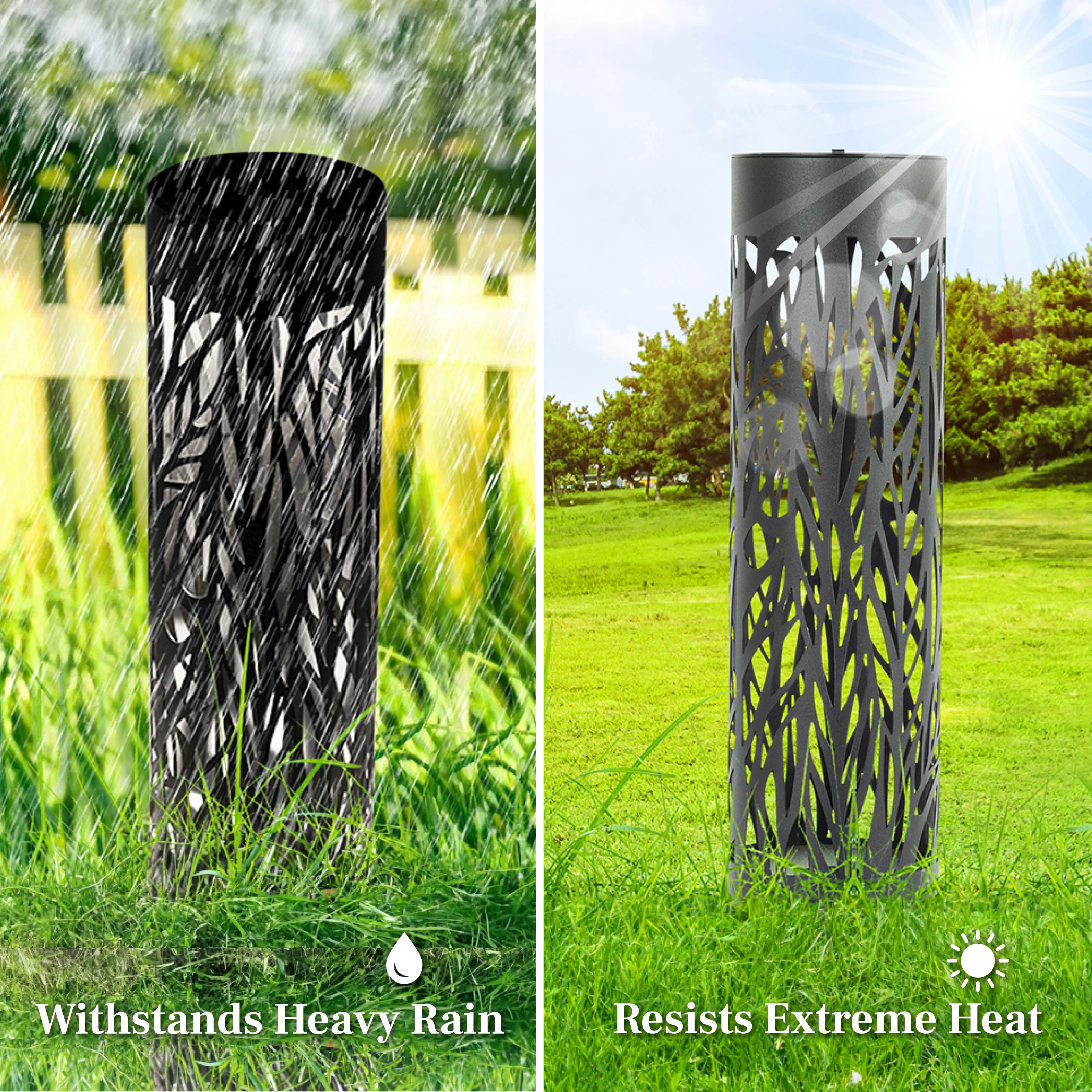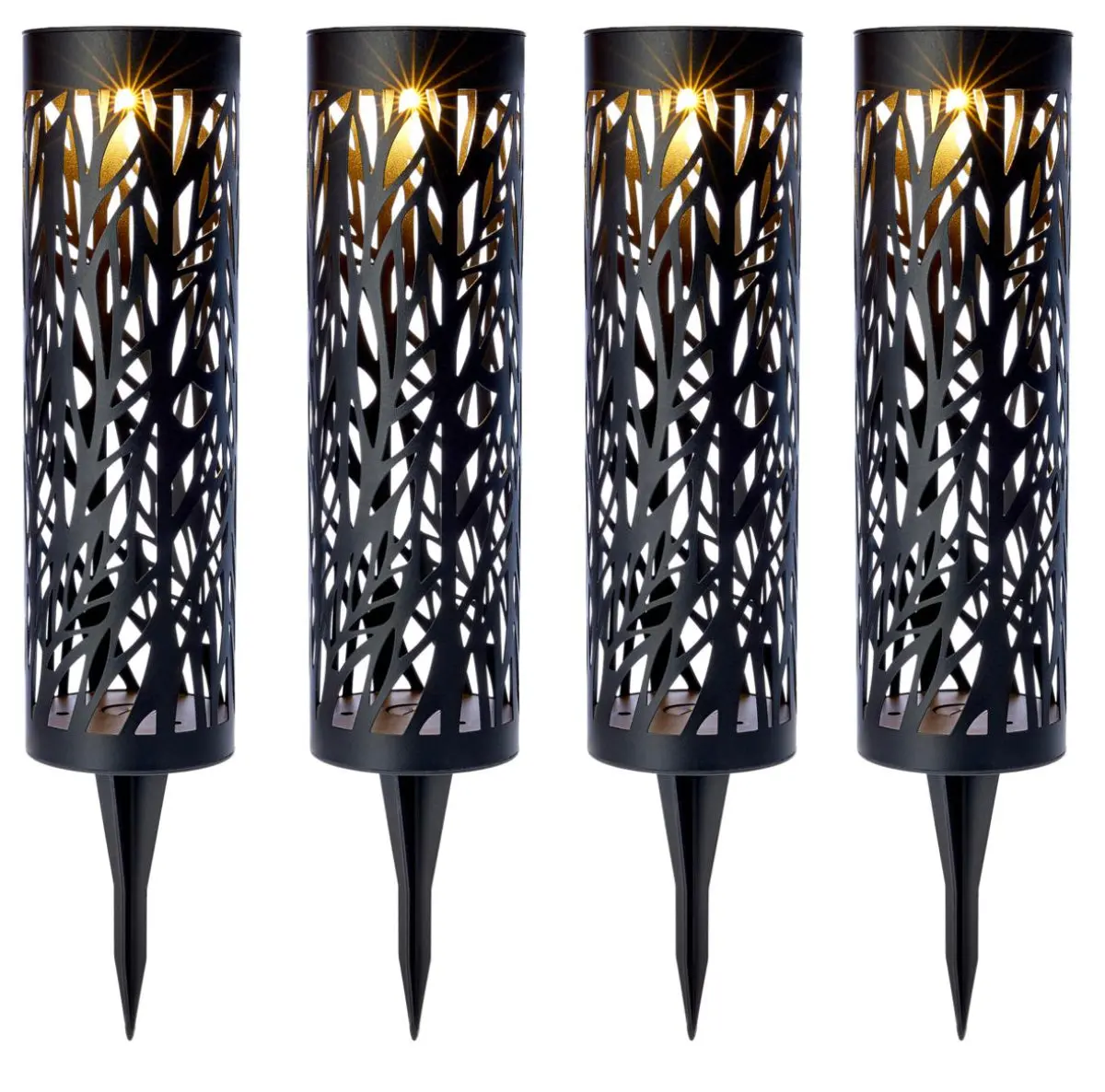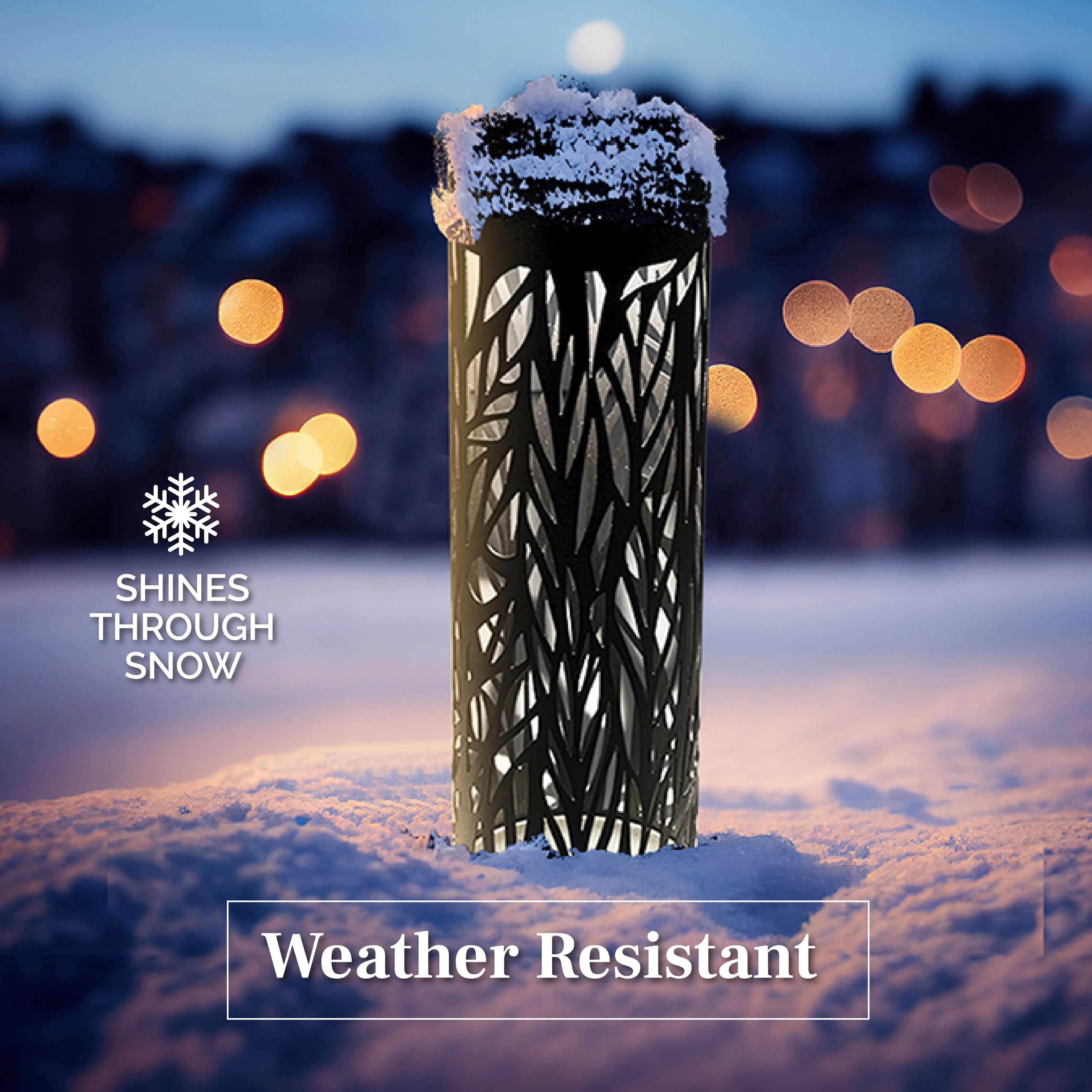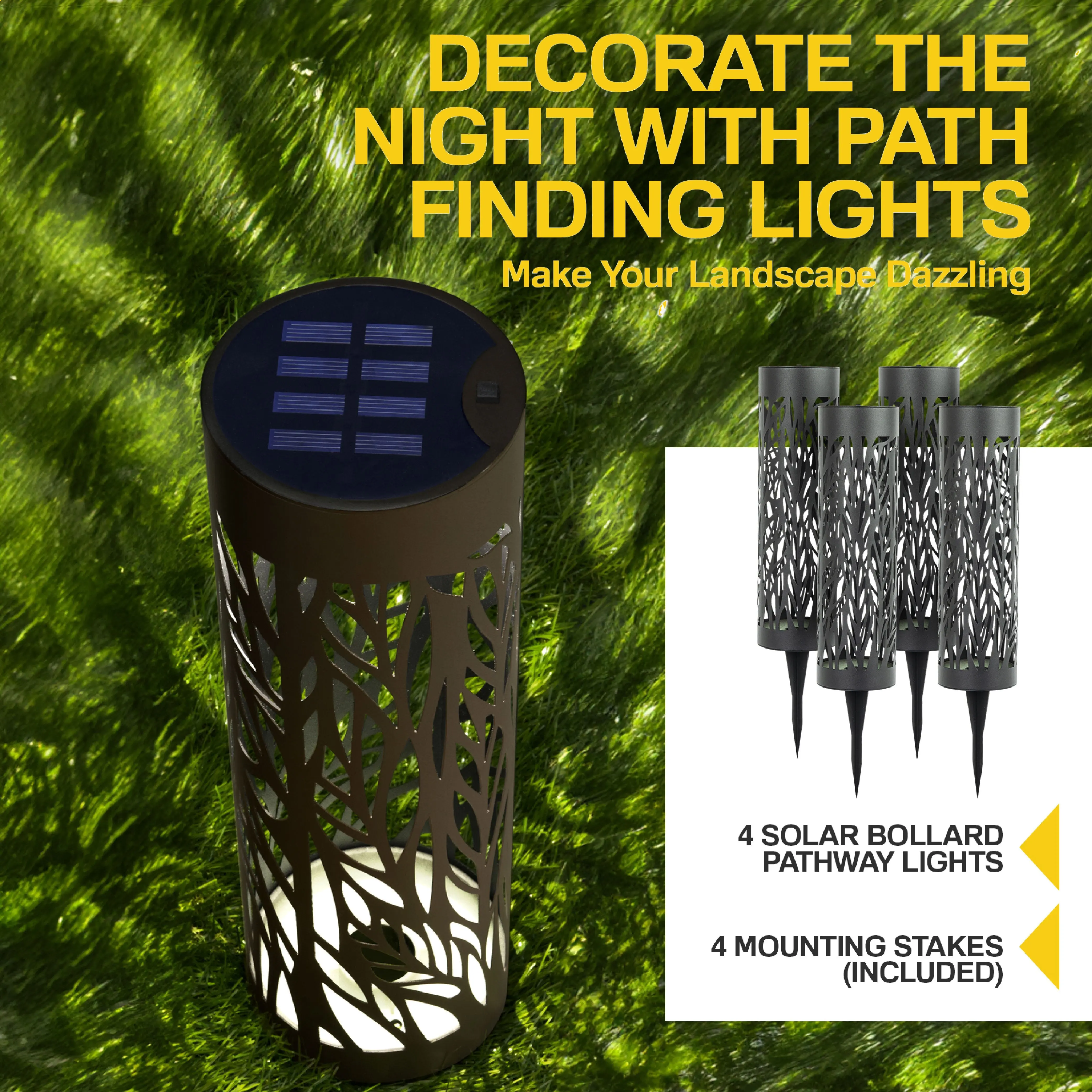 Illuminate your outdoor spaces with Bell+Howell Solar Bollard Pathway Lights, a convenient and eco-friendly lighting solution with LED technology. This 4-pack of metal solar-powered landscape lights with mounting stakes casts a nature-inspired leaf shadow pattern with a warm glow to brighten your pathways, gardens, driveways or pool areas. Built-in solar panels harness Sun light during the day and automatically illuminate your path at night, for up to 8-hours, without the need for wiring or electricity. These weather-resistant lights are suitable for year-round outdoor use. light-weight and portable, they can be easily moved to suit your lighting needs for any outdoor occasion. They're not just functional, they add a nice decorative touch that beautifies any outdoor space.