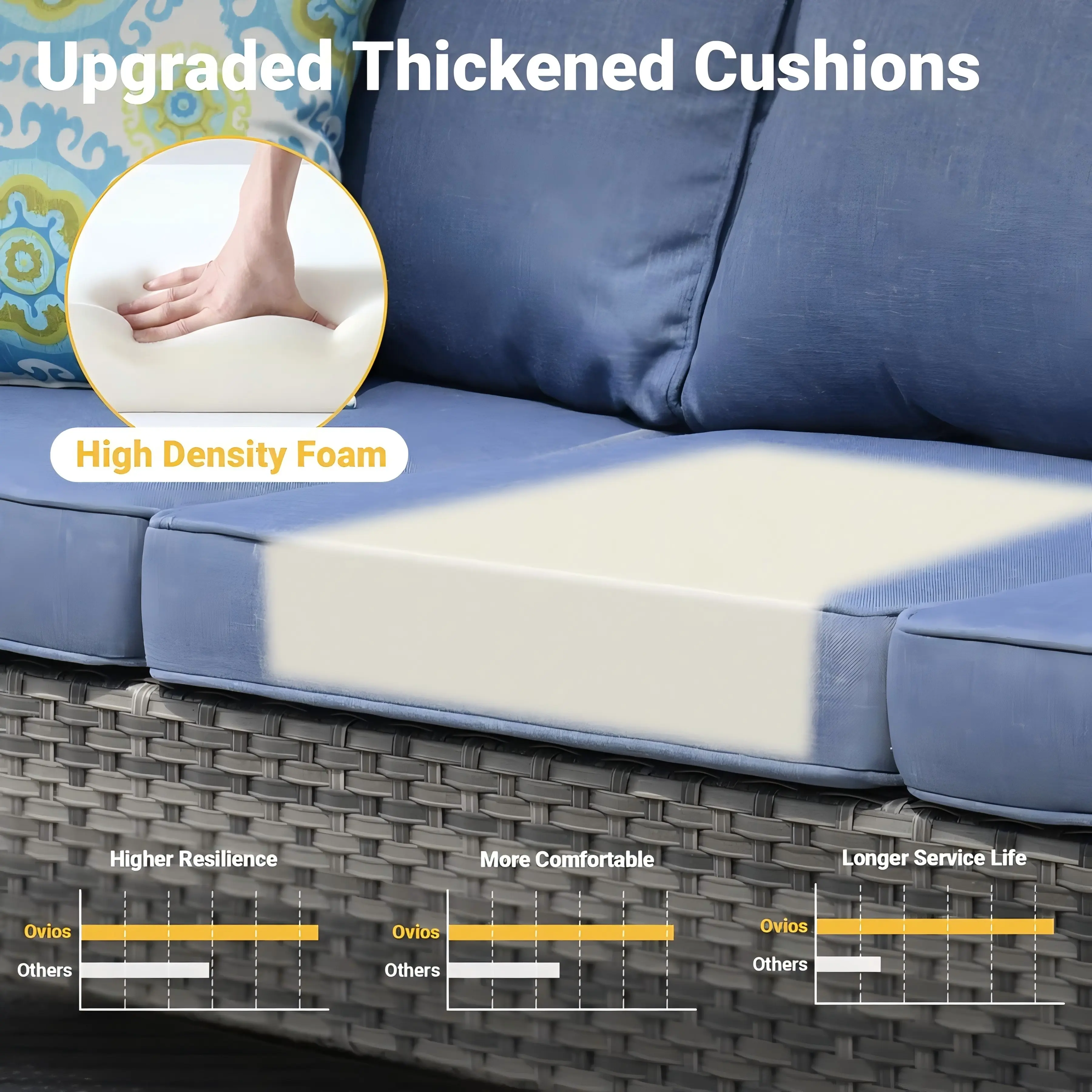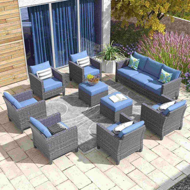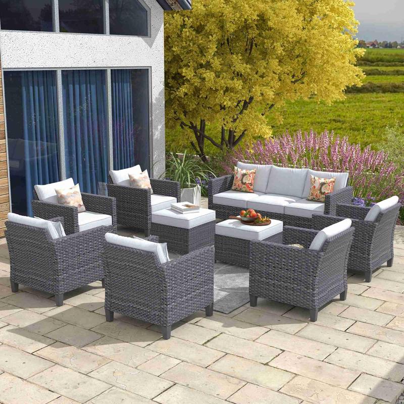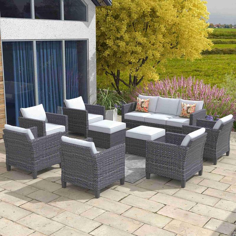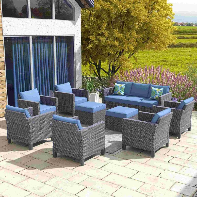 Seating Capacity 9 Weight capacity Chair 250 LBS, Couch 660 LBS Seating Inner Frame Material Steel Frame Seating Outer Frame Material PE Wicker Wicker Durability Water Resistant; UV Resistant Cushions Included Yes Number of Cushions Included 20 Cushion Durability Water Resistant; UV Resistant Cushion Thickness 3.54" Cushion Attachment Type No Direct Attachment Method Removable Cushion Cover Yes Cushion Cover Closure Method Zipper Cushion Fill Material Foam/Cotton Cushion Cover Material Fabric