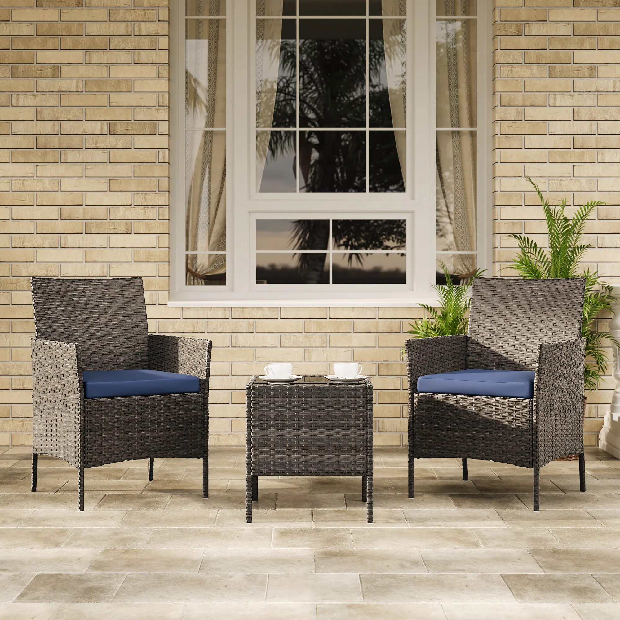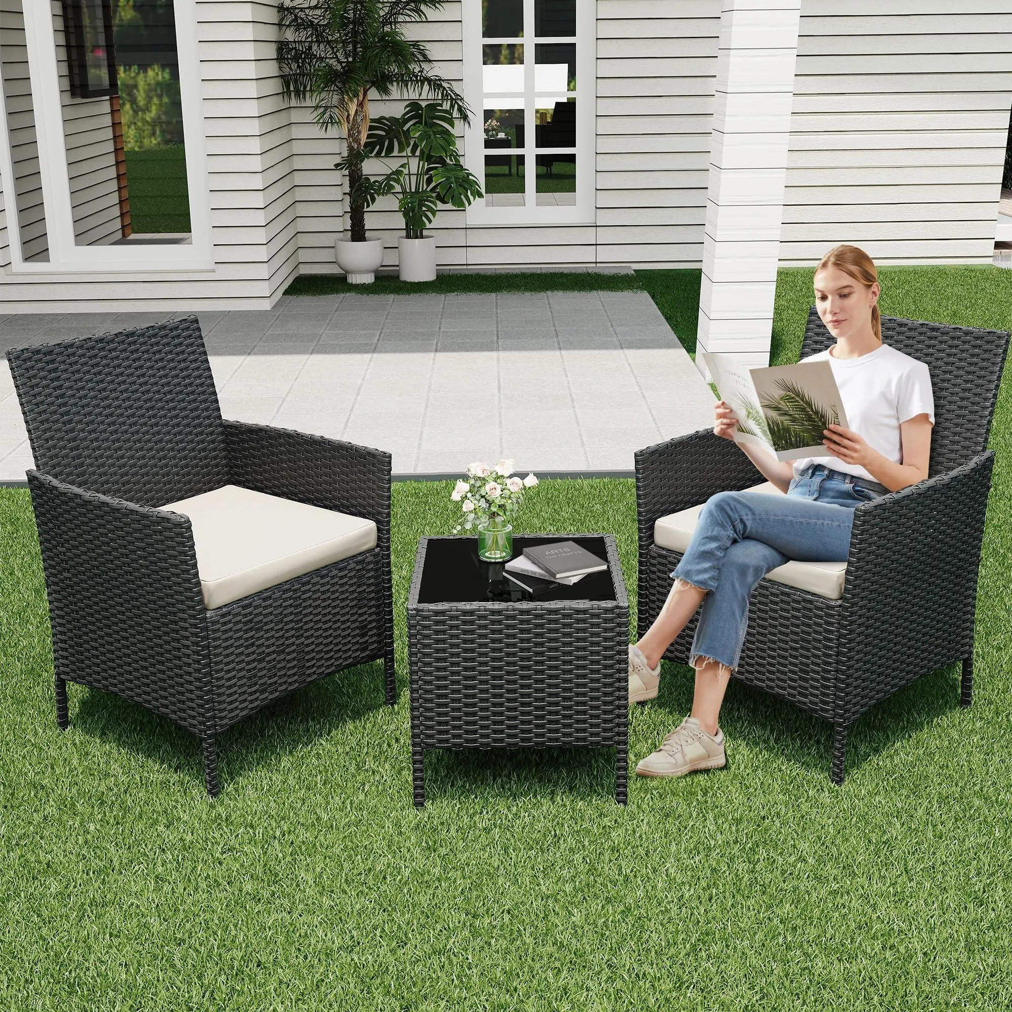 【Versatile Use】This 3-piece patio conversation sets includes 2 single chairs and a glass coffee table, Lightweight and versatile, this set seamlessly transitions from outdoor spaces to indoor living rooms. Perfect for any outdoor/indoor space, including patios, porches, backyards, balconies, and gardens,complementing various decor styles with its neutral woven texture and tempered glass table top.