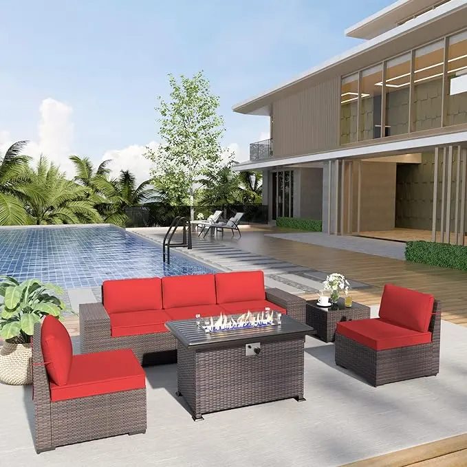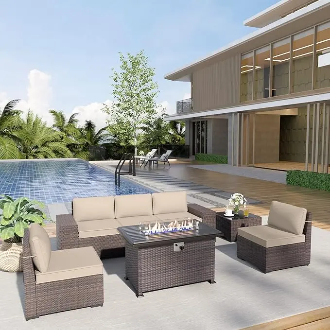 ·PATIO FURNITURE SET: 7-piece wicker patio furniture set is easy to install and made of high-quality synthetic handmade rattan. The set includes 2 middle sofas, 2 armrest sofas with cushions, 1 corner sofa, 1 fire pit table, and 1 tempered glass coffee table. And all necessary tools and detailed instructions are in the box