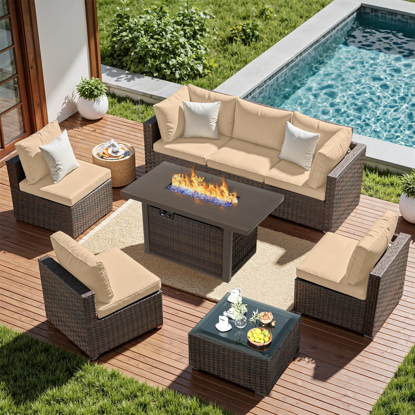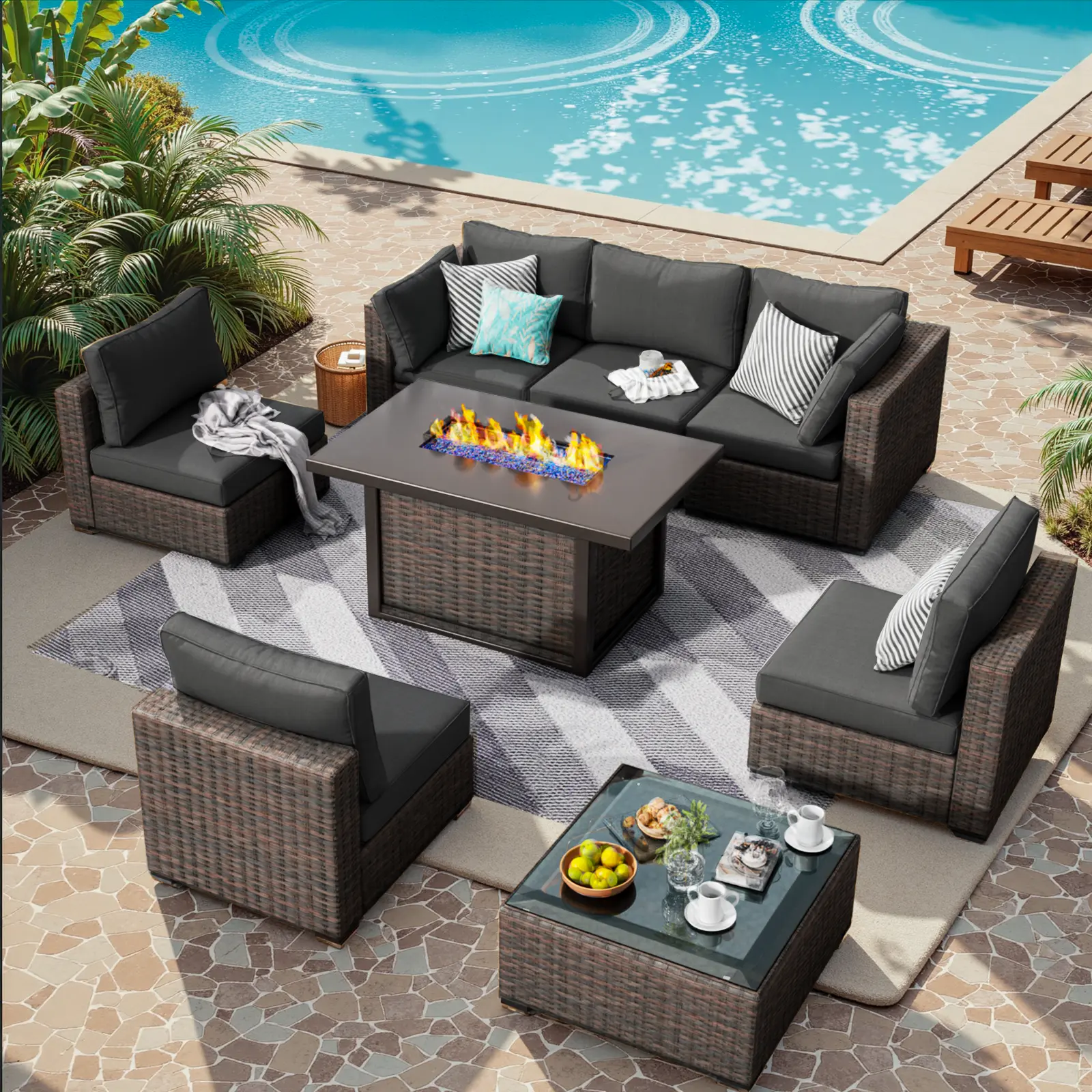 ·8 PIECES PATIO FURNITURE SET: 4 x armless sofa, 2 x corner sofa, 1 x fire pit table, 1 x glass table. You can assemble the patio seating furniture freely according to your needs and create a variety of layouts to meet different space requirements.
