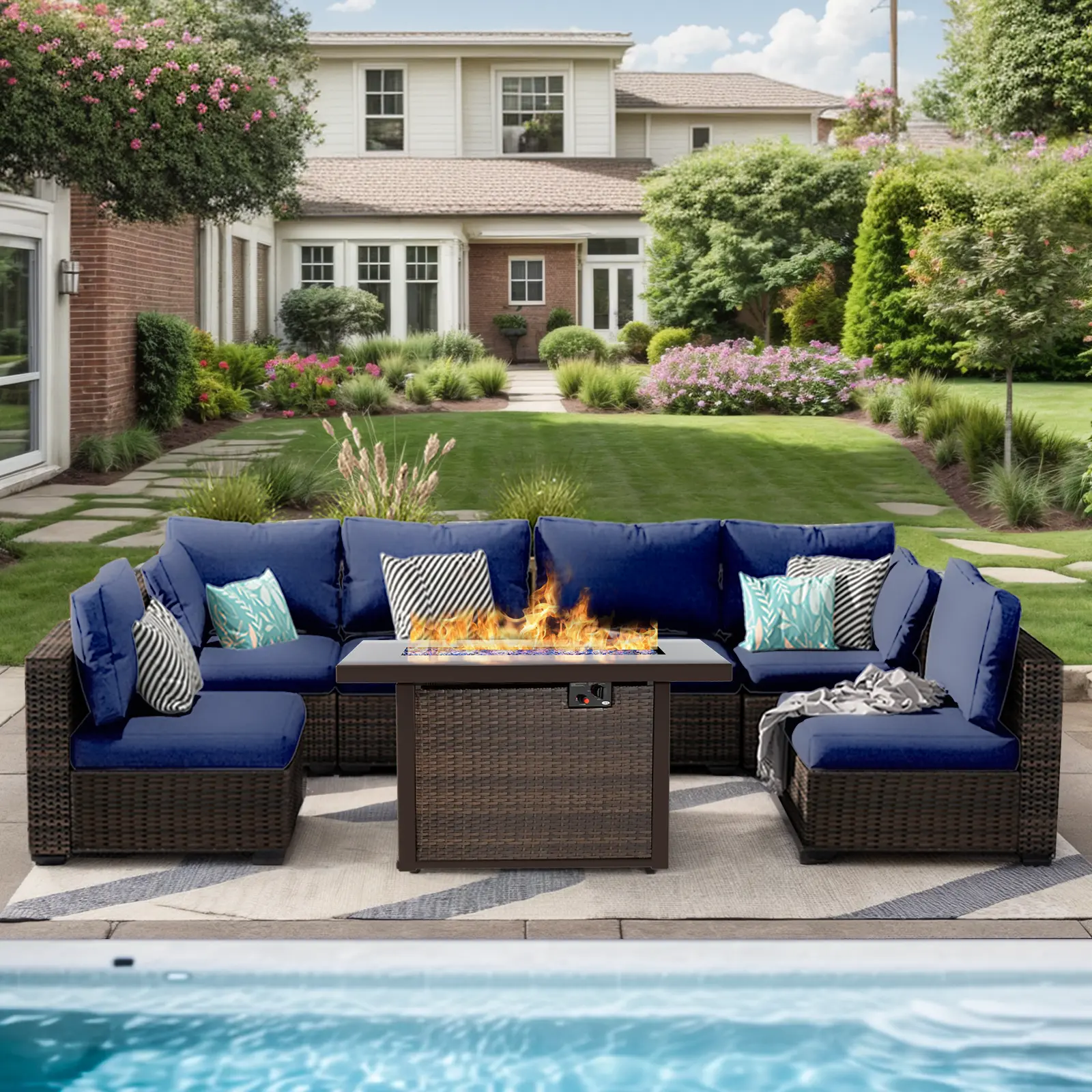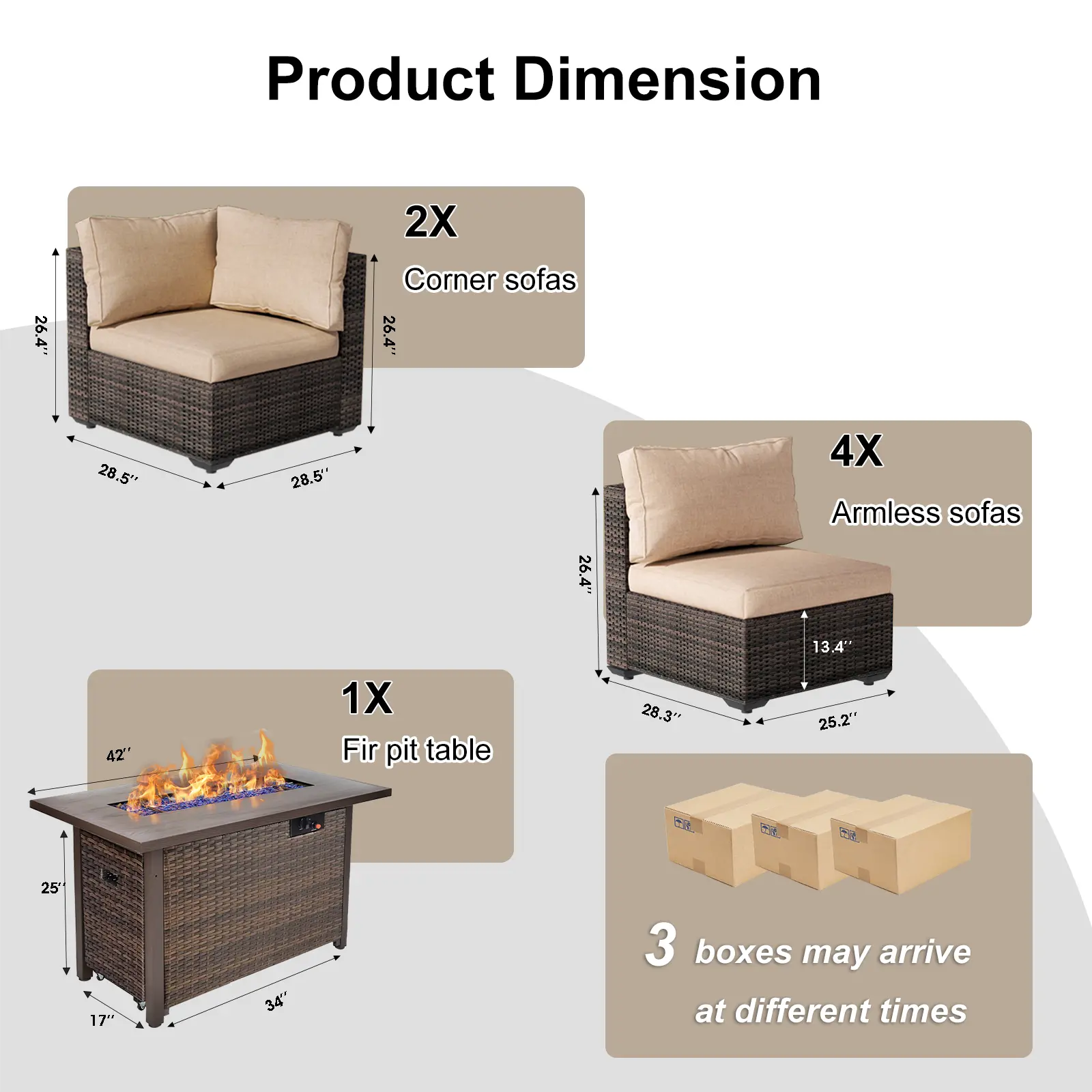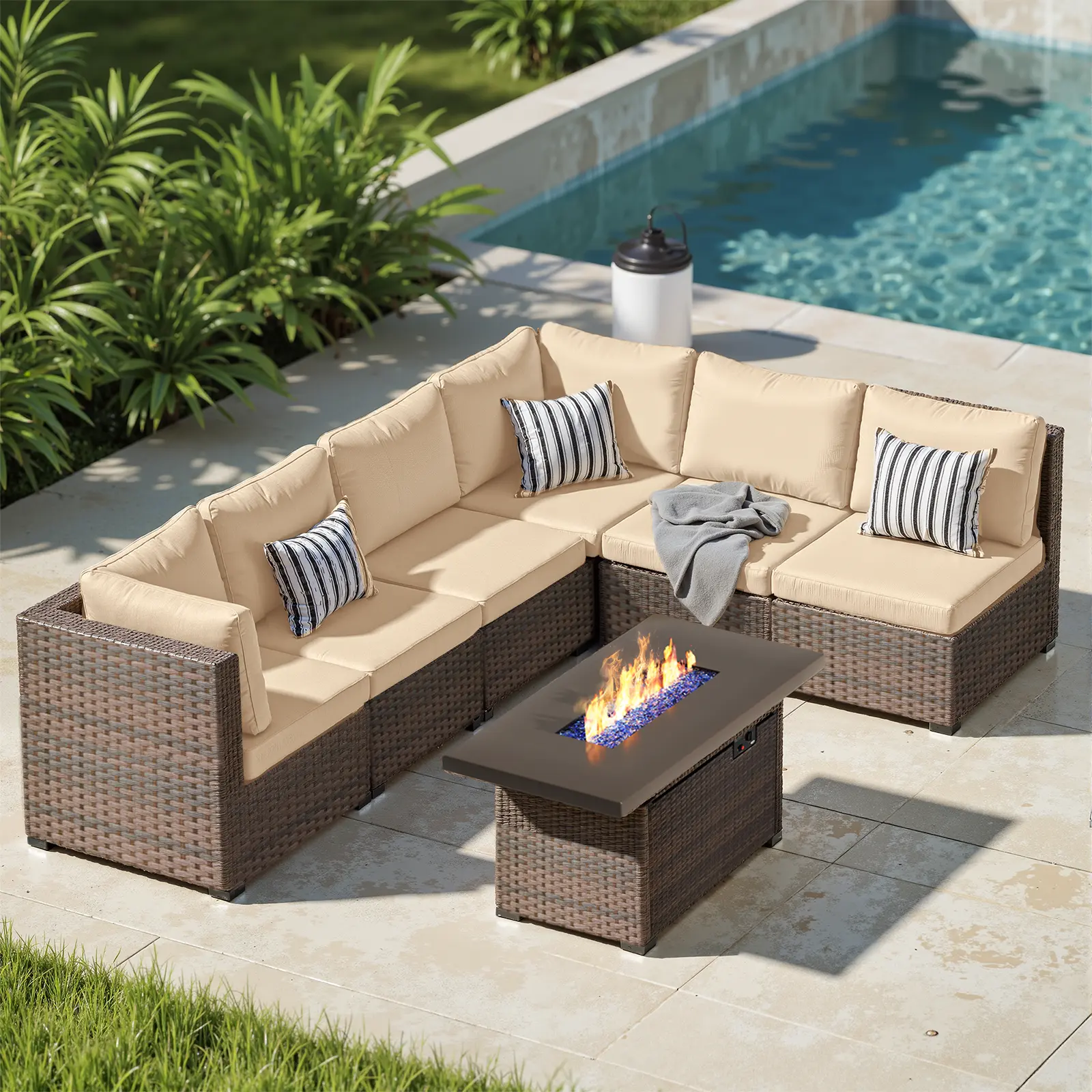 ·7 PIECES PATIO FURNITURE SET: 2 x corner sofa, 4 x armless sofa, 1 x fire pit table. You can assemble the patio furniture freely according to your needs and create a variety of layouts to meet different space requirements.