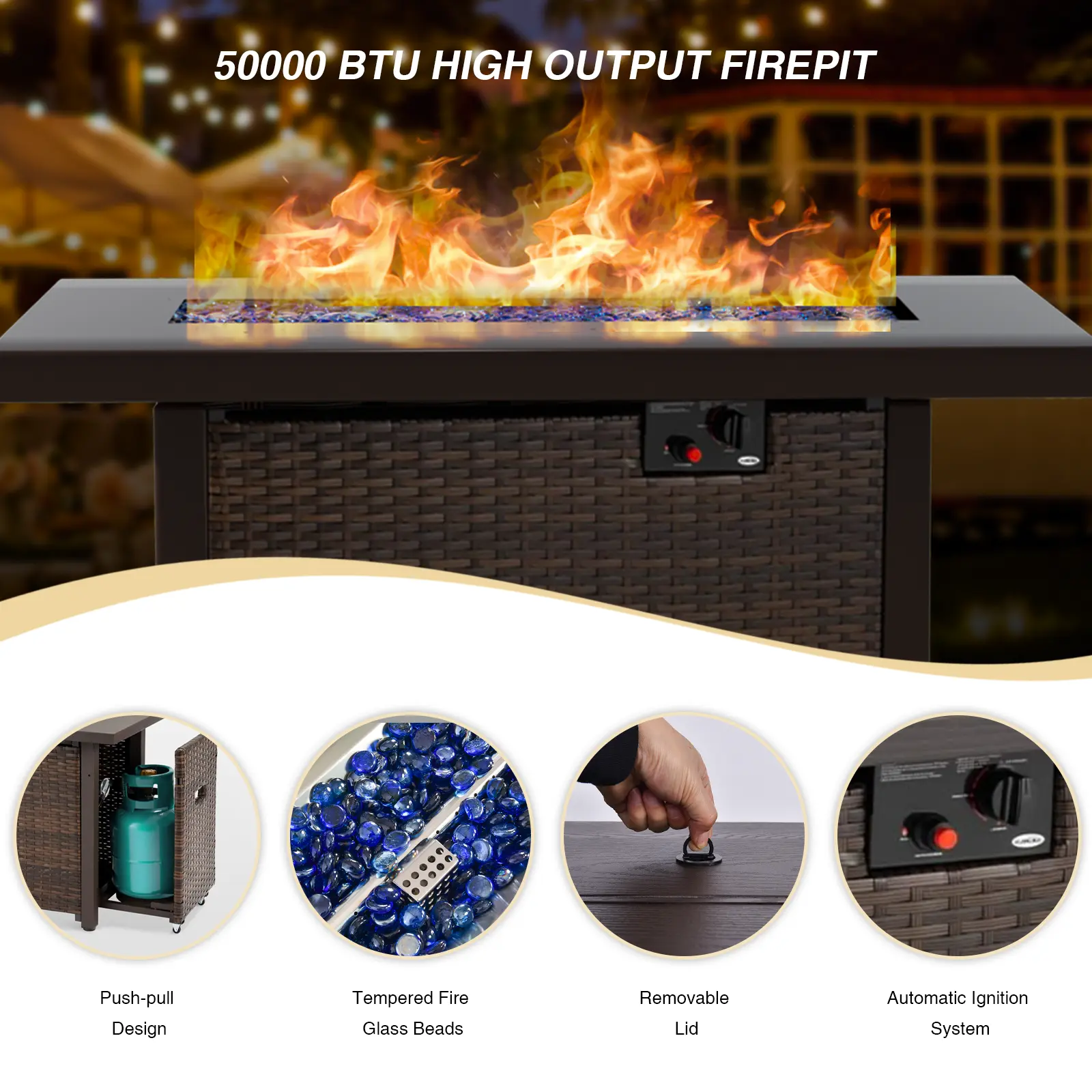 ·PROPANE FIRE PIT TABLE: 42" L x 24" W x 25" H. CSA certification, and it complies with all applicable U.S. standards to ensure compliance and safe use. This propane fire pit table’s heat output is 50,000 BTU, which provides you with great warmth(8-10people). It has a bonus dust cover that allows your fire pit to withstand the elements when not in use.