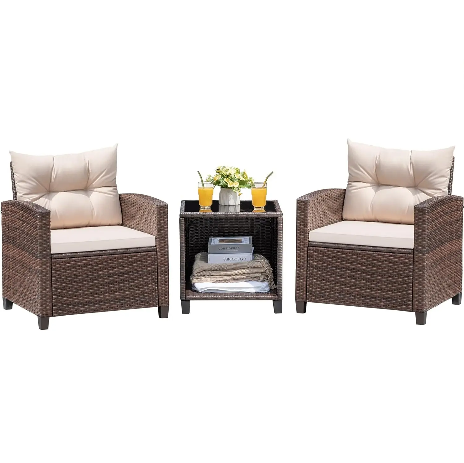 Upgrade your outdoor space with HOMALL’s 3-piece furniture set, featuring widened wicker chairs, spacious seating, and wider armrests for ultimate comfort and stability, perfect for relaxing with family in the breeze. Features: 1.Wider and larger chairs not only bring more seating, but also make the chairs sturdier. 2.Compared to other patio chairs that only come with a cushion, we also have a back cushion for added comfort. 3.The table is designed with double shelves. In addition to the table top for fruits and drinks, the built-in space has a lot of room for storage. 4.The rattan is all hand-woven by workers with a smooth, flat surface and tight arrangement. 5.The back of the chair's seat features a cross-reinforced seat to increase the seat's load-bearing capacity. Specification: Frame material: Steel and PE rattan Chair size: 26.8 x 25.2 x 29.5 inches (L x W x H) Table Size:19.9 x 19.7 x 19.9inches(L x W x H) Weight capacity: 300 lbs Include: 1 table, 2 chairs, 4 cushions, tools and instruction