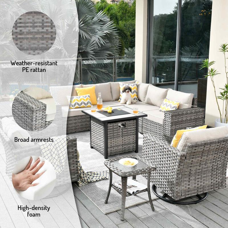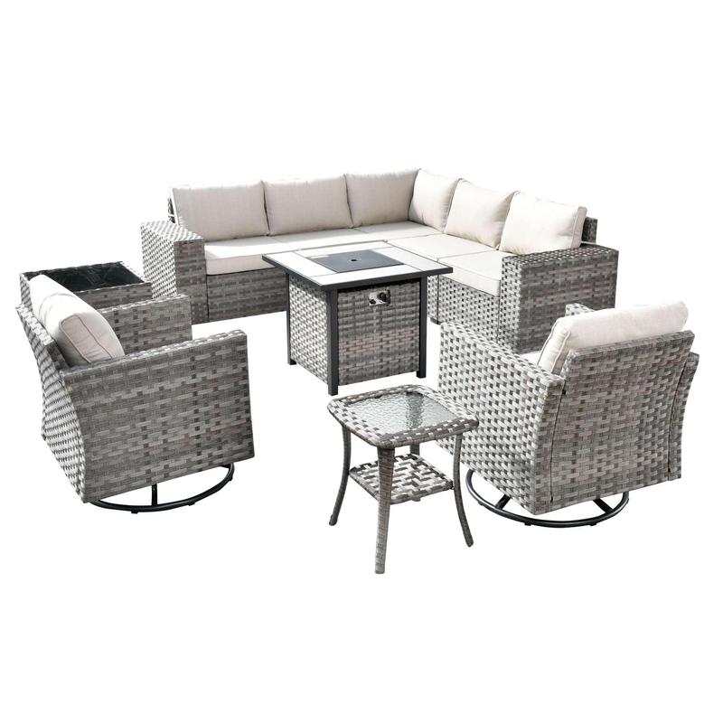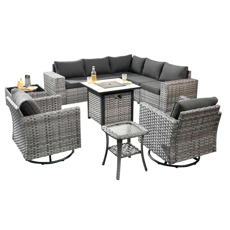 Packing 5 Packages Corner Sofa 1 Unit Middle Sofa 2 Unit Left Arm Sofa 1 Unit Right Arm Sofa 1 Unit Coffee Table 1 Unit Swivel Chair 2 Unit Side Table 1 Unit Fire Pit Table 1 Unit