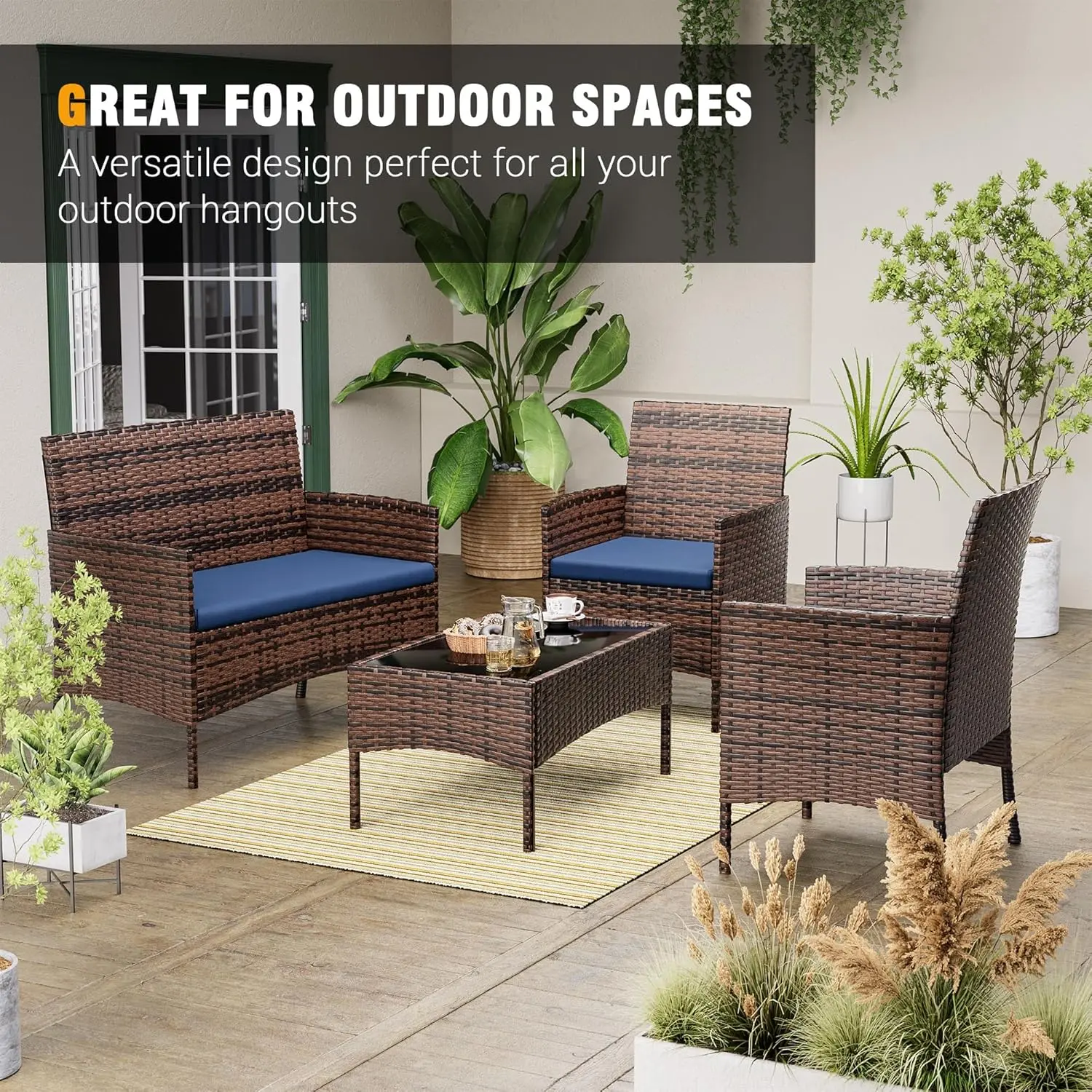 ✨ The 4-piece patio furniture set is easily movable, ideal for creating a relaxing coffee corner on your front porch or patio. With comfortable seating and a stylish design, this set is a great value for limited outdoor spaces. Enjoy your leisure time with family and friends in various settings like the deck, backyard, or balcony.