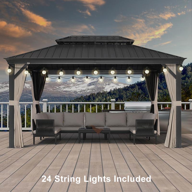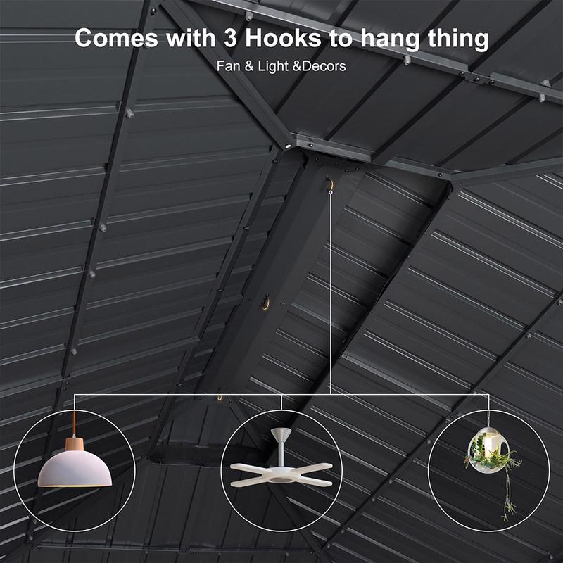 ·【Ceiling Hooks】Comes with built-in, high-quality, sturdy ceiling hooks designed to easily hang your favorite chandelier or other decorative items. Outdoor gazebo can easily be transformed into a comfortable and light-filled gathering place to spend precious time with family and friends.