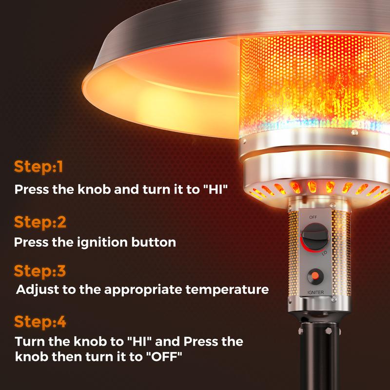 ·Built-In Safety Features – The sleek cone-shaped design isn’t just for looks—it improves stability and wind resistance. If the patio heater is overturned, the heater will automatically shut off to ensure you can use it without worry, and the flame-out protection ensures peace of mind.