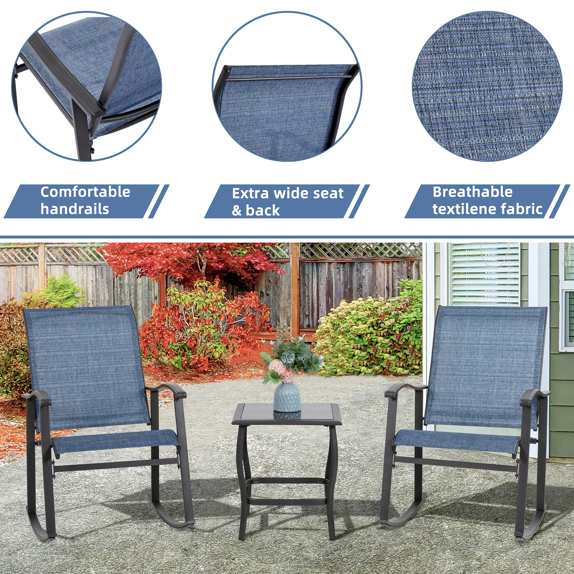 Sturdy & Durable: The sturdy metal frame provides excellent support and balance for the rocking chairs, ensuring stability. With a modern design and comfortable seating made of breathable textile fabric, these chairs are cozy enough for all-day use—perfect for you and your family to enjoy relaxing moments.