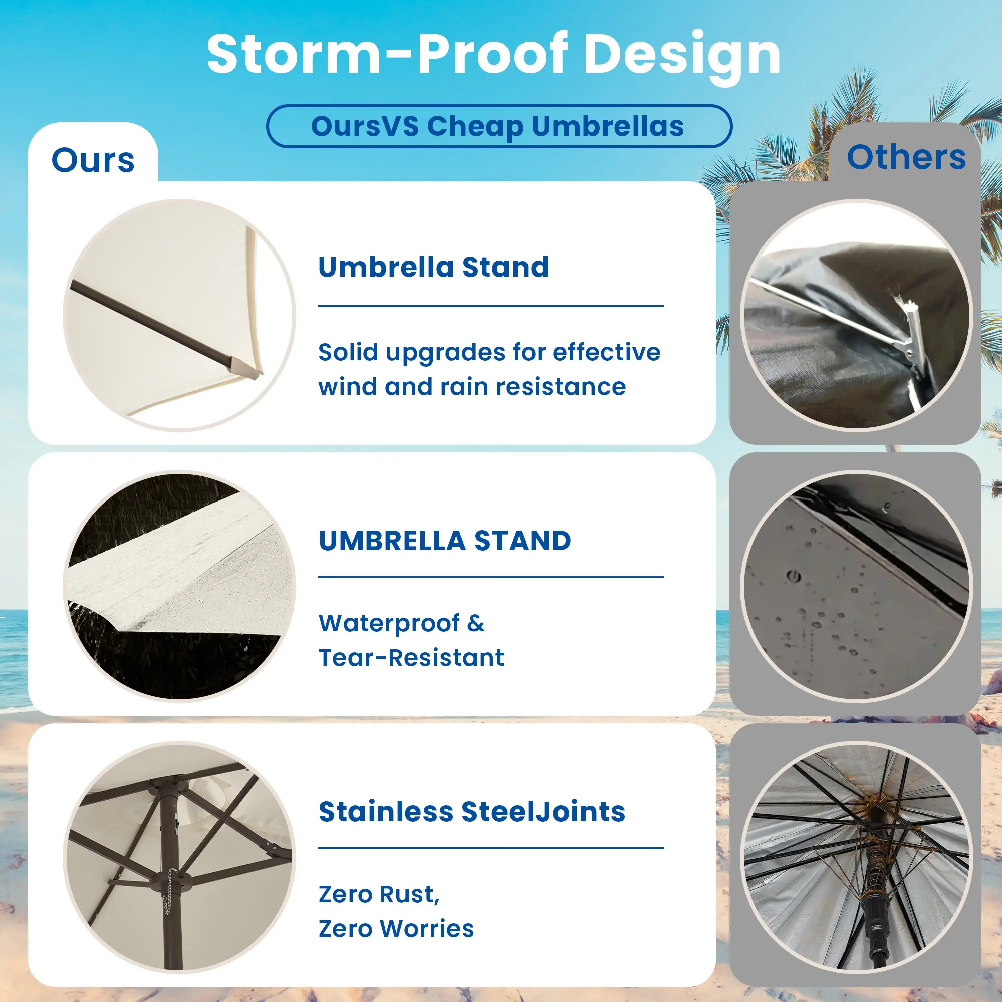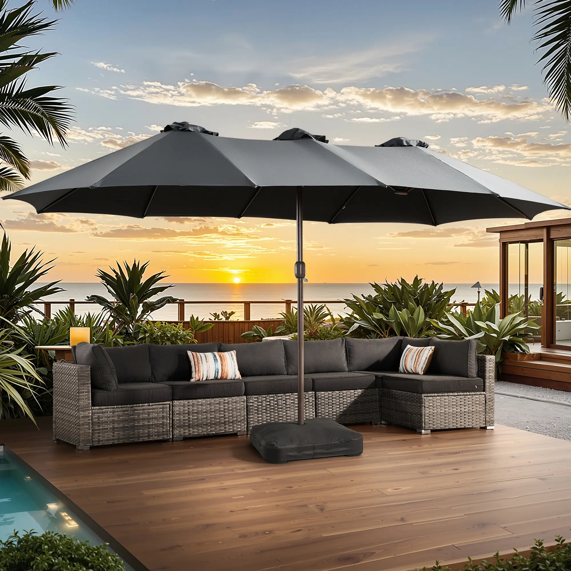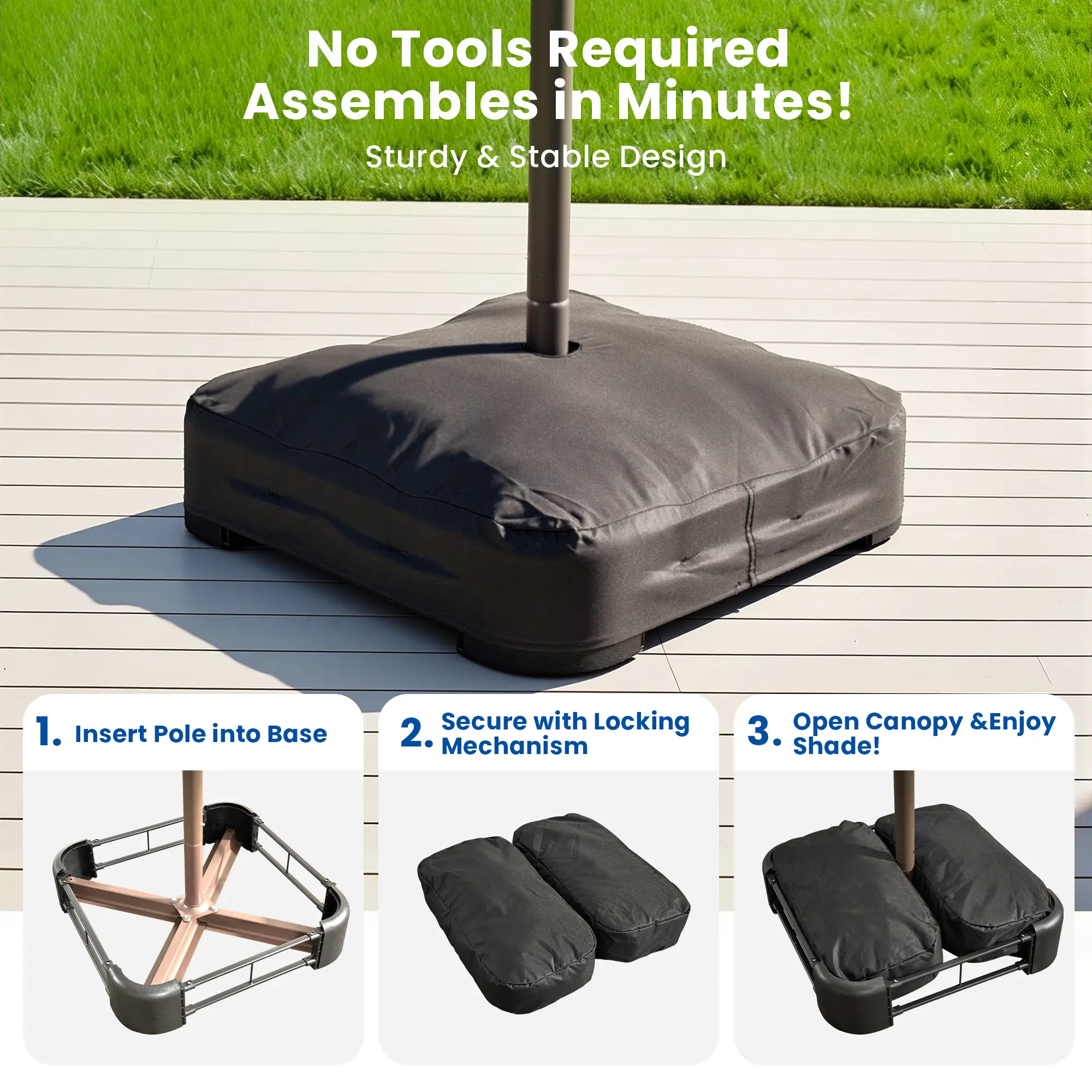 Omg. Ordered my umbrella last week. It arrived within 3 to 5 days. Put it together today & boy am I impressed. The quality is unbelievable. Excited for it to get dark to see what it looks like with the solar lights. In the pics I hadn’t added the sandbags & put the cover on the base.