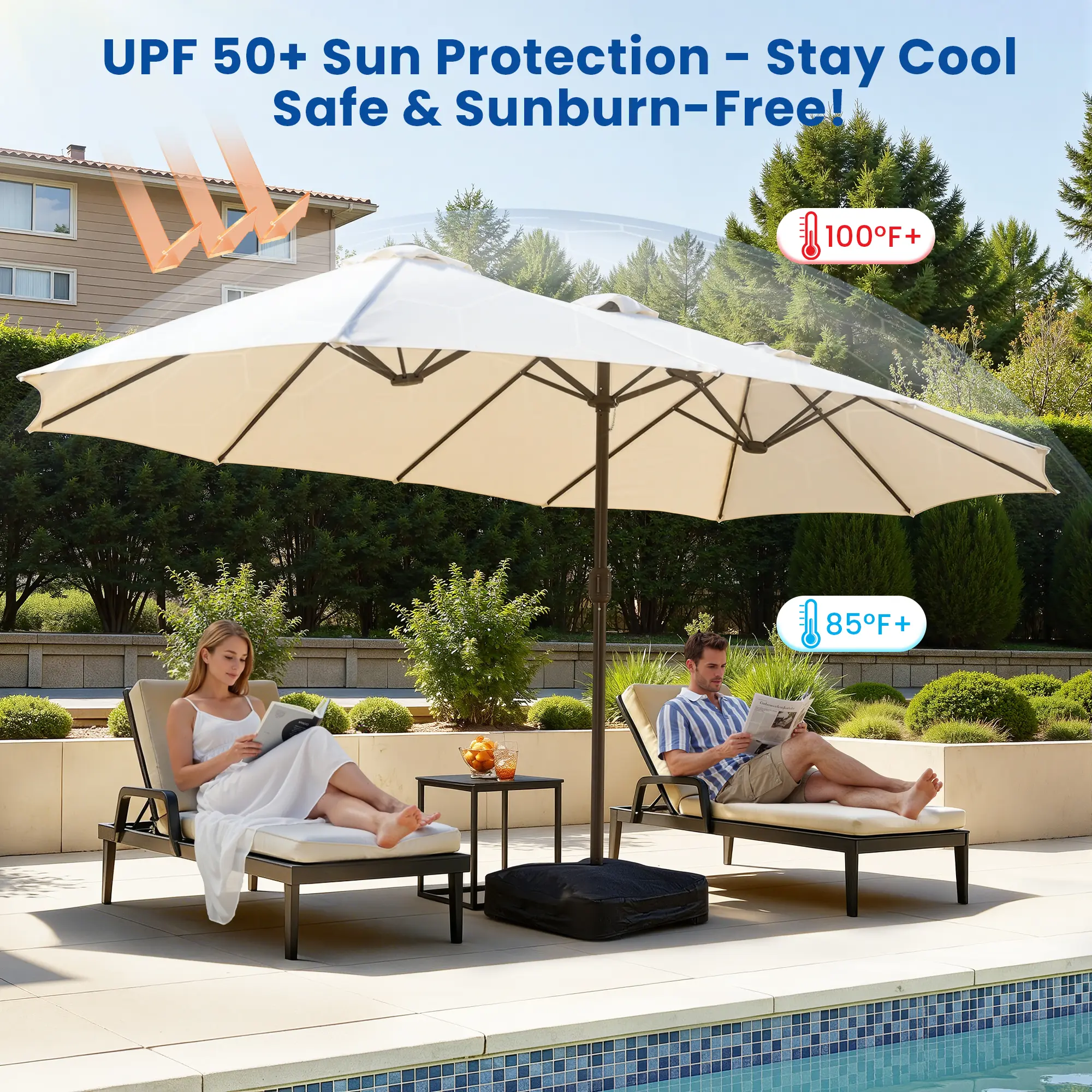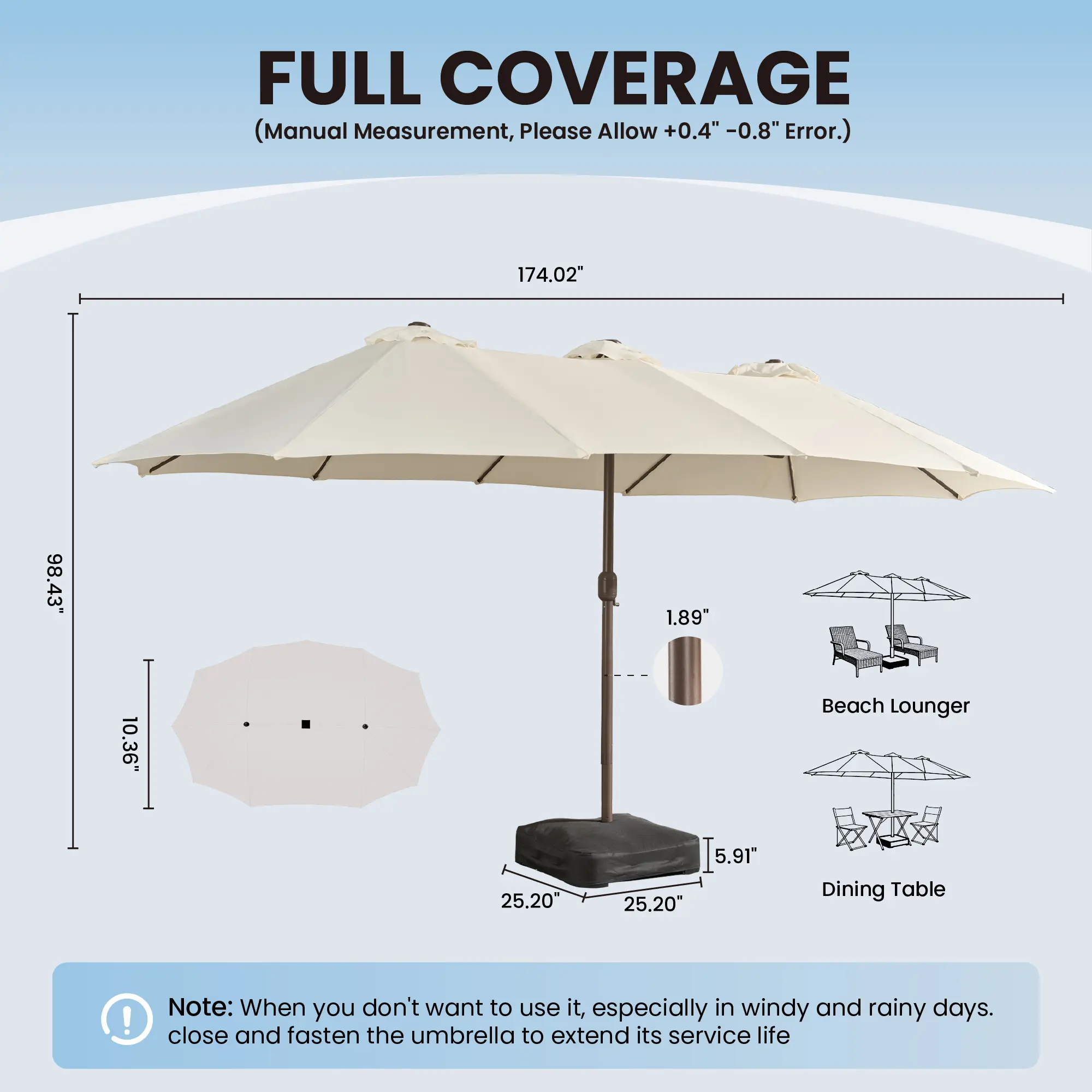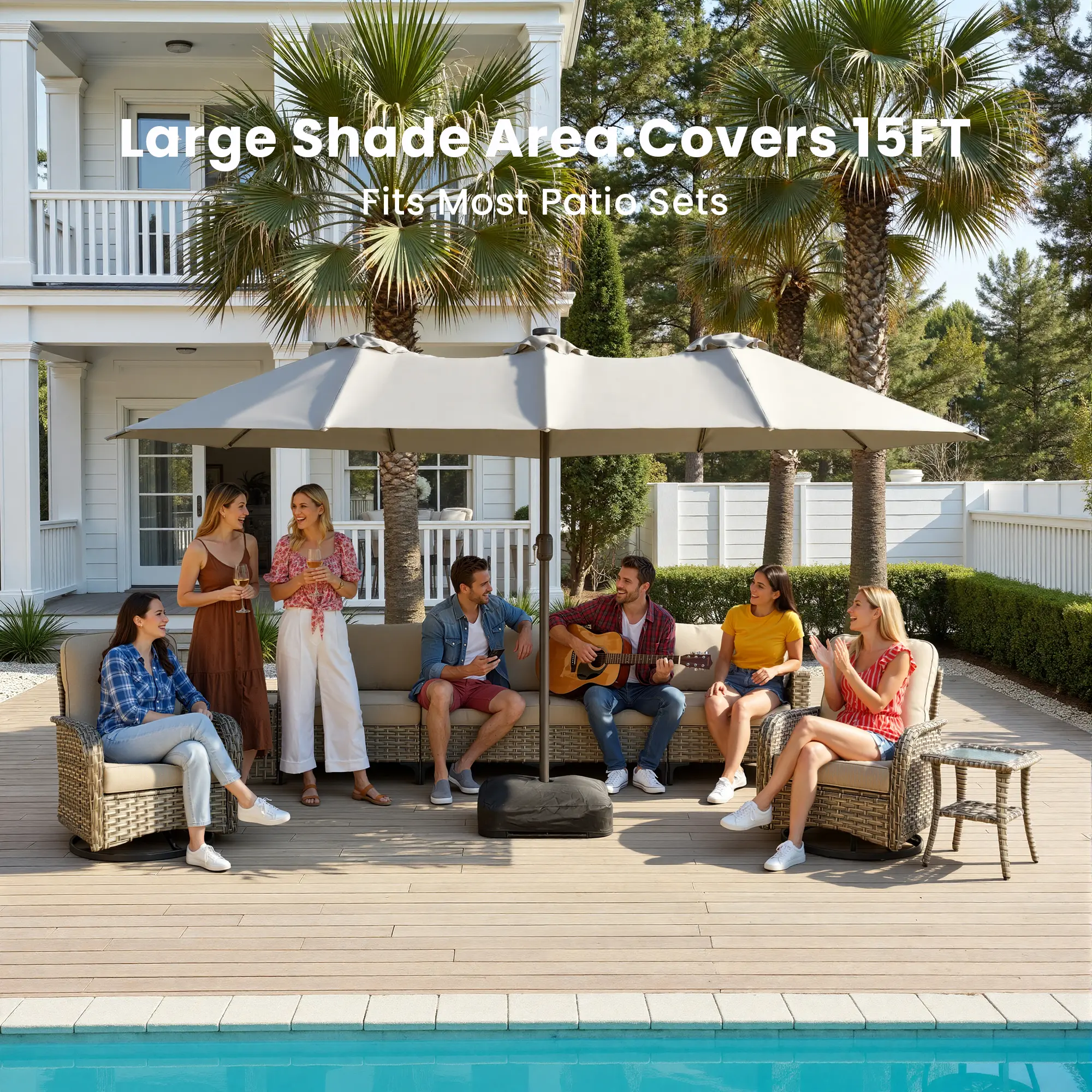 I thought the price for an umbrella this size was too good to be true. I was wrong. It is perfect! It covers half our patio so we can dine and lounge under one umbrella. Great quality fabric! I didn’t get the lighted umbrella and now I wish I did!! This is an awesome buy. You will not regret it!