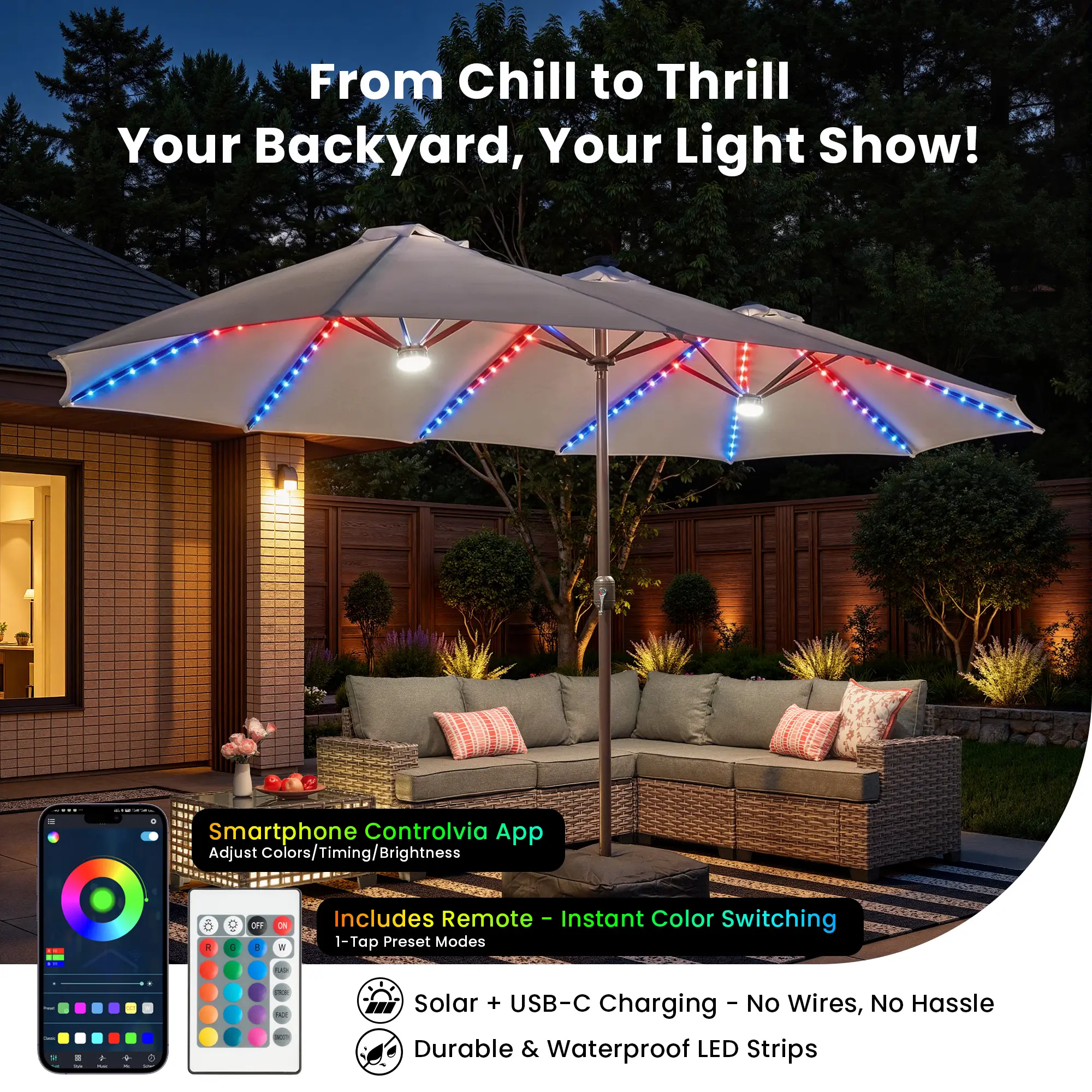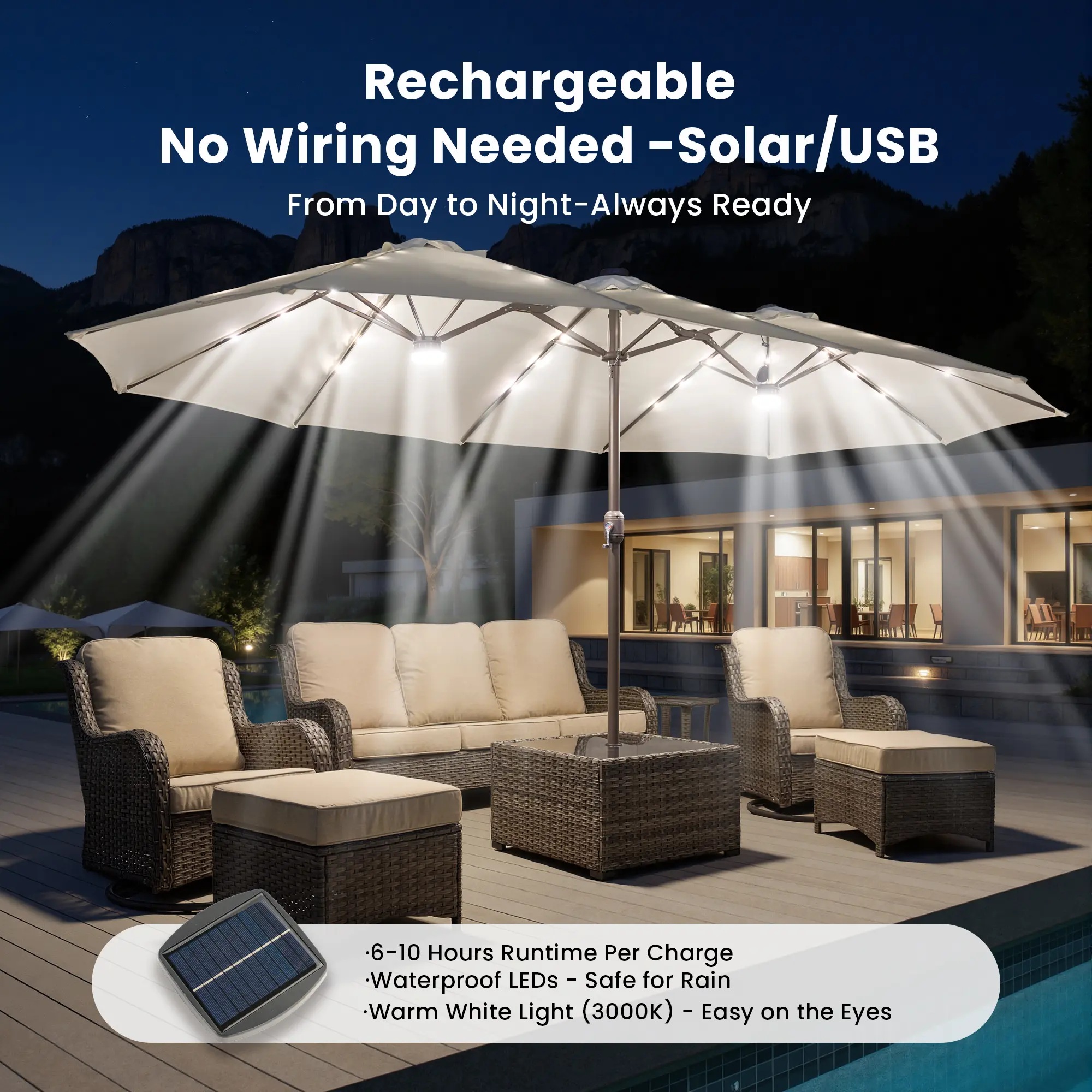 The shop ad was extremely misleading. The umbrella i got doesnt have any lights after I checked multiple times to make sure id selected the lighted one. Super disappointed.