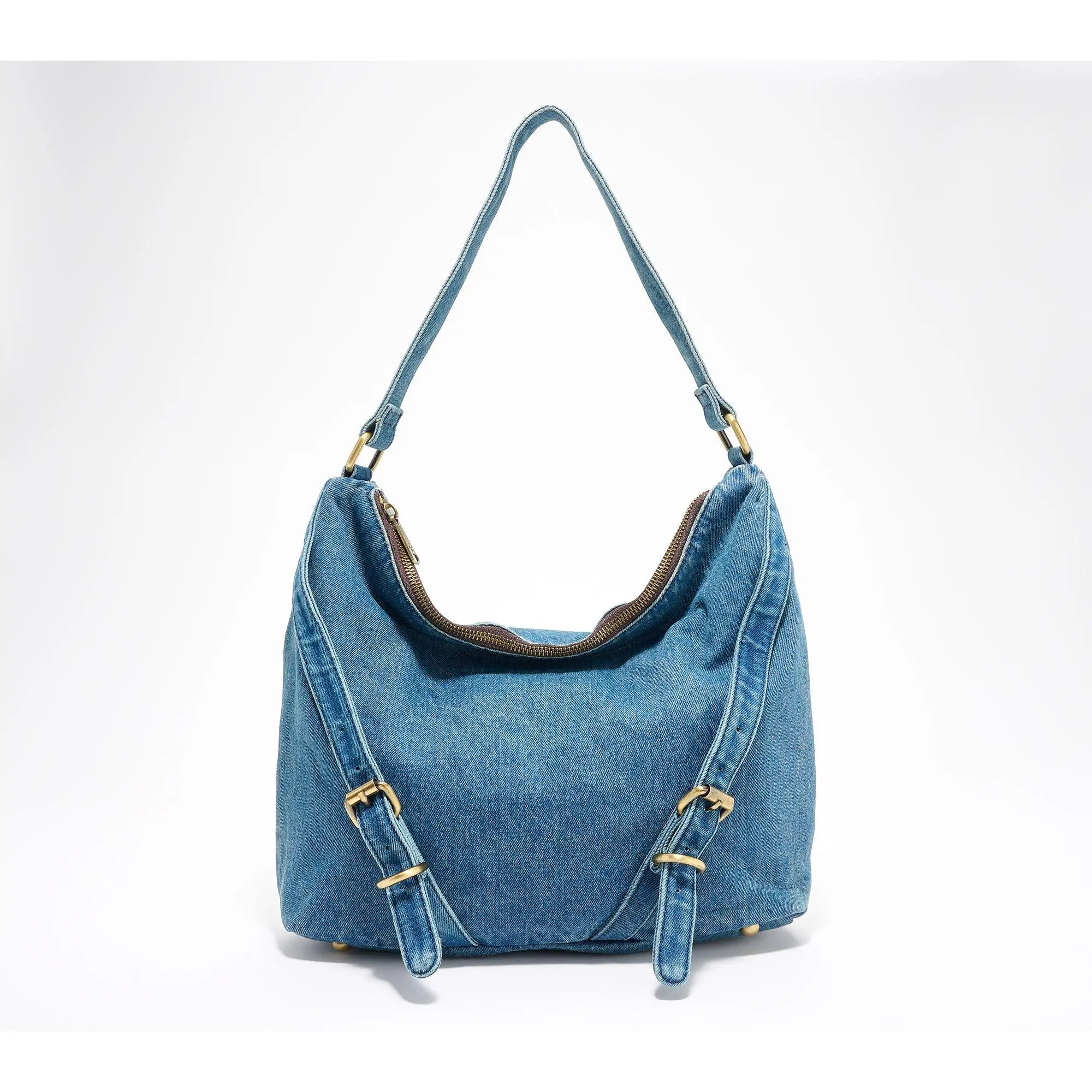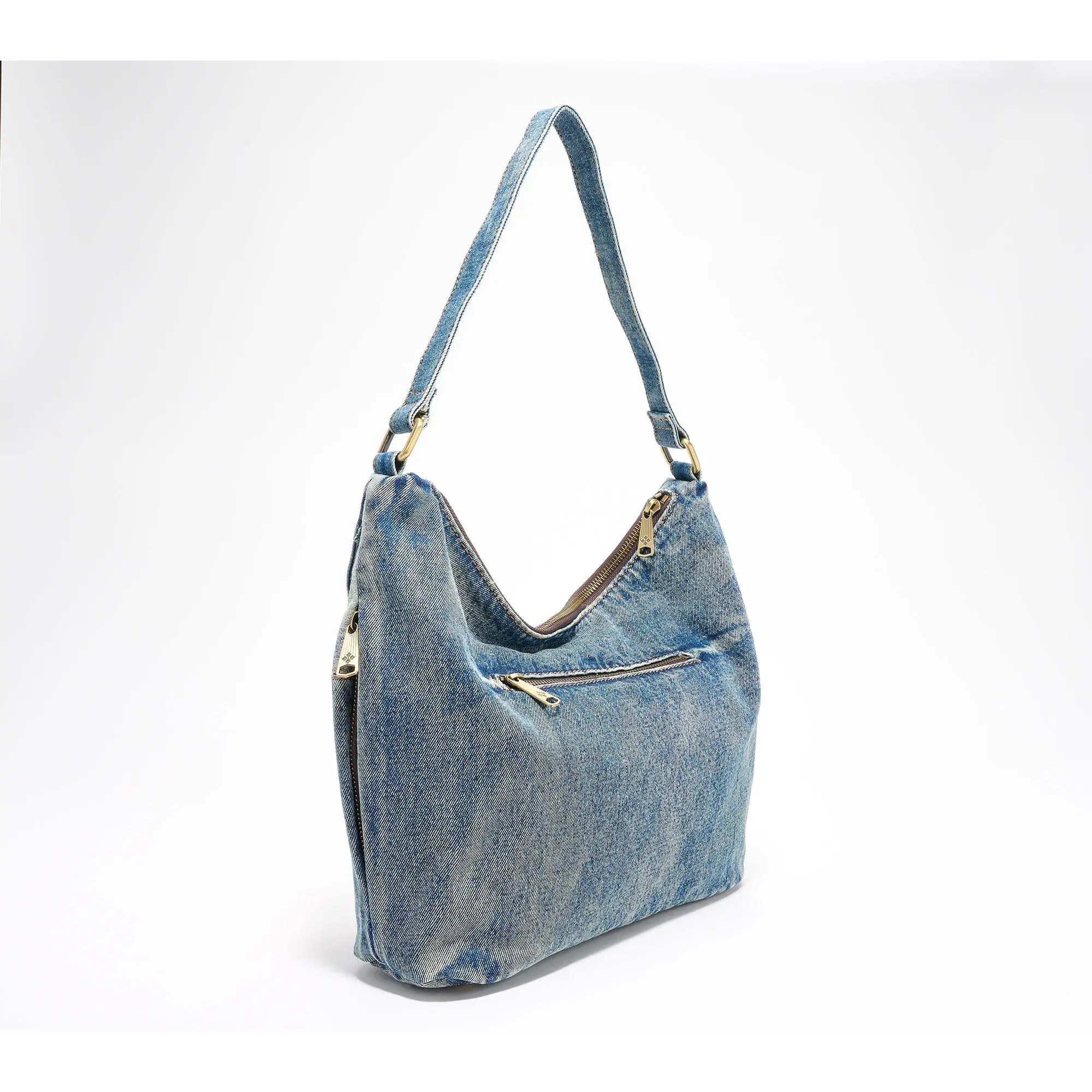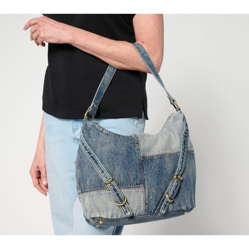 ·Denim body, hobo silhouette, zipper closure, rear zip pocket, two side zip pockets, top handle