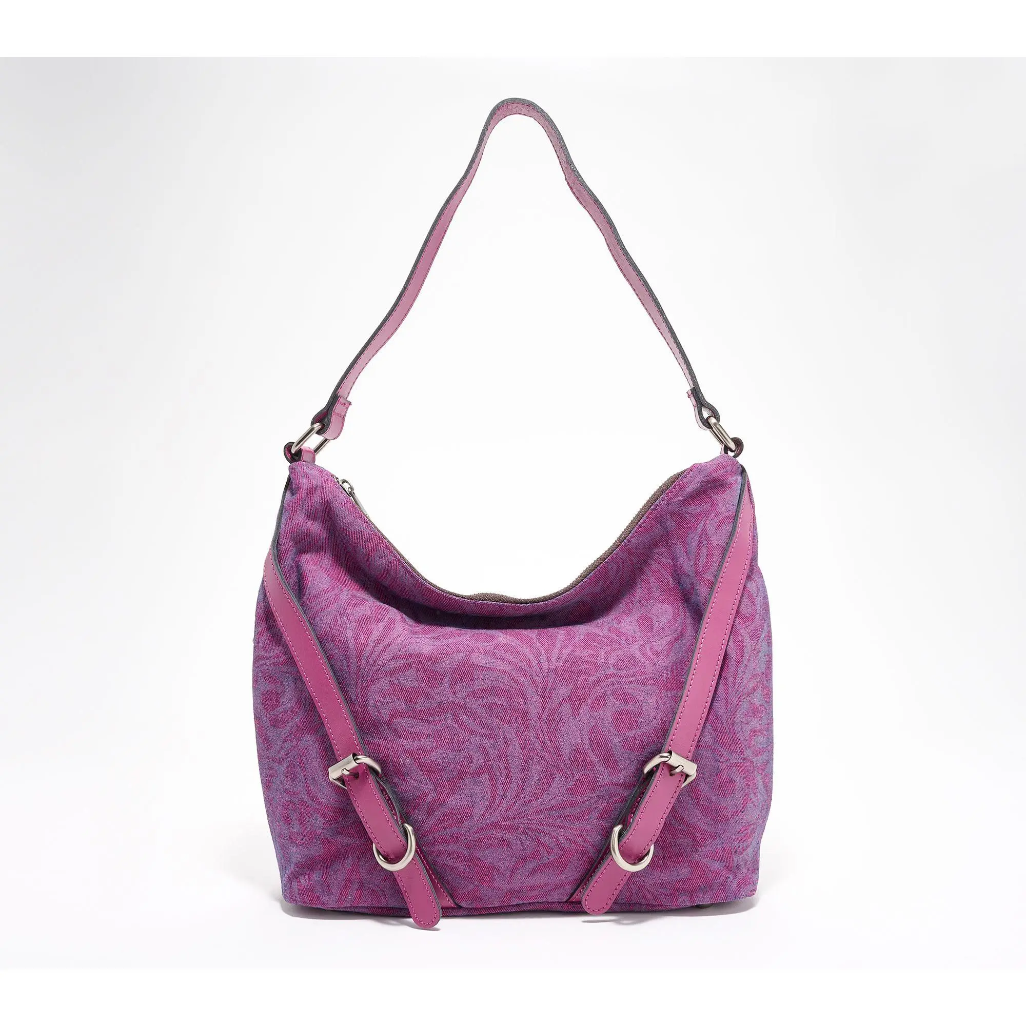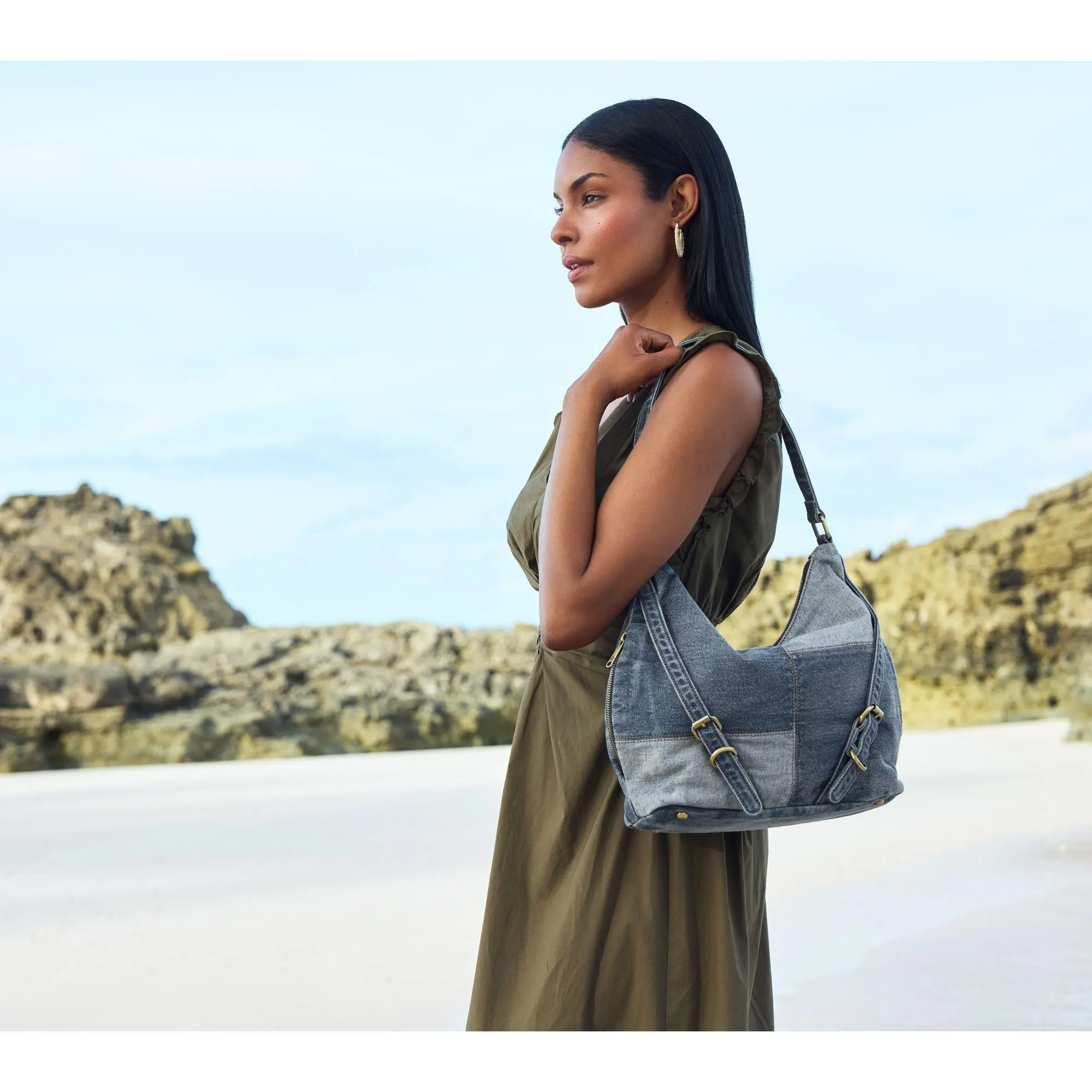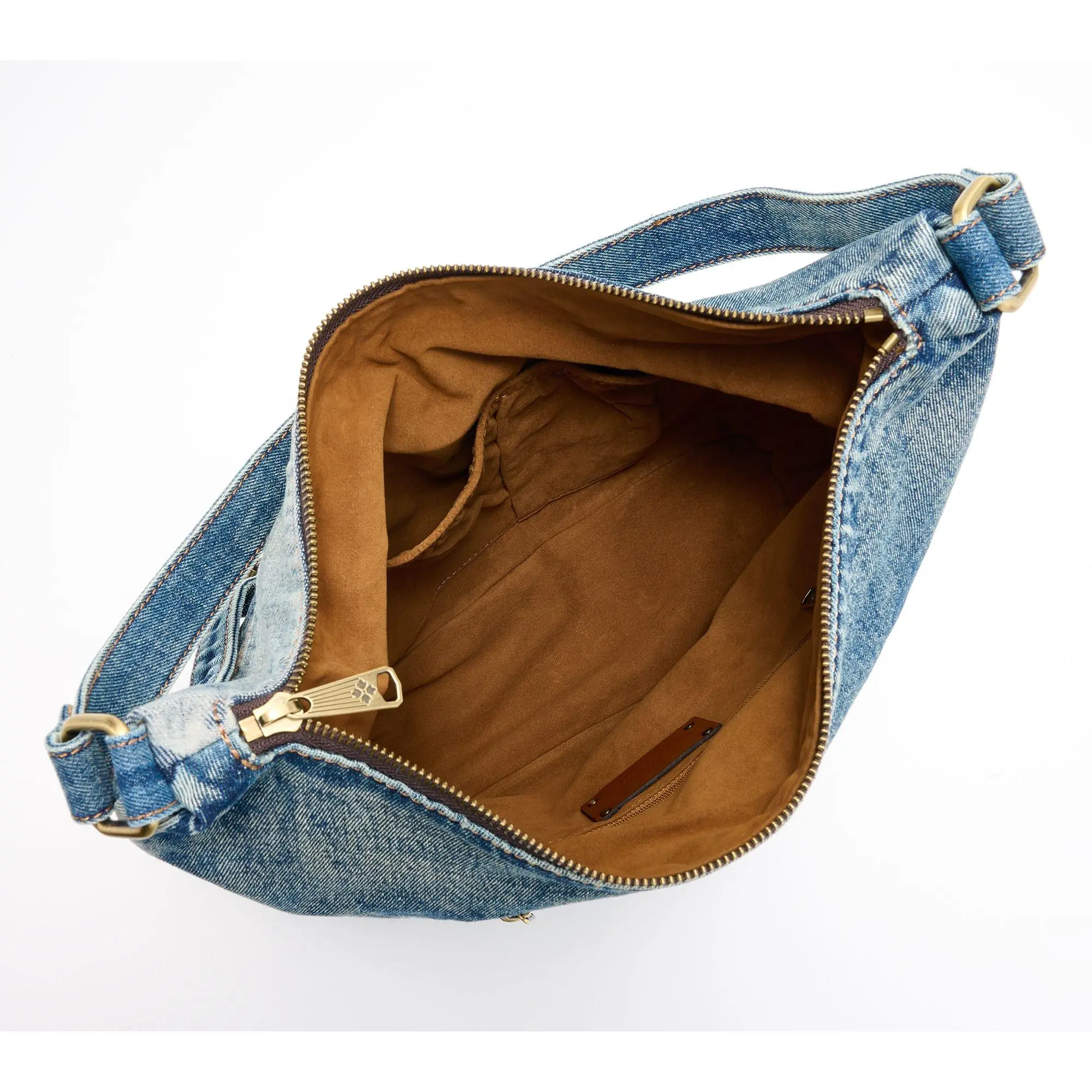 ·Denim body, hobo silhouette, zipper closure, rear zip pocket, two side zip pockets, top handle