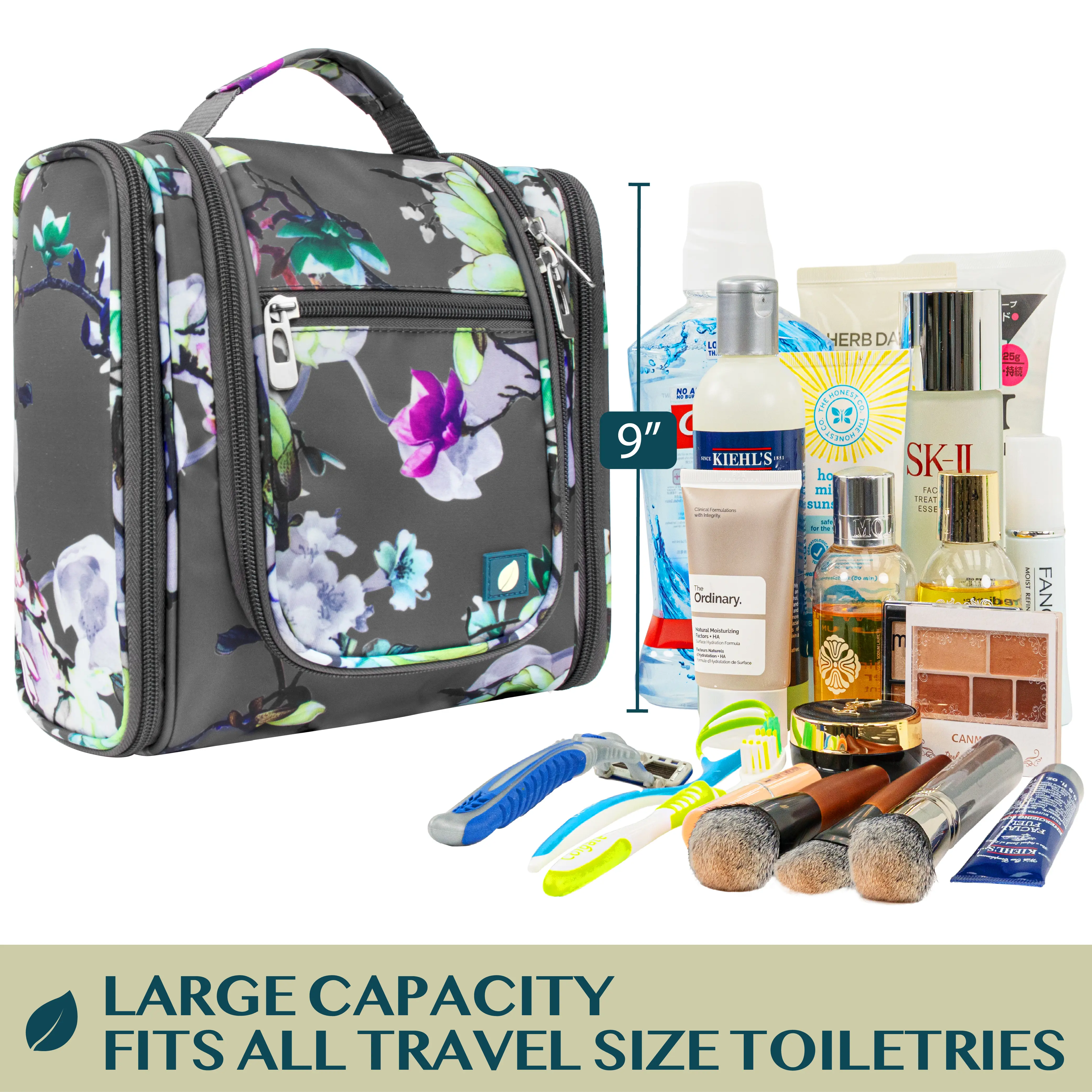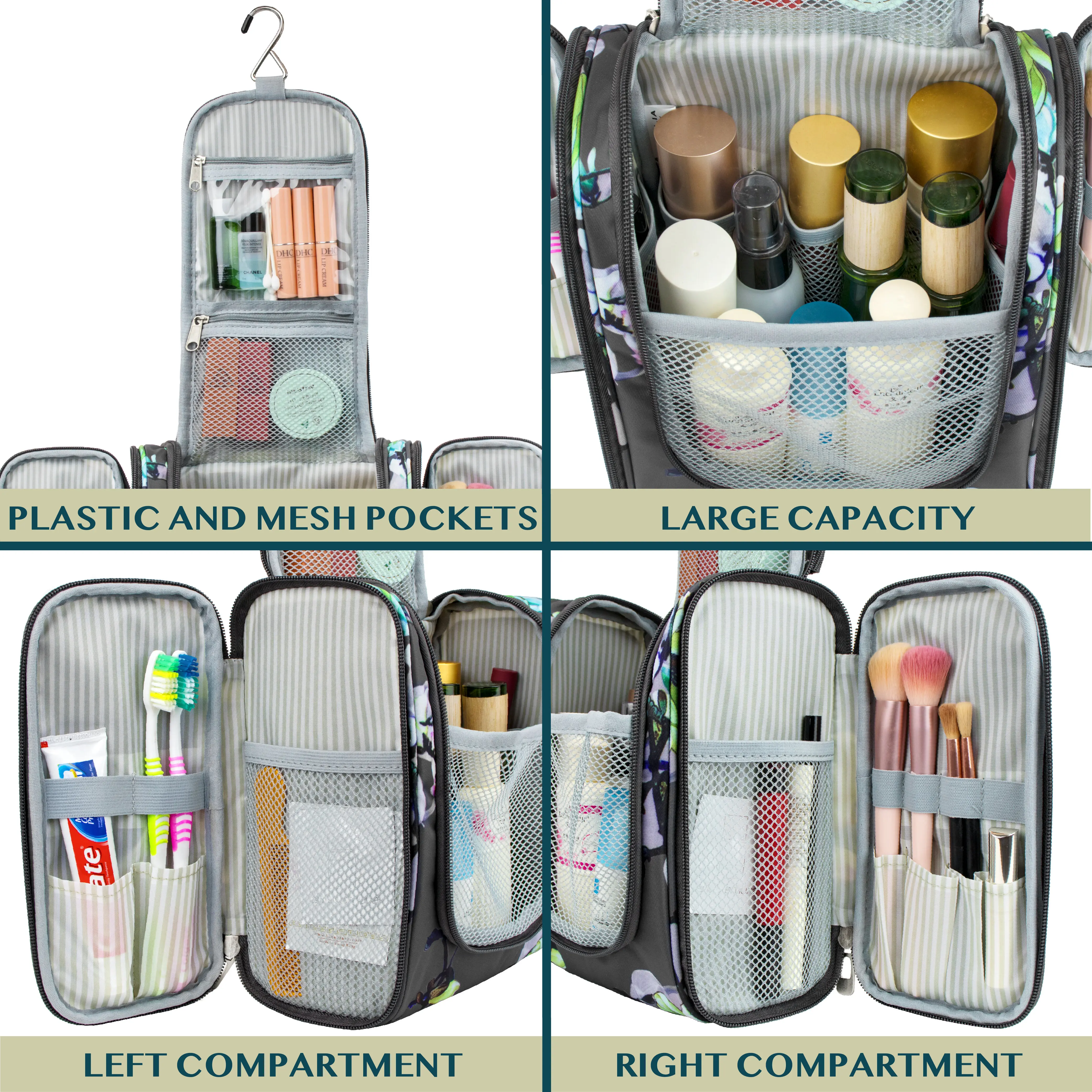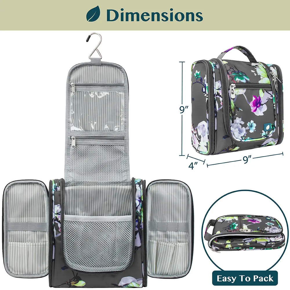 This hanging toiletry bag is extremely functional; Equipped with a large central compartment and two side pockets, this bag has over 12 smaller pockets that let you organize all your toiletry from toothbrush, makeup brush, and other cosmetics/hygiene needs.