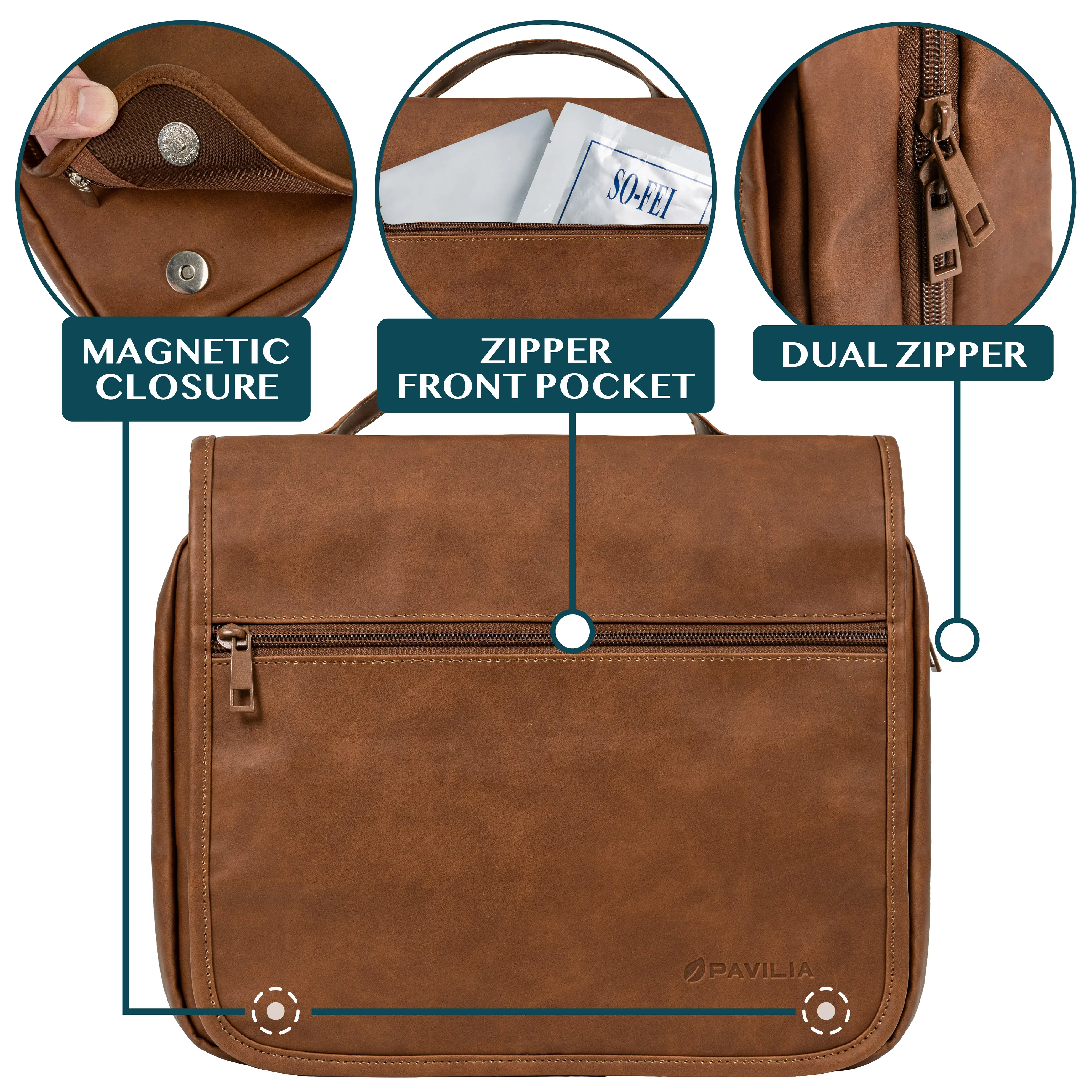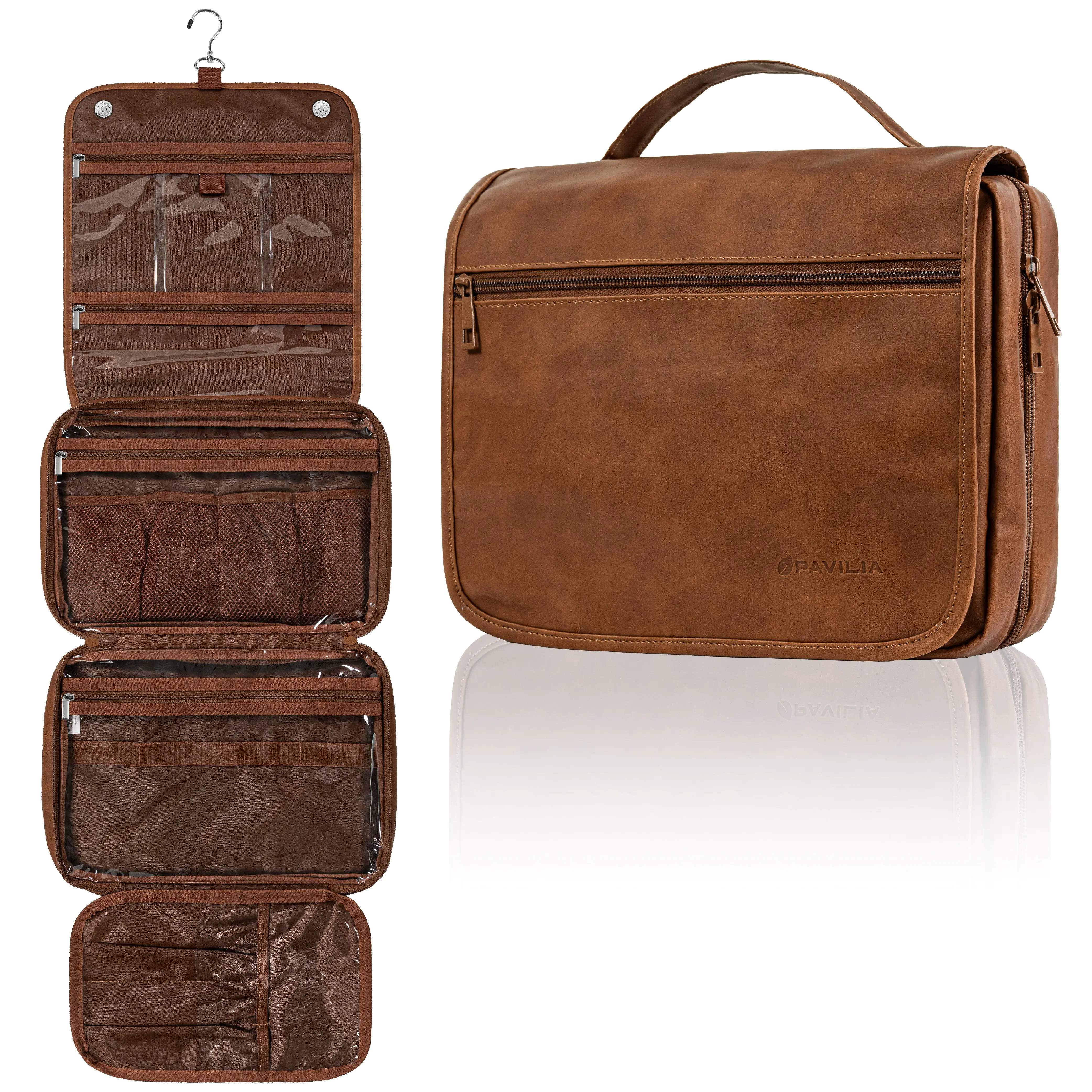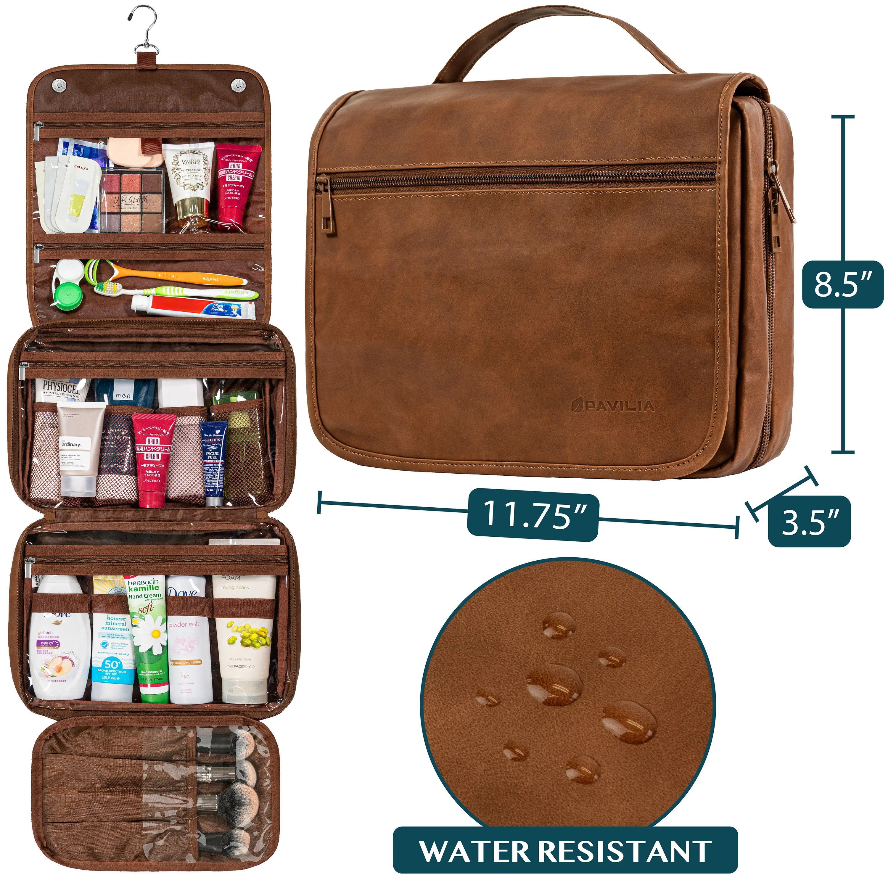 PAVILIA large travel bag toiletry organizer case has a large central compartment and two side pockets to fit all your travel toiletries containers, makeup, and cosmetic bottles. Main compartment has 6 mesh pockets to fit skincare bottles, shampoo while side smaller pockets are designed to hold make up brush, toothbrush. This is a travel must have for vacation, flying, gym, cruise, and home.