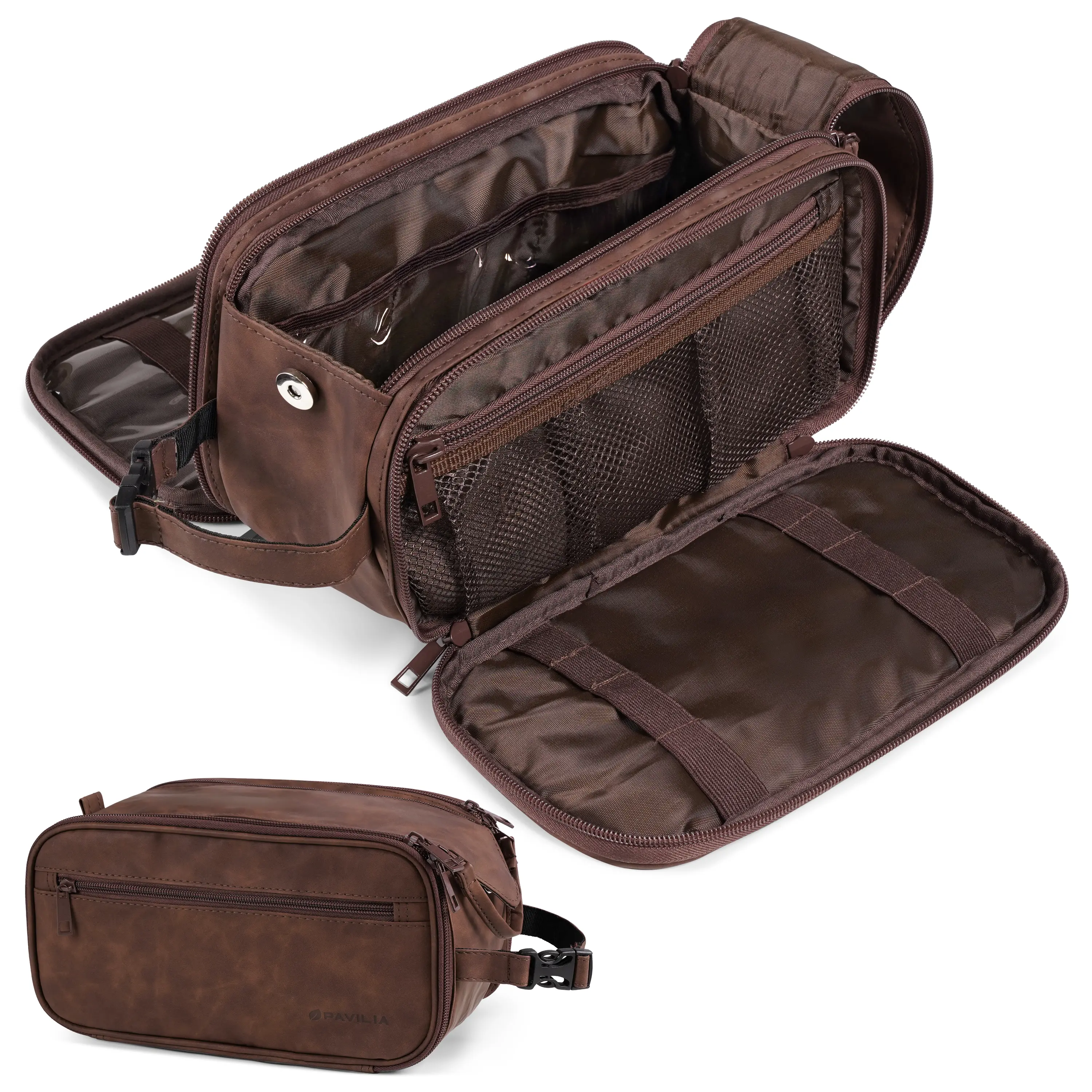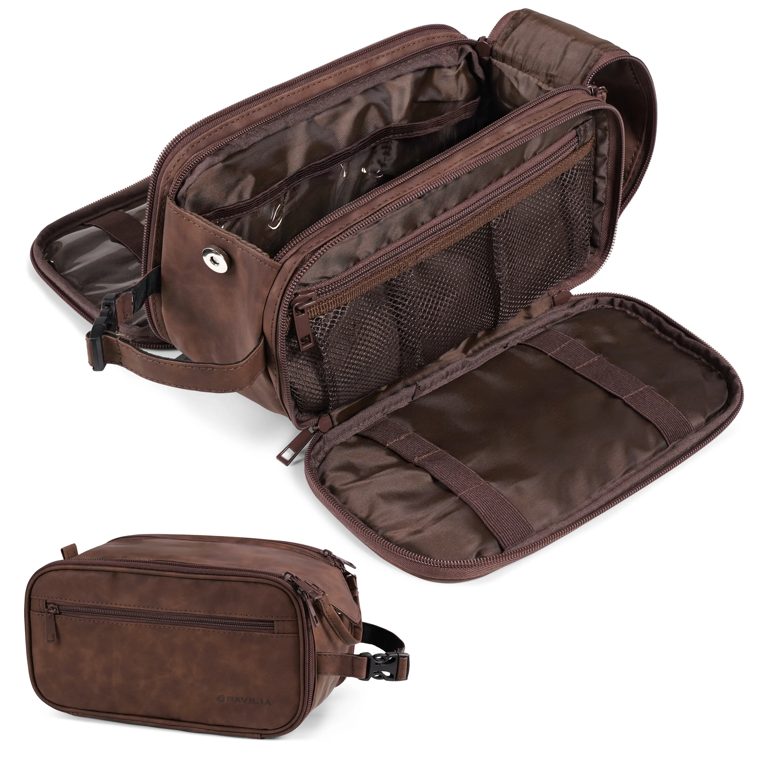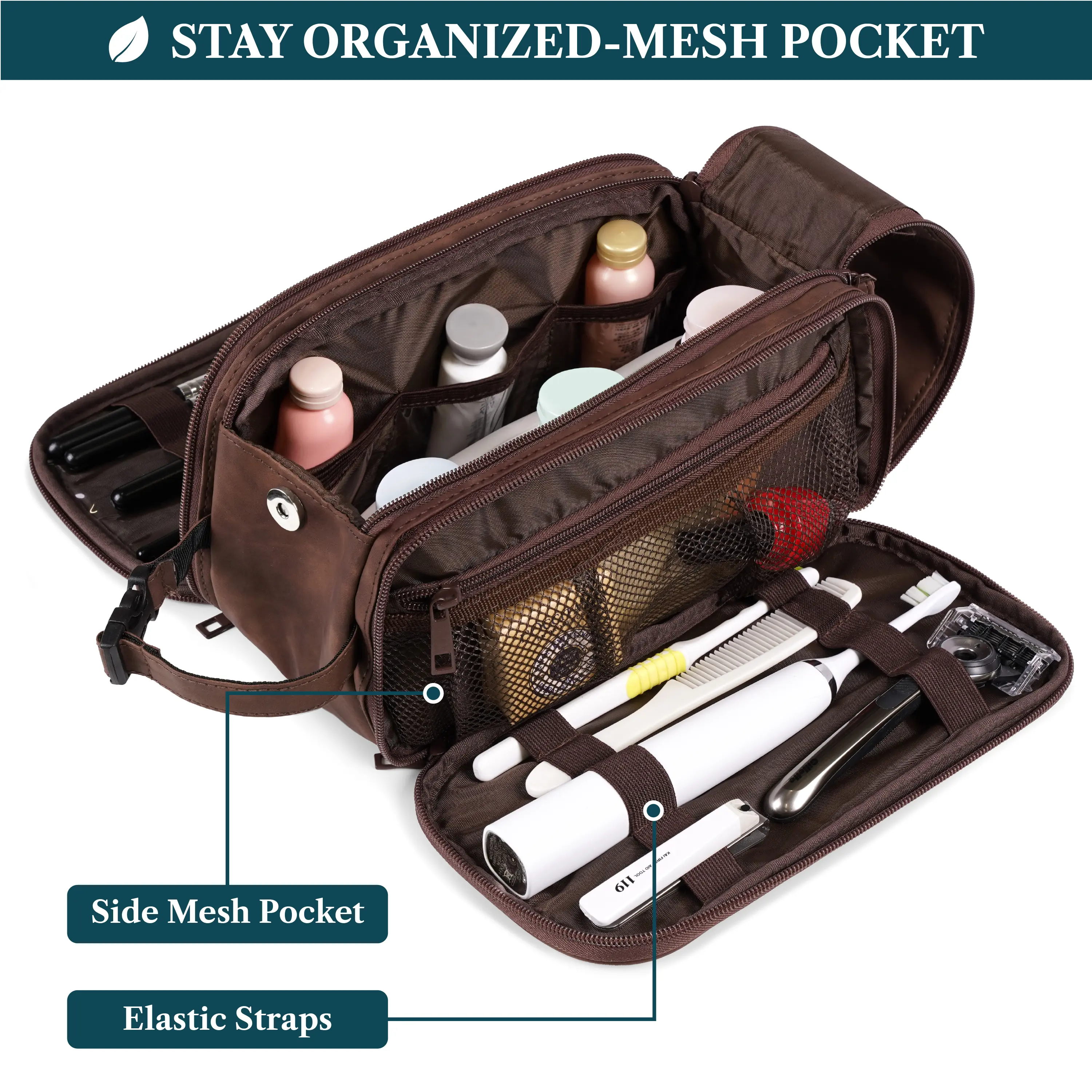 MENS TOILETRY BAG: This functional PU leather toiletry travel bag has a large compartment and side pockets with additional pockets to hold all your toiletry, shaving, and grooming accessories. Equipped with elastic bands and additional mesh pockets to keep your hygiene items secured while traveling, weekend trip at hotel, or at home, this cosmetic make up case will help you stay organized.