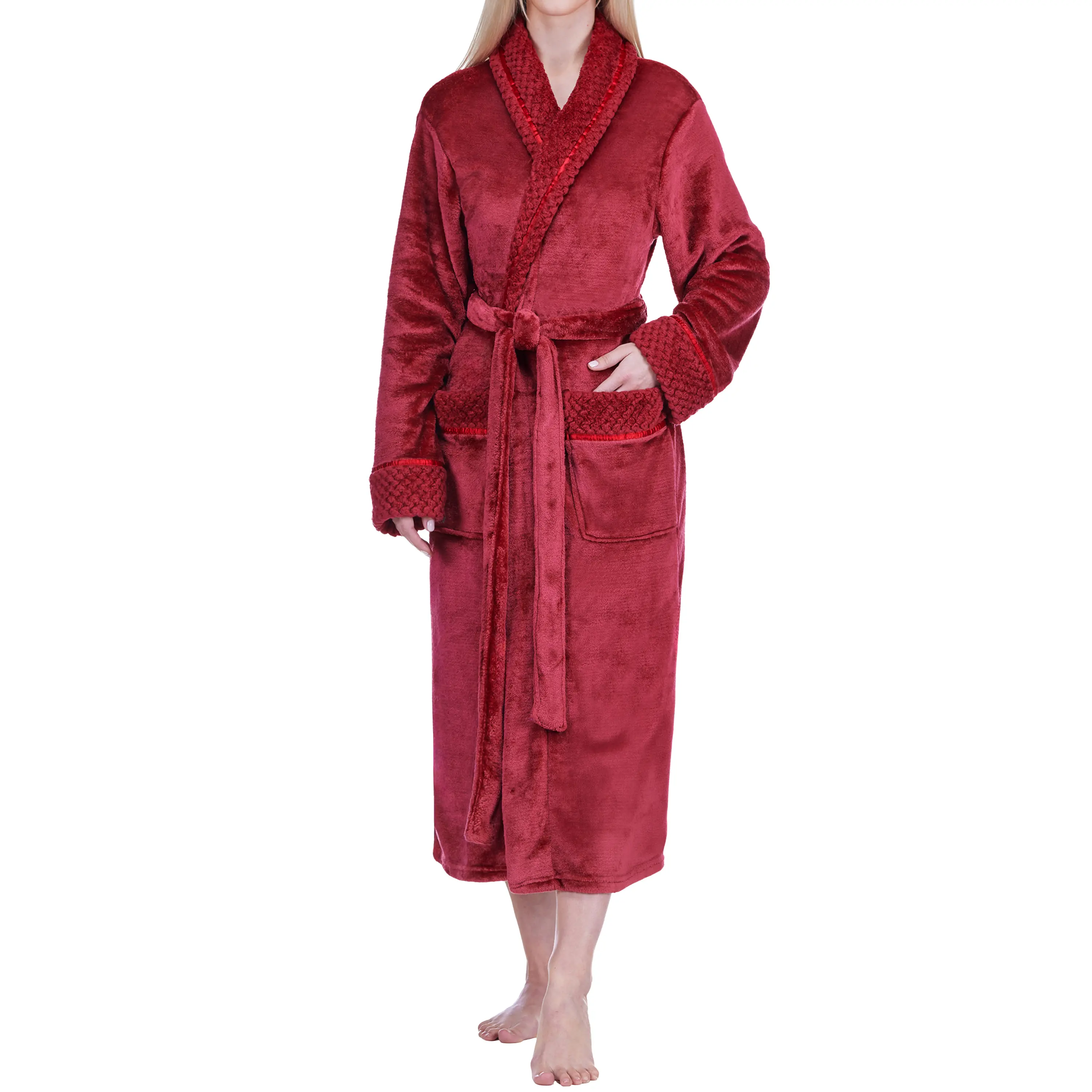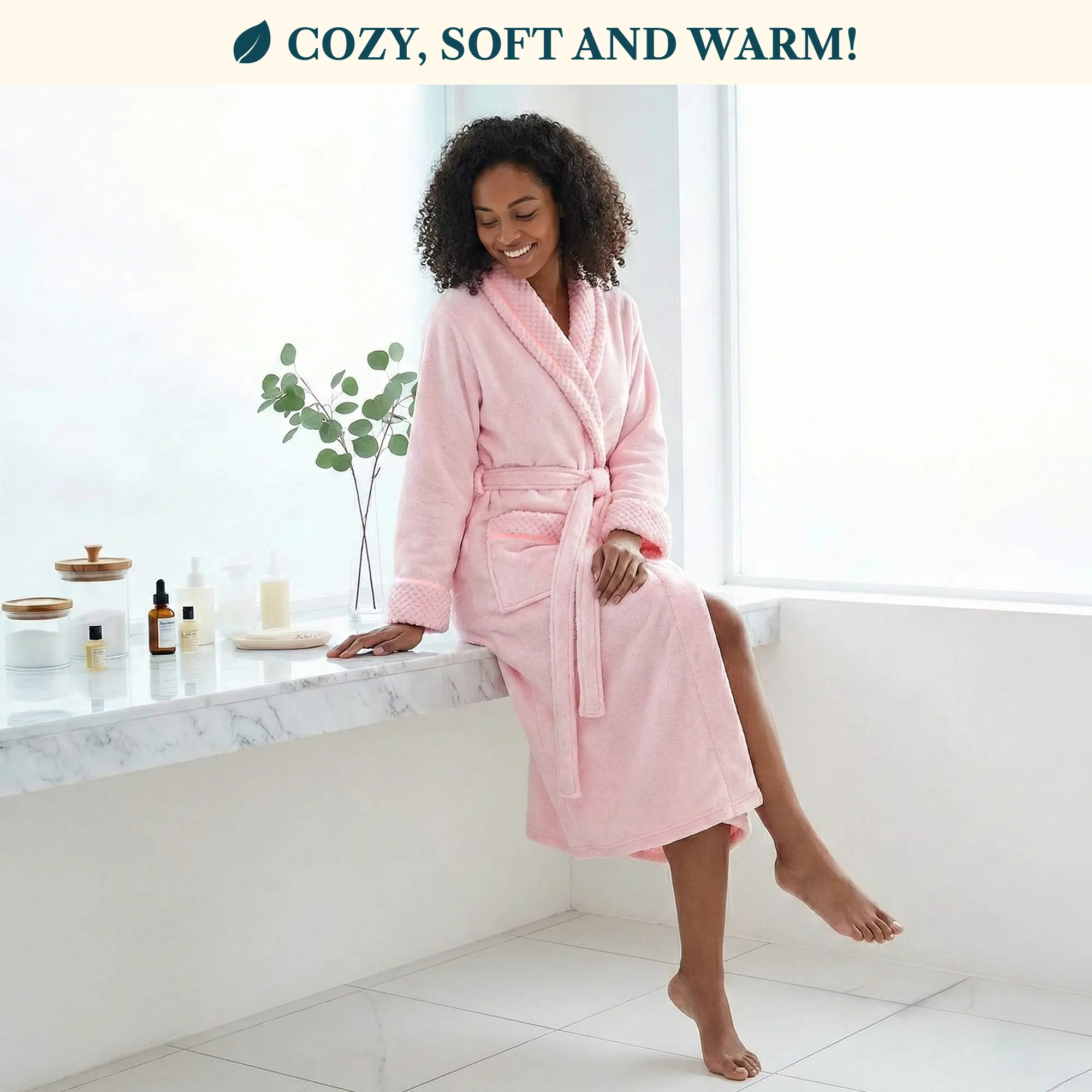 ·PERFECT FIT AND FUNCTIONAL Comes with a waist strap so you can adjust for perfect fit and 2 side pockets to keep all your essentials! The shawl collar neck is a classic and keeps your neck comfortable and warm. Long length robe with long sleeves for soft and snuggly warmth after spa, bath, or shower.