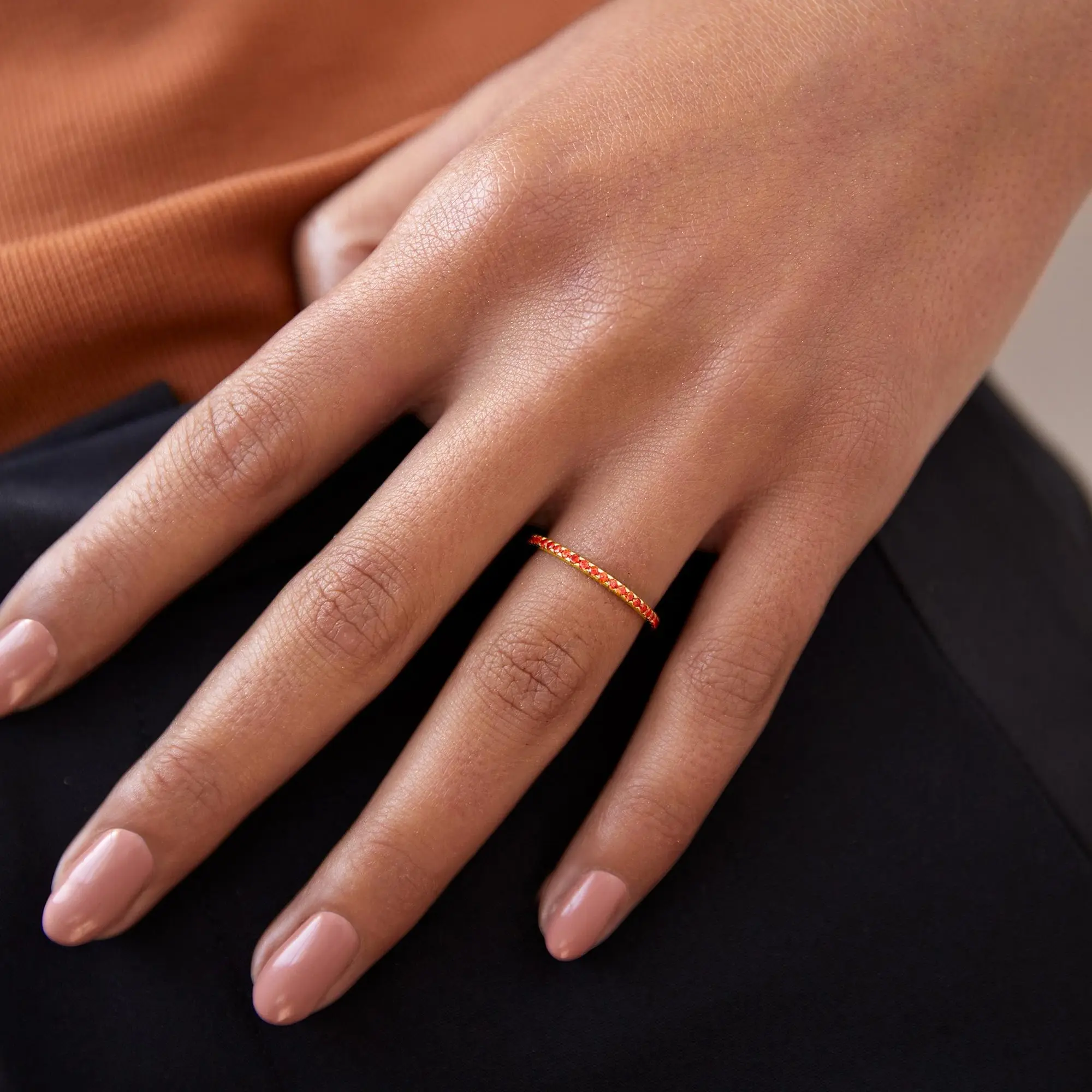Beautiful ring! I ordered the garnet cz band expecting the stones to be red. They definitely seem to be more orange than red but it is still a beautiful piece!
