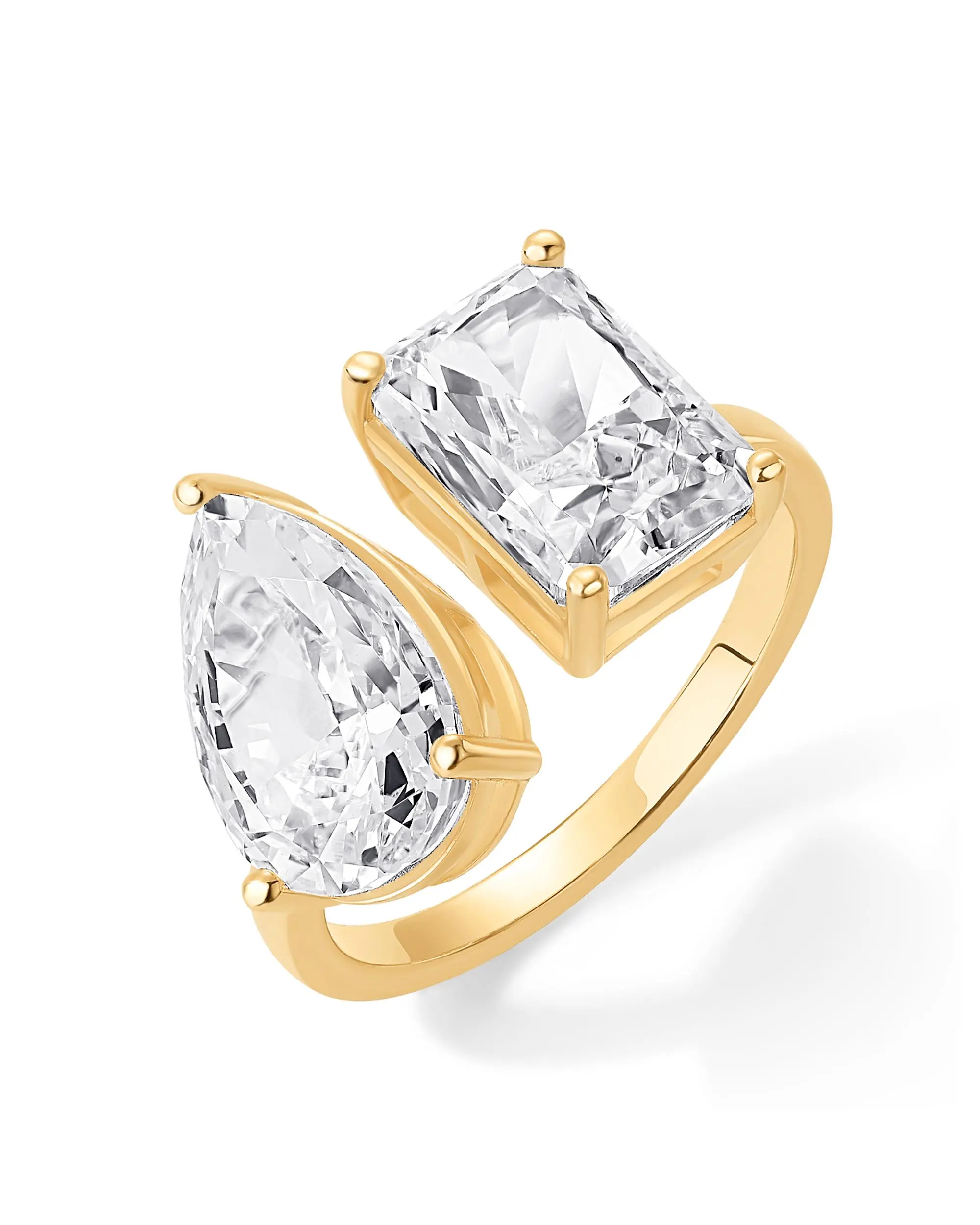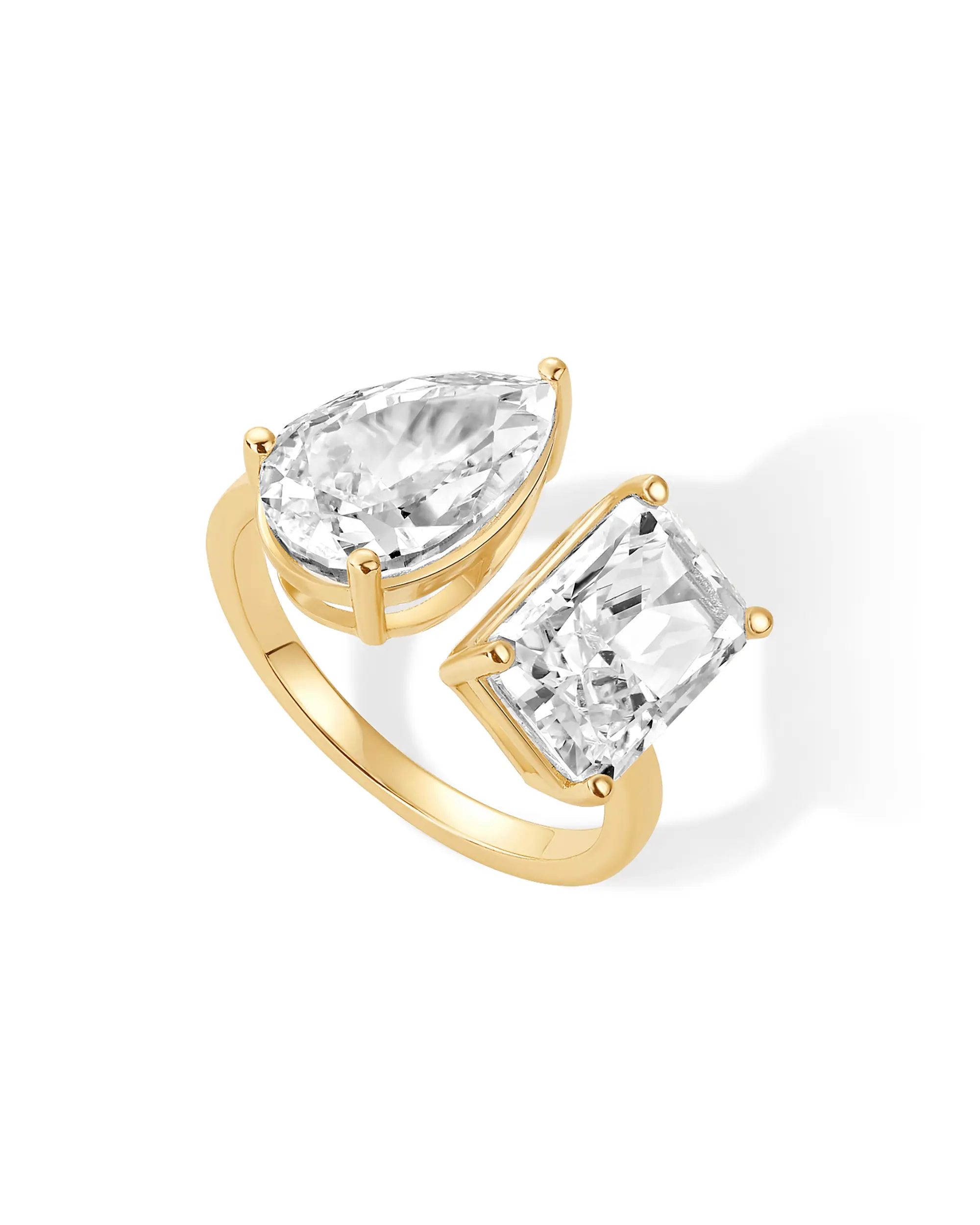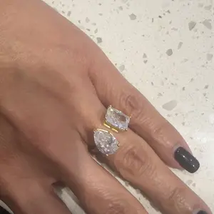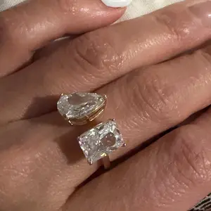 This ring is an absolute showstopper. The design features two rectangular stones set side-by-side — one crystal-clear and one warm golden tone — giving it a luxe, eye-catching contrast.