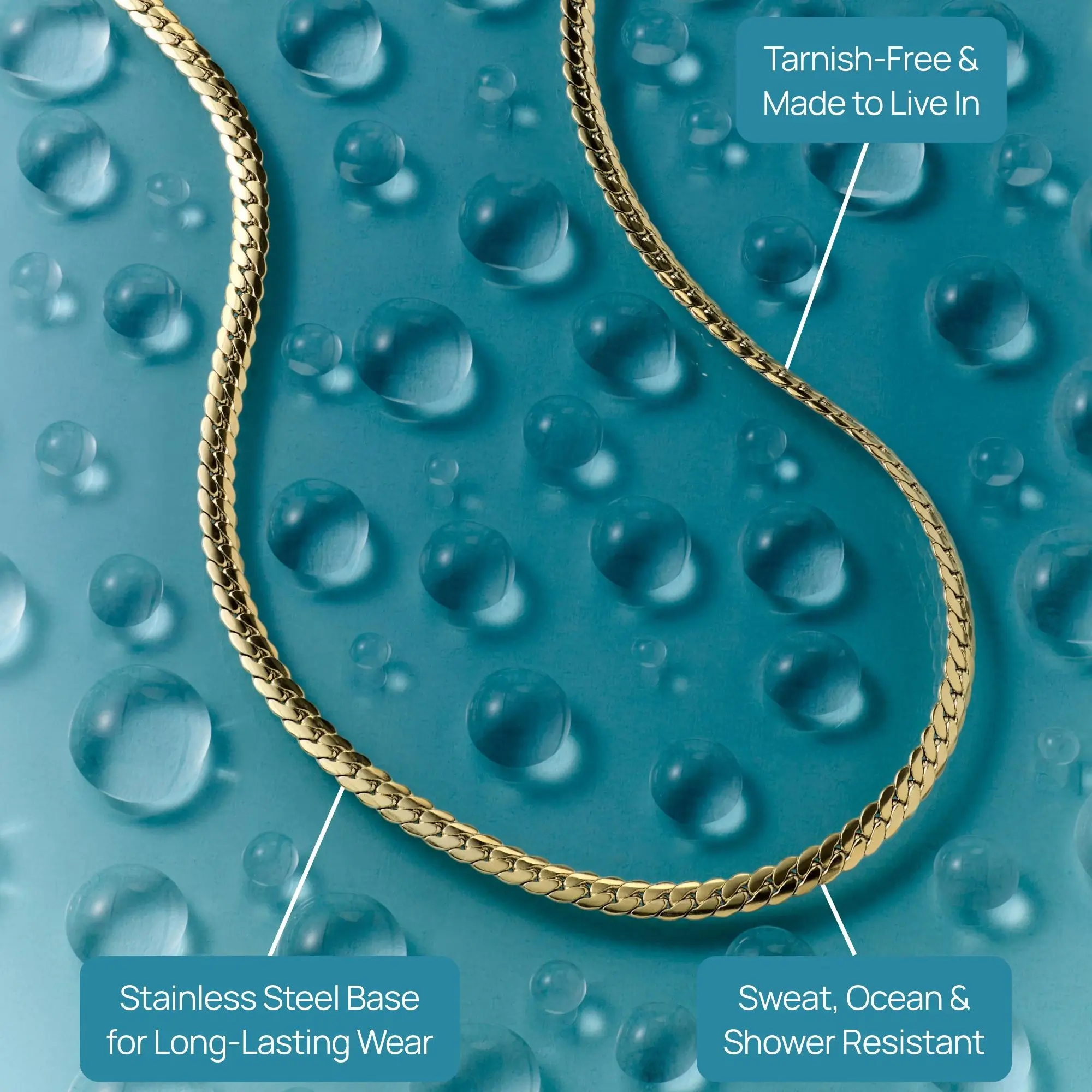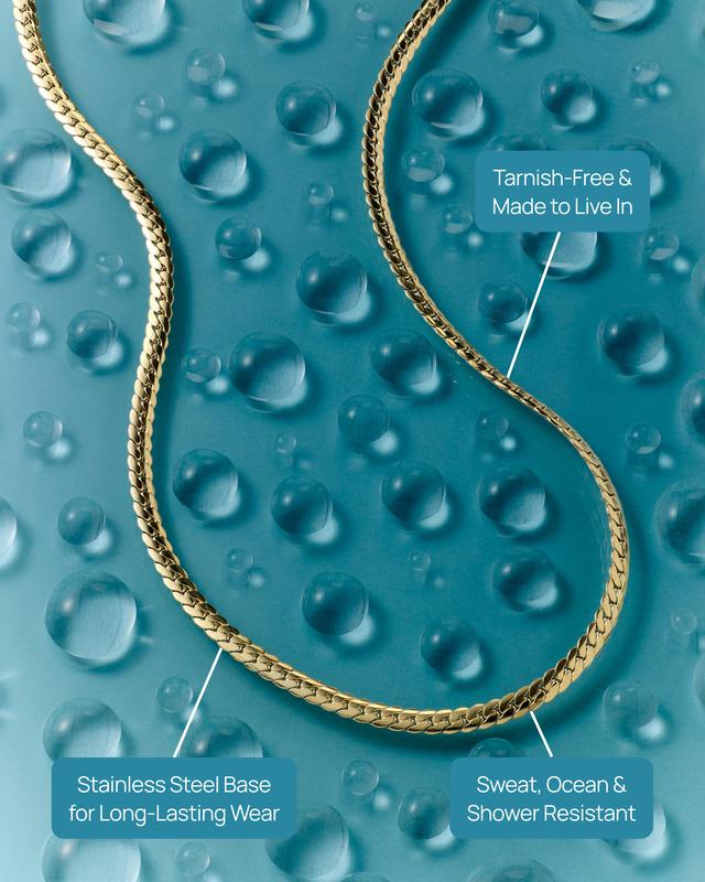 · Snake Chain (1.2mm wide, 16" + 2" extender): Waterproof smooth, fluid chain for a clean look. Wear solo or with layers.