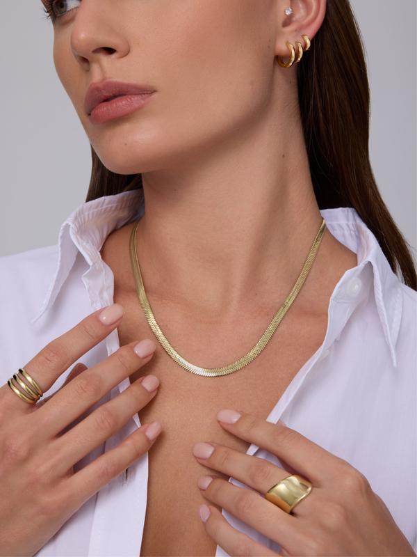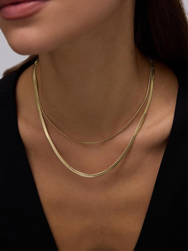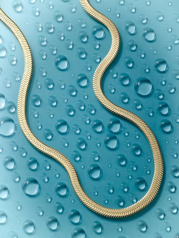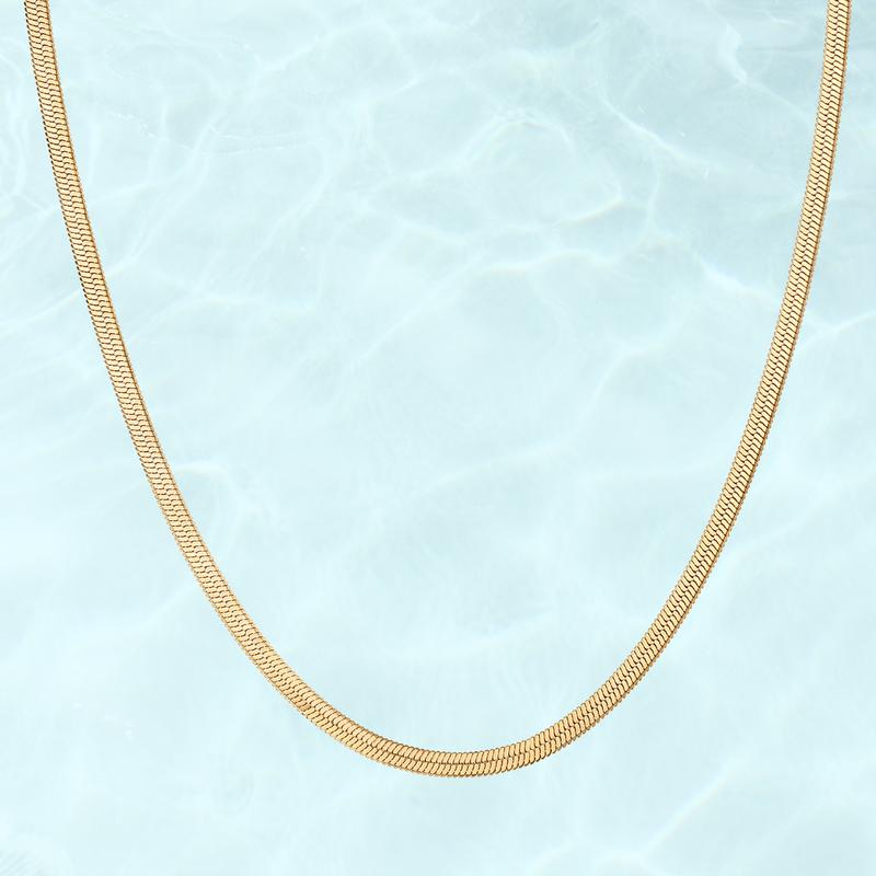 · Wide Herringbone (5mm wide, 16" + 2" extender): Waterproof bold high-shine herringbone that lays flat and elevates any look.