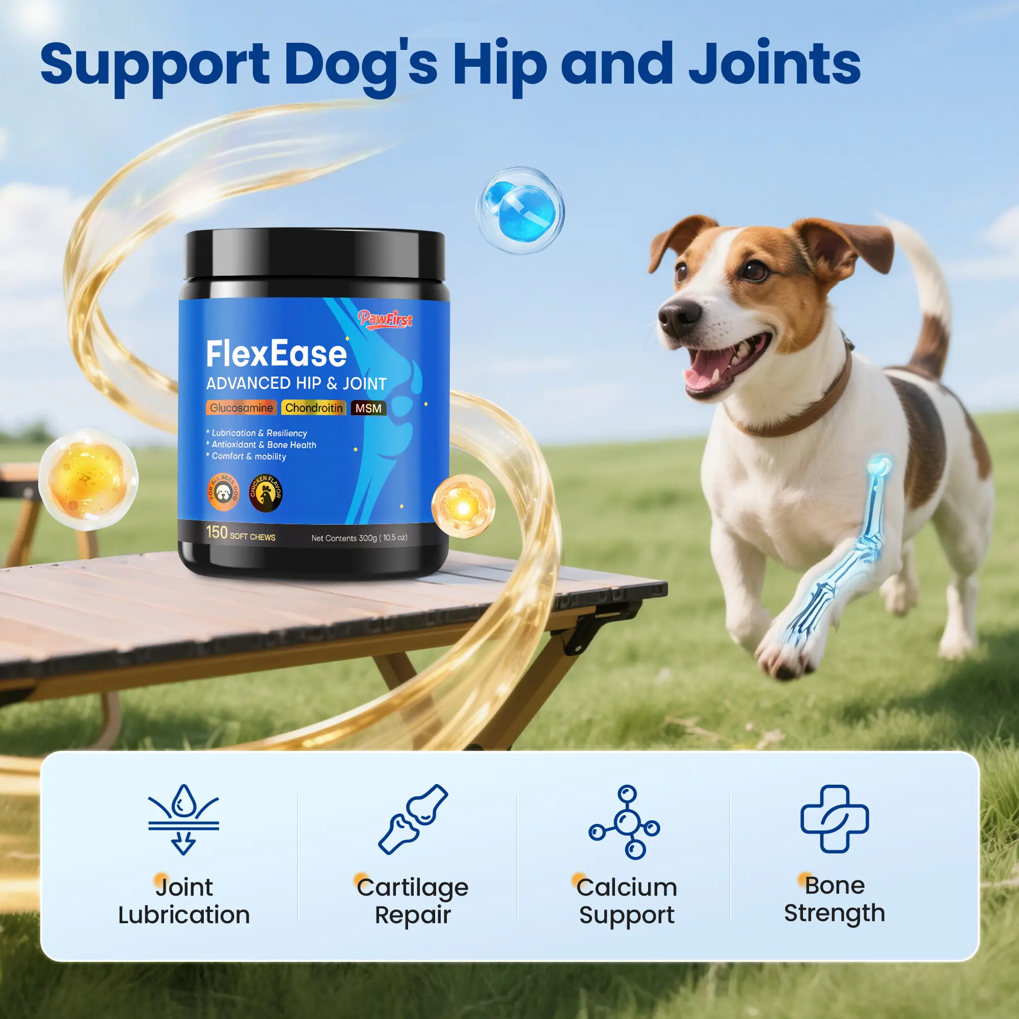 Bone & Joint Long-Term Wellness: Includes hyaluronic acid to help lubricate joints and strengthen bone structures, contributing to your dog’s overall vitality.