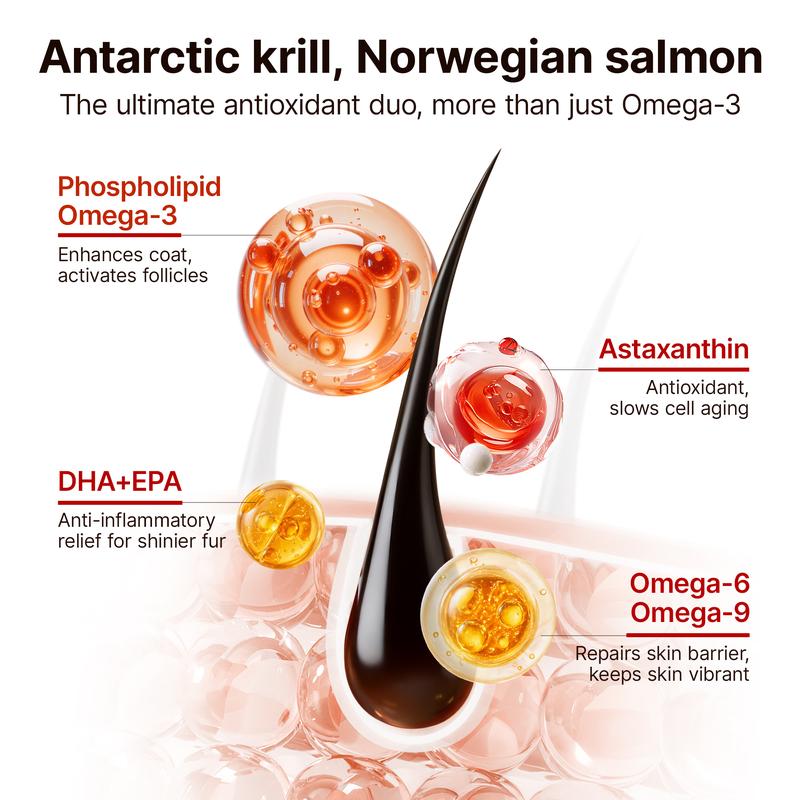 The addition of Antarctic krill provides phospholipids and natural astaxanthin, which help enhance the bioavailability of Omega-3s. This supports better nutrient uptake while delivering antioxidant benefits for skin, coat, and overall wellness.