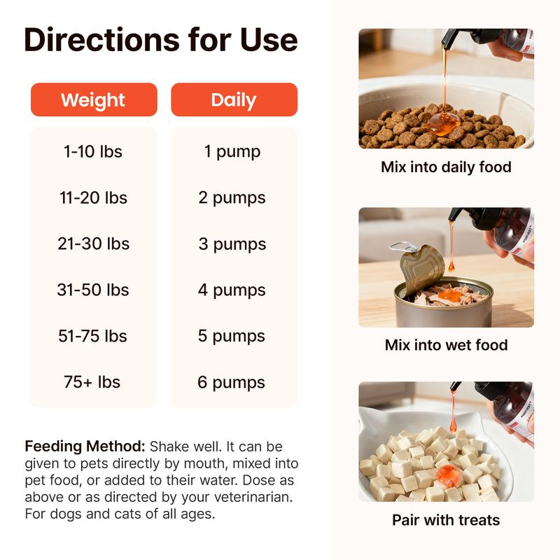 The included pump makes dosing simple—just one pump for small pets, more for larger breeds. Easily mix the tasty liquid into your pet’s food. Its rich flavor is highly palatable, making daily supplementation effortless.