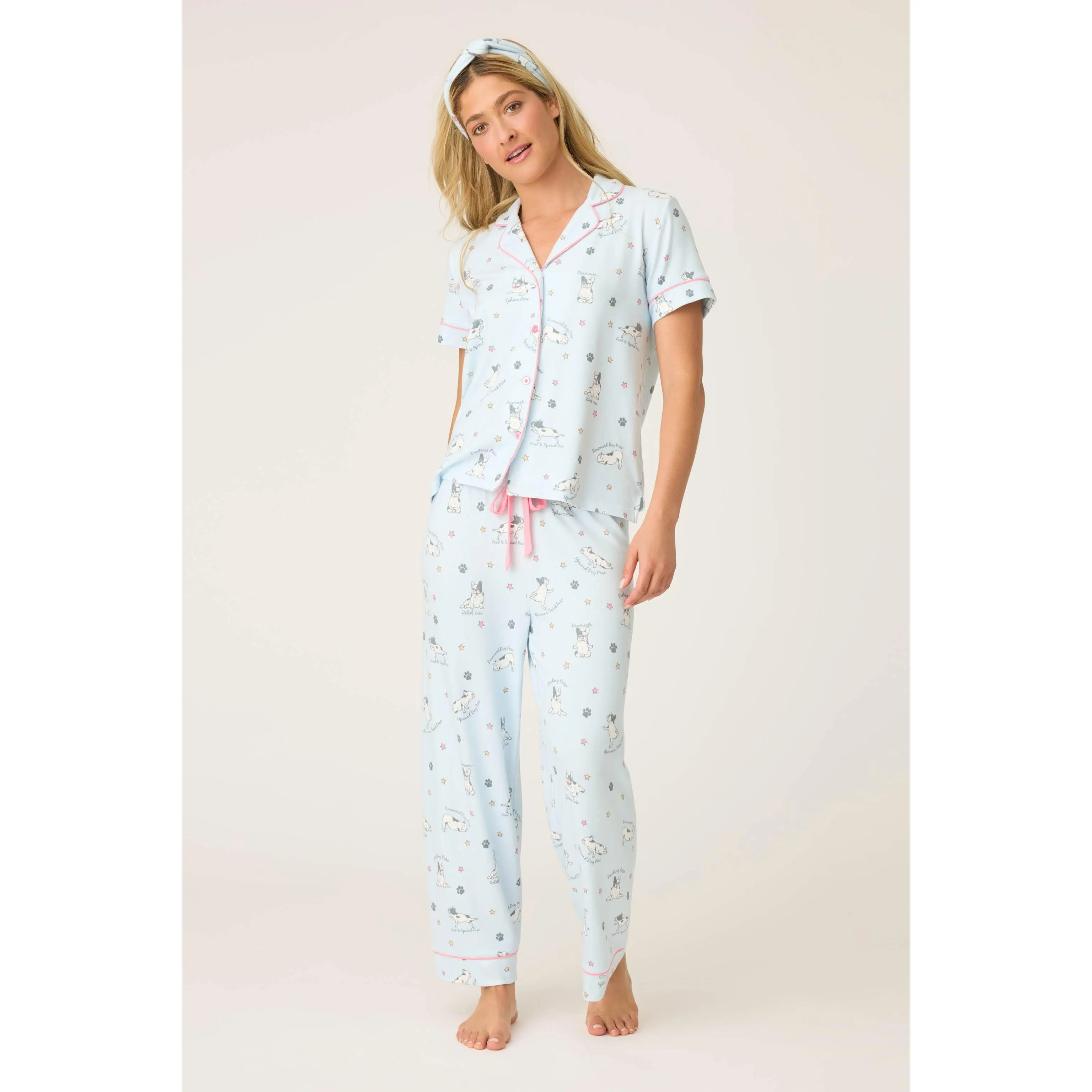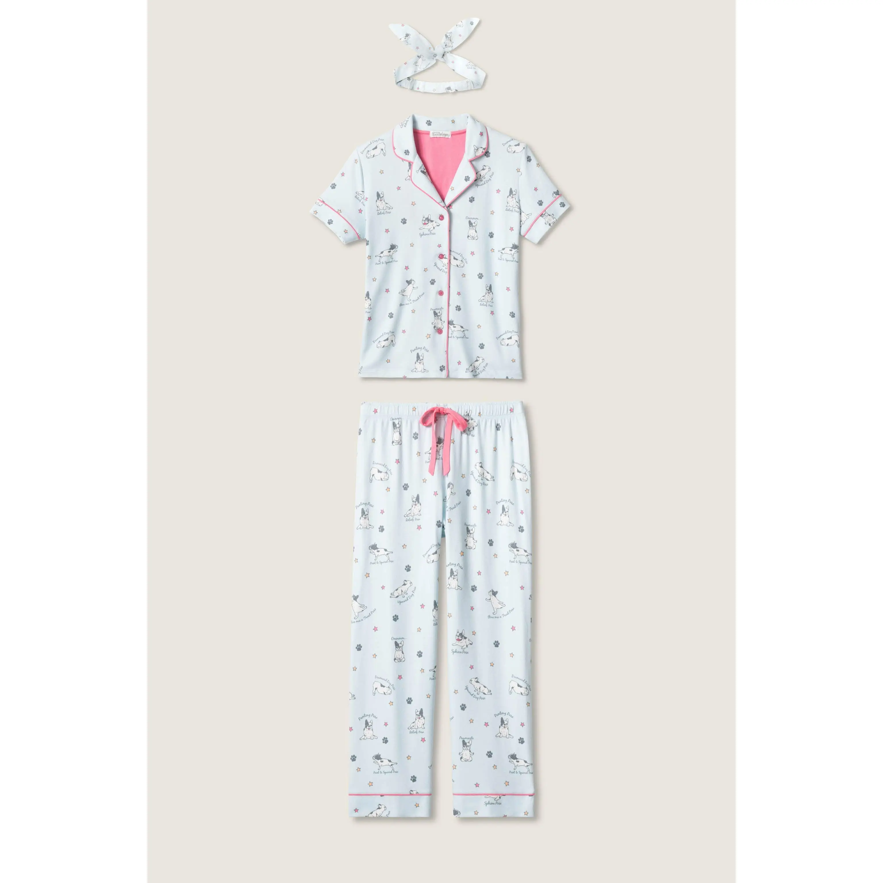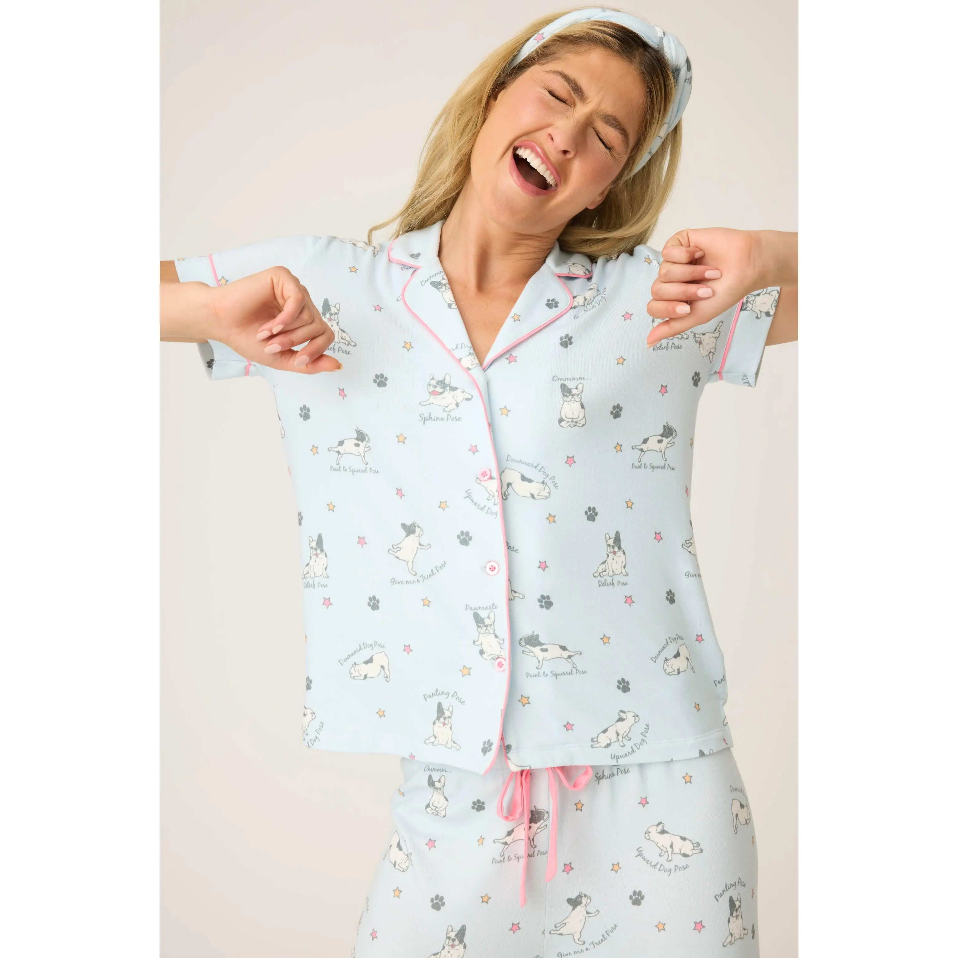 Breathe in, wag out. This matching set is crafted from our peachy-soft jersey in a calming misty blue hue with a touch of stretch for ease. The all-over pup print features Frenchies striking their best yoga poses—from "point to squirrel" dog to “give me a treat” pose—for an extra dash of Zen. Finished with candy-pink piping on the short-sleeve notch collar top and wide-leg pants, plus a coordinating twist headband for a playful twist on relaxation mode.