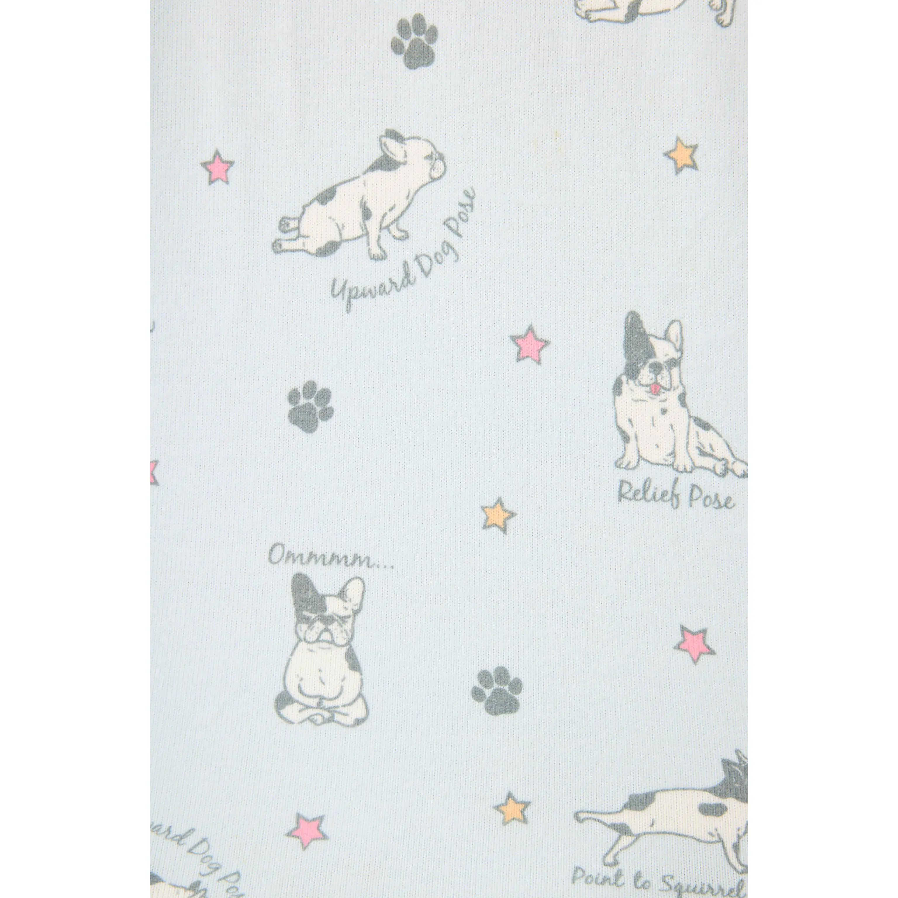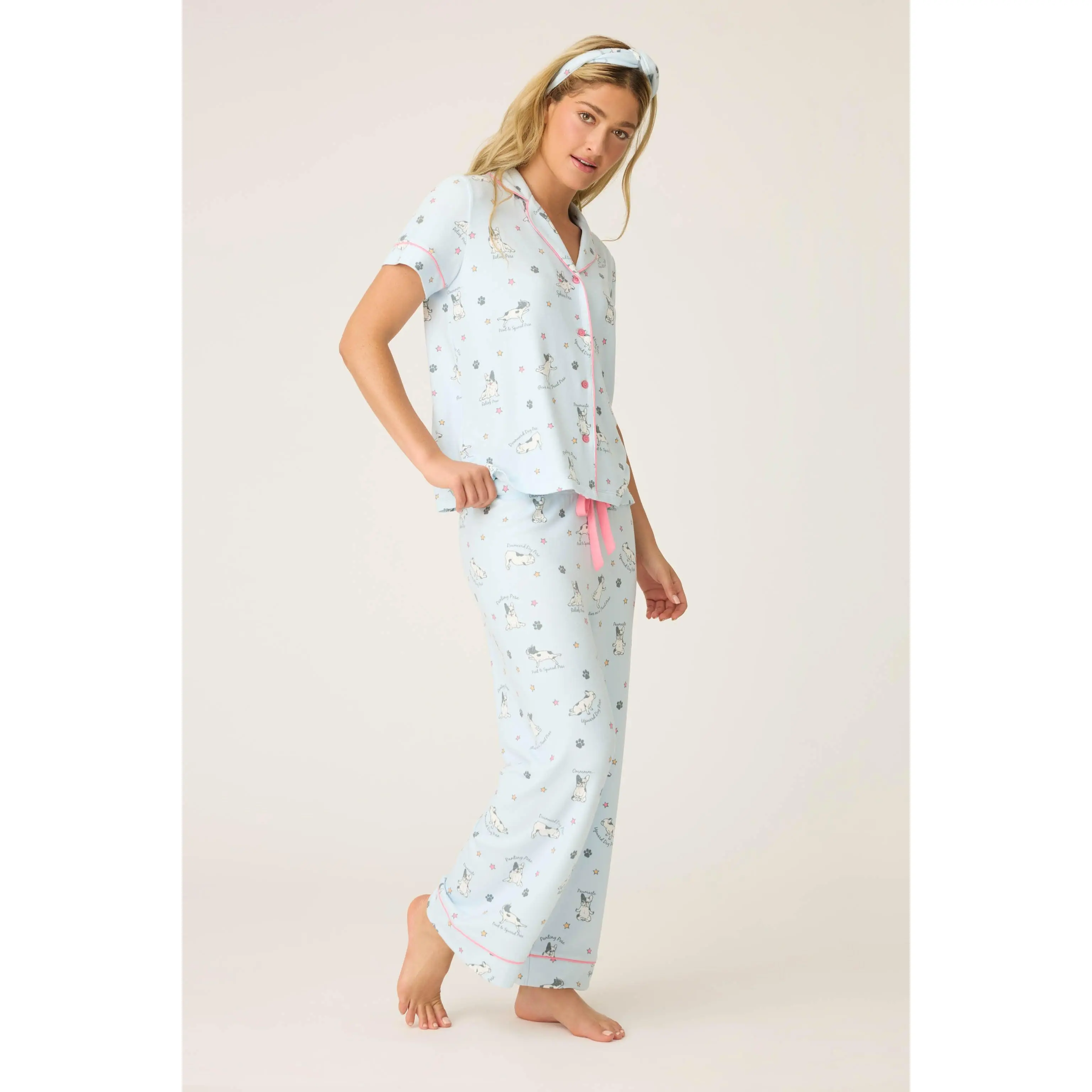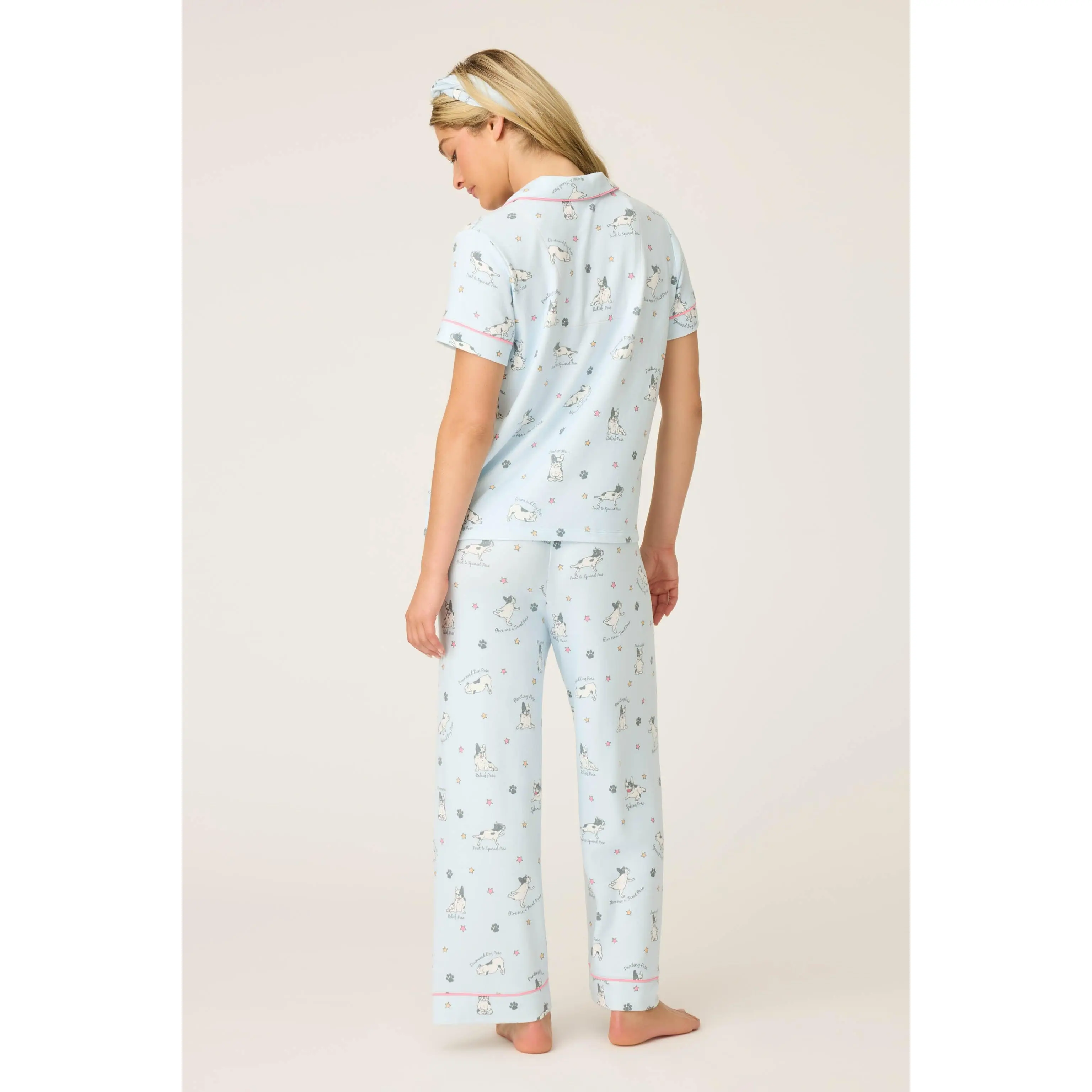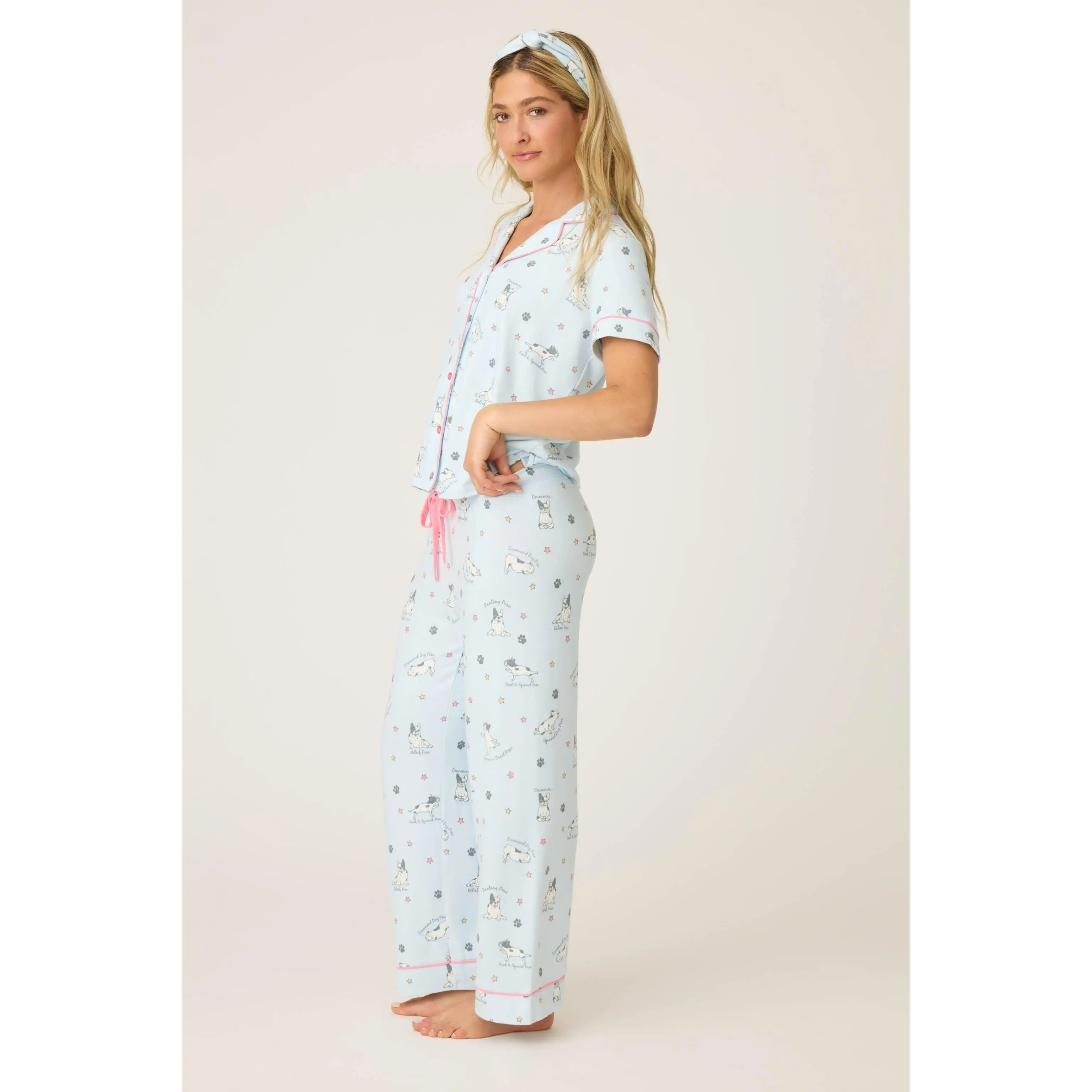 Breathe in, wag out. This matching set is crafted from our peachy-soft jersey in a calming misty blue hue with a touch of stretch for ease. The all-over pup print features Frenchies striking their best yoga poses—from "point to squirrel" dog to “give me a treat” pose—for an extra dash of Zen. Finished with candy-pink piping on the short-sleeve notch collar top and wide-leg pants, plus a coordinating twist headband for a playful twist on relaxation mode.