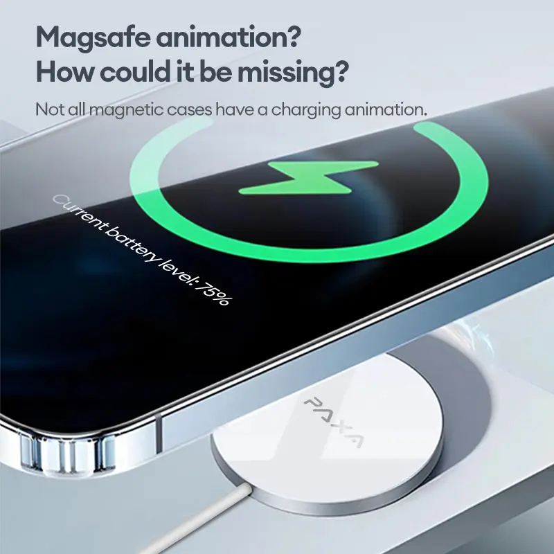 PAXA magnetic wireless charging stand, with strong magnetic attraction, supports 15W PD constant-temperature fast charging. It comes with an aluminum alloy stand, hands-free making it perfect for watching videos or playing games while charging.