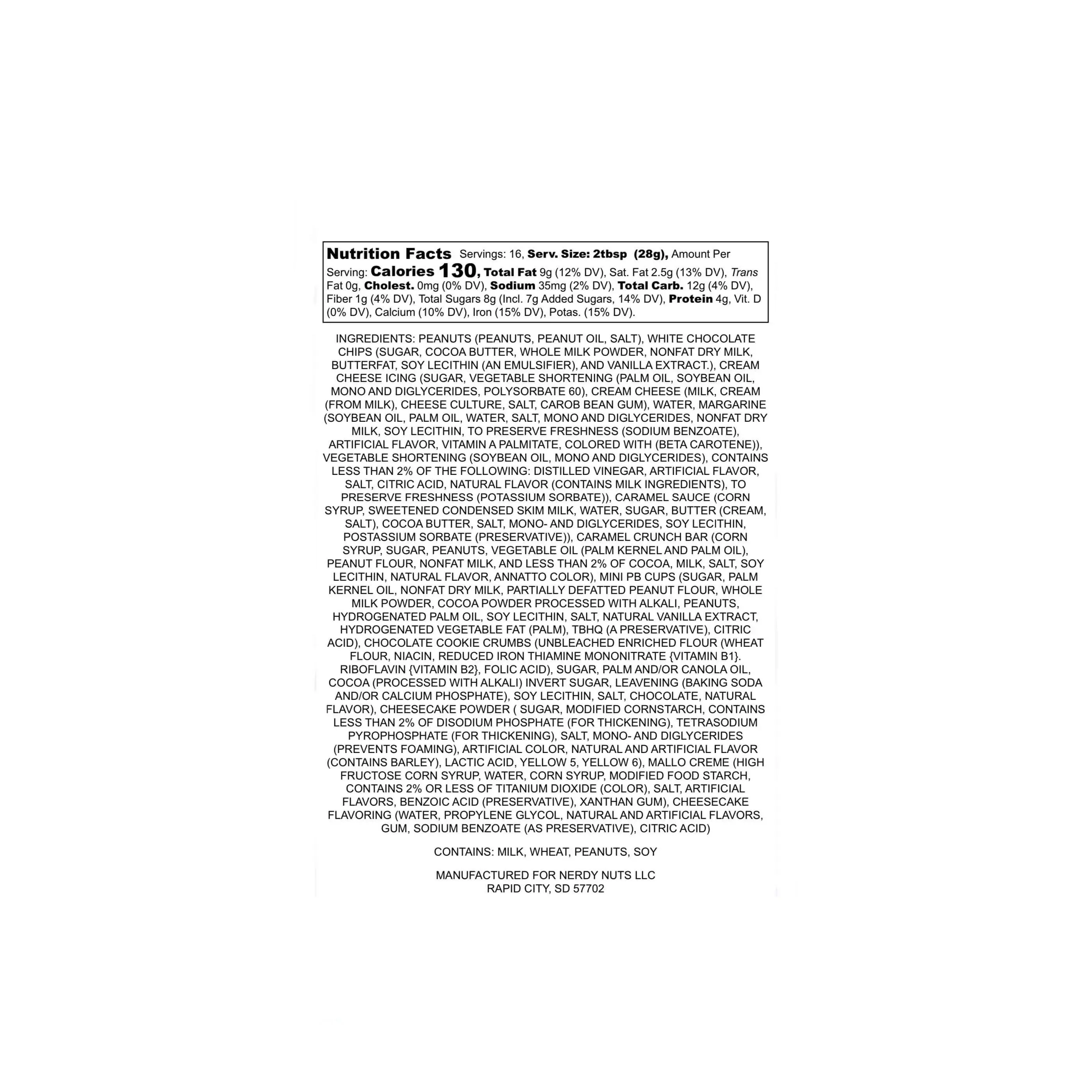 INGREDIENTS: PEANUTS (PEANUTS, PEANUT OIL, SALT), WHITE CHOCOLATE CHIPS (SUGAR, COCOA BUTTER, WHOLE MILK POWDER, NONFAT DRY MILK, BUTTERFAT, SOY LECITHIN (AN EMULSIFIER), AND VANILLA EXTRACT.), CREAM CHEESE ICING (SUGAR, VEGETABLE SHORTENING (PALM OIL, SOYBEAN OIL, MONO AND DIGLYCERIDES, POLYSORBATE 60), CREAM CHEESE (MILK, CREAM (FROM MILK), CHEESE CULTURE, SALT, CAROB BEAN GUM), WATER, MARGARINE (SOYBEAN OIL, PALM OIL, WATER, SALT, MONO AND DIGLYCERIDES, NONFAT DRY MILK, SOY LECITHIN, TO PRESERVE FRESHNESS (SODIUM BENZOATE), ARTIFICIAL FLAVOR, VITAMIN A PALMITATE, COLORED WITH (BETA CAROTENE)), VEGETABLE SHORTENING (SOYBEAN OIL, MONO AND DIGLYCERIDES), CONTAINS LESS THAN 2% OF THE FOLLOWING: DISTILLED VINEGAR, ARTIFICIAL FLAVOR, SALT, CITRIC ACID, NATURAL FLAVOR (CONTAINS MILK INGREDIENTS), TO PRESERVE FRESHNESS (POTASSIUM SORBATE)), CARAMEL SAUCE (CORN SYRUP, SWEETENED CONDENSED SKIM MILK, WATER, SUGAR, BUTTER (CREAM, SALT), COCOA BUTTER, SALT, MONO- AND DIGLYCERIDES, SOY LECITHIN, POSTASSIUM SORBATE (PRESERVATIVE)), CARAMEL CRUNCH BAR (CORN SYRUP, SUGAR, PEANUTS, VEGETABLE OIL (PALM KERNEL AND PALM OIL), PEANUT FLOUR, NONFAT MILK, AND LESS THAN 2% OF COCOA, MILK, SALT, SOY LECITHIN, NATURAL FLAVOR, ANNATTO COLOR), MINI PB CUPS (SUGAR, PALM KERNEL OIL, NONFAT DRY MILK, PARTIALLY DEFATTED PEANUT FLOUR, WHOLE MILK POWDER, COCOA POWDER PROCESSED WITH ALKALI, PEANUTS, HYDROGENATED PALM OIL, SOY LECITHIN, SALT, NATURAL VANILLA EXTRACT, HYDROGENATED VEGETABLE FAT (PALM), TBHQ (A PRESERVATIVE), CITRIC ACID), CHOCOLATE COOKIE CRUMBS (UNBLEACHED ENRICHED FLOUR (WHEAT FLOUR, NIACIN, REDUCED IRON THIAMINE MONONITRATE {VITAMIN B1}. RIBOFLAVIN {VITAMIN B2}, FOLIC ACID), SUGAR, PALM AND/OR CANOLA OIL, COCOA (PROCESSED WITH ALKALI) INVERT SUGAR, LEAVENING (BAKING SODA AND/OR CALCIUM PHOSPHATE), SOY LECITHIN, SALT, CHOCOLATE, NATURAL FLAVOR), CHEESECAKE POWDER ( SUGAR, MODIFIED CORNSTARCH, CONTAINS LESS THAN 2% OF DISODIUM PHOSPHATE (FOR THICKENING), TETRASODIUM PYROPHOSPHATE (FOR THICKENING), SALT, MONO- AND DIGLYCERIDES (PREVENTS FOAMING), ARTIFICIAL COLOR, NATURAL AND ARTIFICIAL FLAVOR (CONTAINS BARLEY), LACTIC ACID, YELLOW 5, YELLOW 6), MALLO CREME (HIGH FRUCTOSE CORN SYRUP, WATER, CORN SYRUP, MODIFIED FOOD STARCH, CONTAINS 2% OR LESS OF TITANIUM DIOXIDE (COLOR), SALT, ARTIFICIAL FLAVORS, BENZOIC ACID (PRESERVATIVE), XANTHAN GUM), CHEESECAKE FLAVORING (WATER, PROPYLENE GLYCOL, NATURAL AND ARTIFICIAL FLAVORS, GUM, SODIUM BENZOATE (AS PRESERVATIVE), CITRIC ACID)