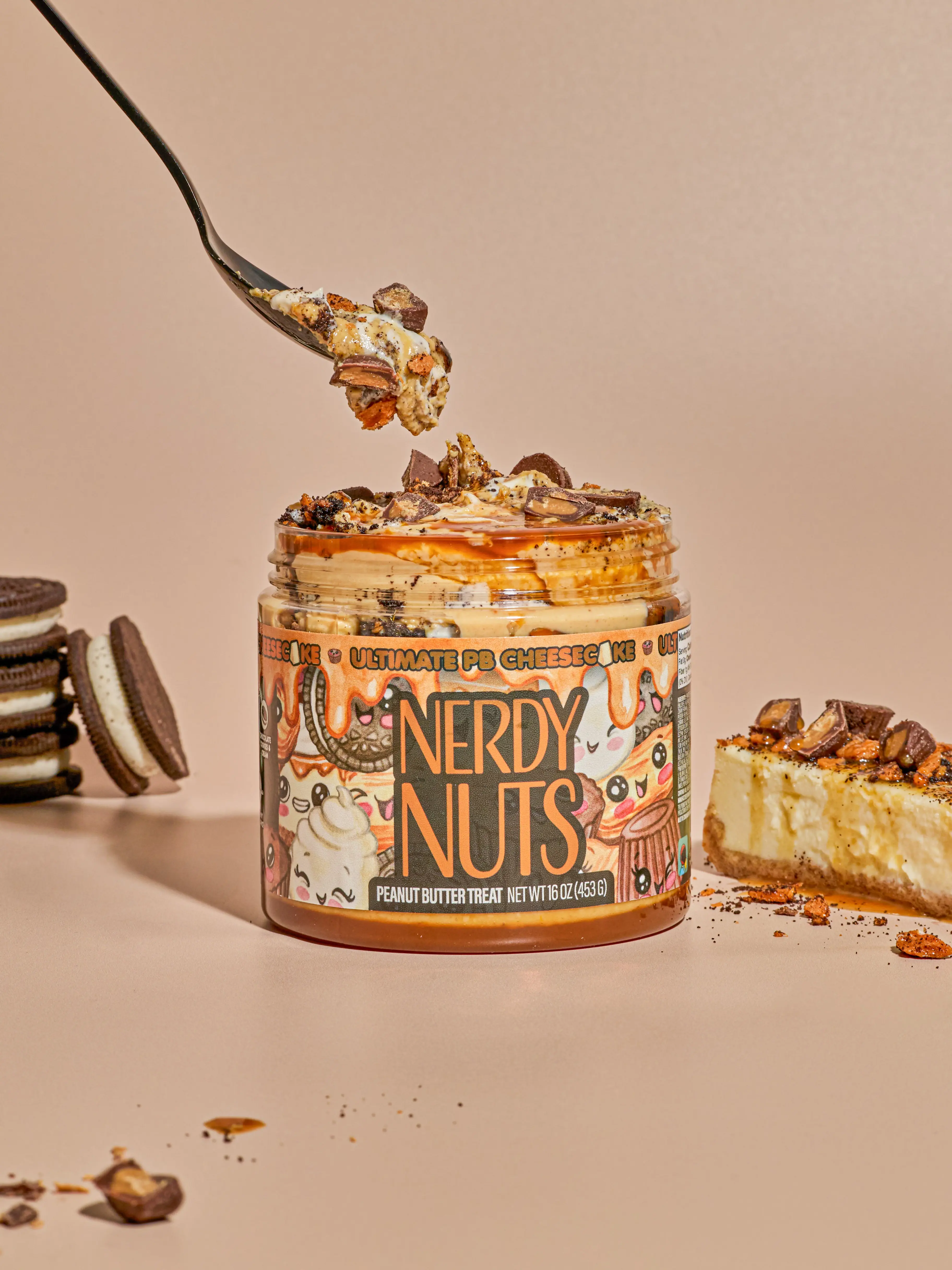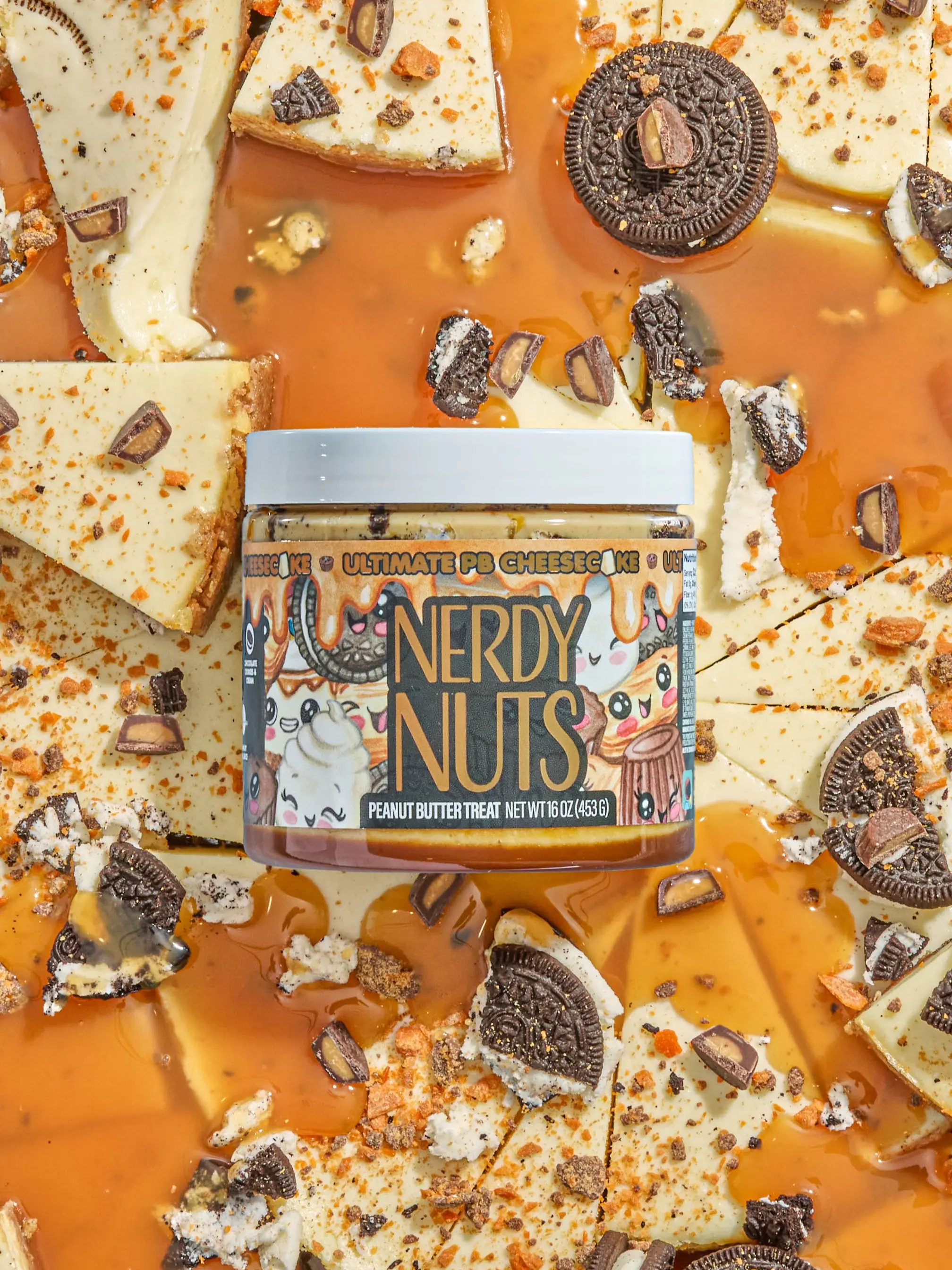 White chocolate cheesecake peanut butter is layered on a cookies & cream crust, swirled with caramel sauce, topped with cheesecake mallow frosting, mini peanut butter cups, and chocolate peanut butter candy crisps!