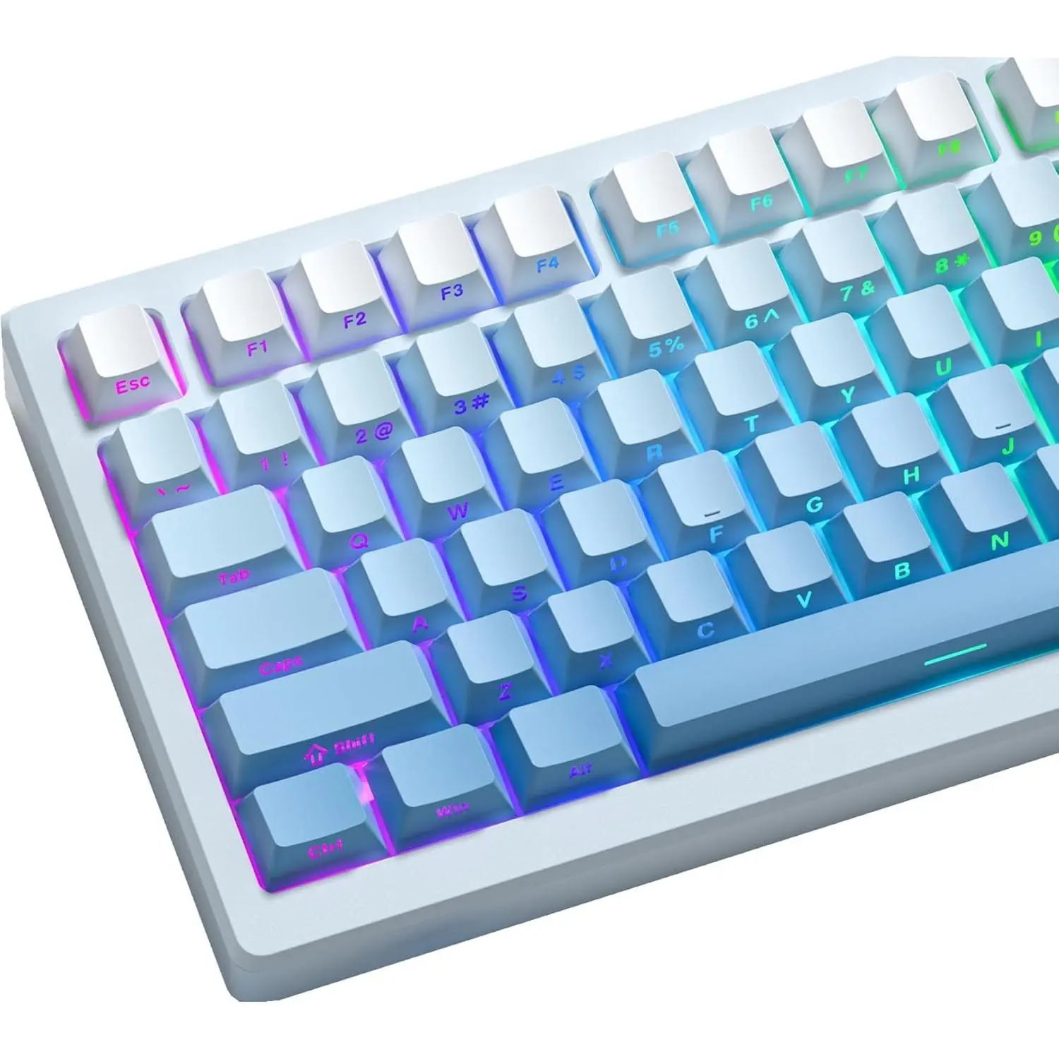 γSpace bar personality designγThe key cap consists of four color gradients, each from light to dark gradients. More uniquely,the space bar of this key cap is composed of two colors, and the place where the colors intersect is a light transmittance band, making your RGB keyboard .