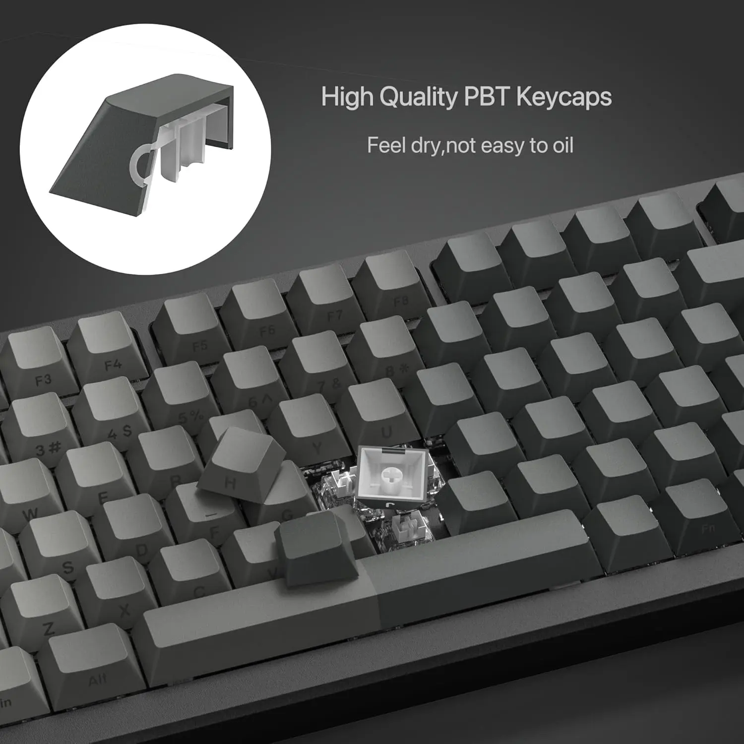 γDouble Shot PBT KeycapsγThe keycap Set delivers in quality with PBT keycaps whose legends will never wear . Compared to ABS material, PBT is feel textures better and can be for a longer time. It's dry and not easy to get oily.