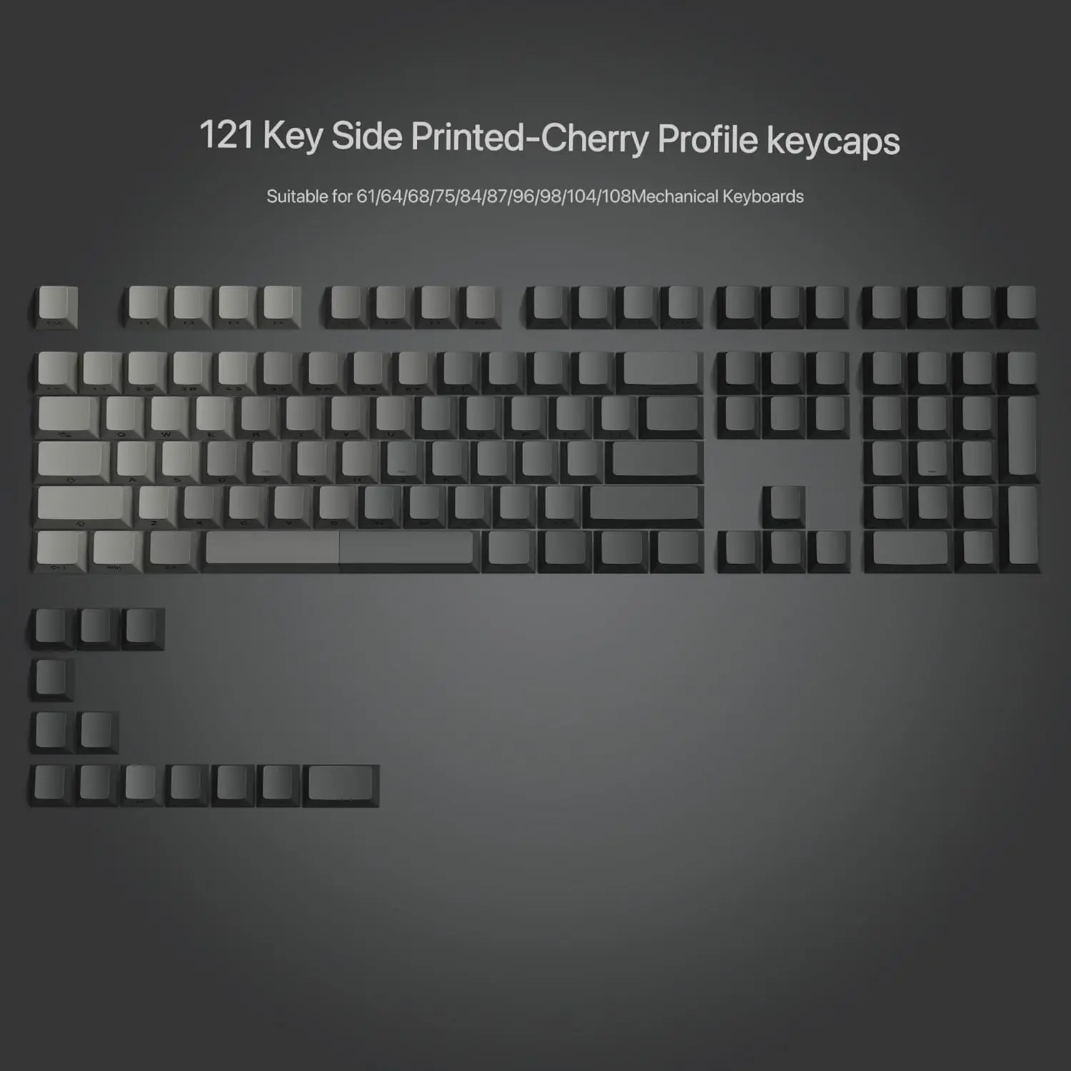 γWidely CompatibleγThis keycap contains 121 . Including 104 standard and 17 modifiers , compatible with 60%/65%/75%/80%/96%/ (61/64/68/75/84/87/96/98/104/108) mechanical keyboards.Not suitable for mechanical keyboards with 71 .