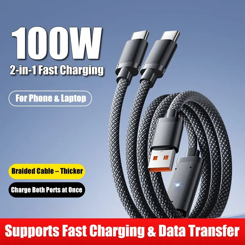Pd100w Max Fast Charging Cable, One-To-Two Braided Data Line, Two-In-One Charger, USB-C Cable, Type-C Charging Cord for iPhone, Switch, Macbook, iPad
