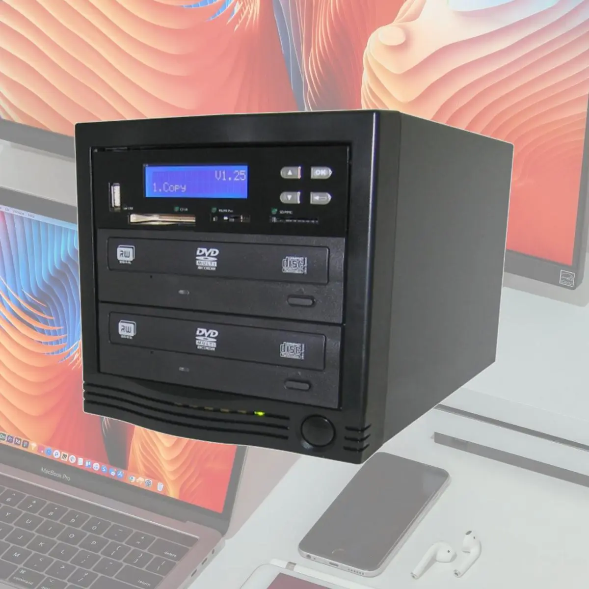 Back up your important data from erasable memory cards or flash drives to archival CD's or DVD's. The new ZipSpin ProFlash Duplicator is your all-in-one stand alone solution for data backup and disc duplication. No hard drive required the ZipSpin PFD has a compact and stylish design with multiple memory card and USB drive readers built-in. Intelligent Multi-Session and Disc Spanning Technologies make data transfer as easy as one touch of a button. The ZipSpin PFD is also a disc duplicator that copies up to three discs at a time. Experience all the benefits that the ZipSpin ProFlash Multimedia Backup System has to offer. Features: CD-DVD Copy to D-DVD Multi-Session Technology Disc Spanning Duplicates Audio CD Video CD DVD Video and virtually any data disc in a matter of minutes without a computer. Backup multiple small capacity memory cards or USB drives into one CD or DVD disc. Automatically distributes files to multiple target discs when copying a memory card with more data than one disc can hold. Specifications: Operating Type Stand-alone (No PC Required) Writing Method DAO TAO Backup Method Single Session-Multi-Session -Disc Spanning Display 2 x 16 Backlit LCD Language English System Memory 64MB Input 4 Button Operation Supported Recording Discs DVD plus R DVD plus RW DVD-R DVD-RW Dual Layer DVD plus-minus R Business Card CD 3'' Mini CD-R Standard CD-R- RW CD-DVD Max Writing Speed 20X DVD plus-minus R 8x Dual Layer DVD plus-minus R 8x DVD plus RW 6x DVD-RW 56x CD-R 32x CD-RW Supported Source Formats MS Slot: MS MS-Duo MS Pro MS Pro Duo MS MagicGate MS Pro MagicGate MS-Duo MagicGate MS Pro Duo MagicGate etc. CF Slot: CF I CFII IBM Micro Drive SD Slot: SD SD Pro Mini SD Mini SD Pro Micro SD SD HS WI-FI SD Super HS SD (Adapter Required) MMC Slot: MMC MMC Pro MMC II RS-MMC Discs: DVD-ROM DVD-Video DVD plus R DVD plus RW DVD-R DVD-RW Dual Layer DVD plus-minus R CD-ROM CD-I Audio CD Video CD Bootable CD Mixed-mode CD Multi-session CD CD-Plus Business Card CD 3'' Mini CD-R USB Drive