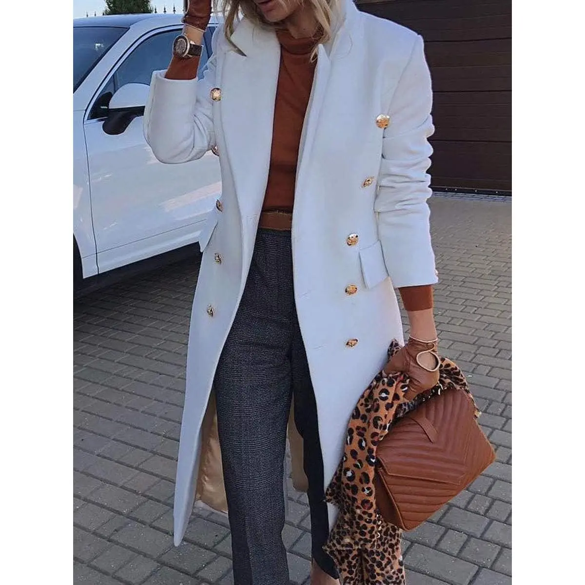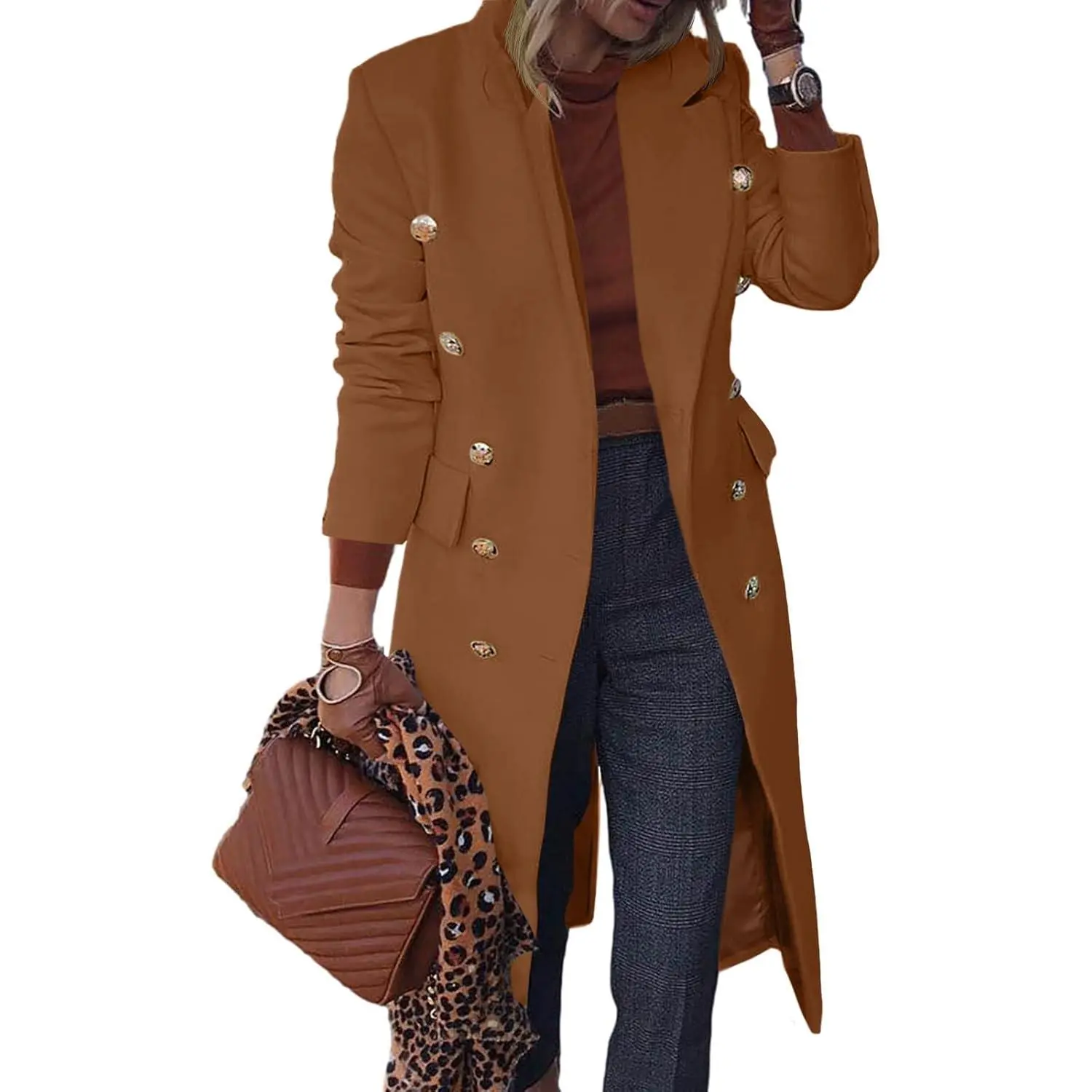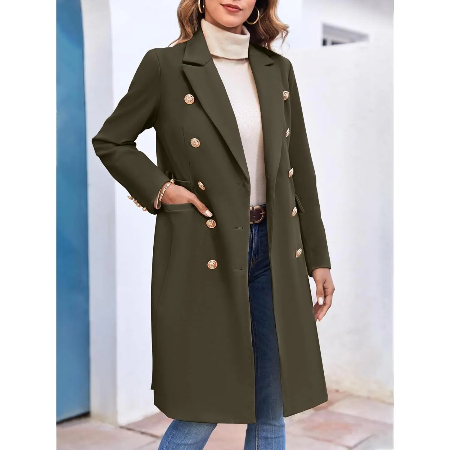 Women's Elegant Double Button Slim Long Wool Blend Pea Coat Jacket