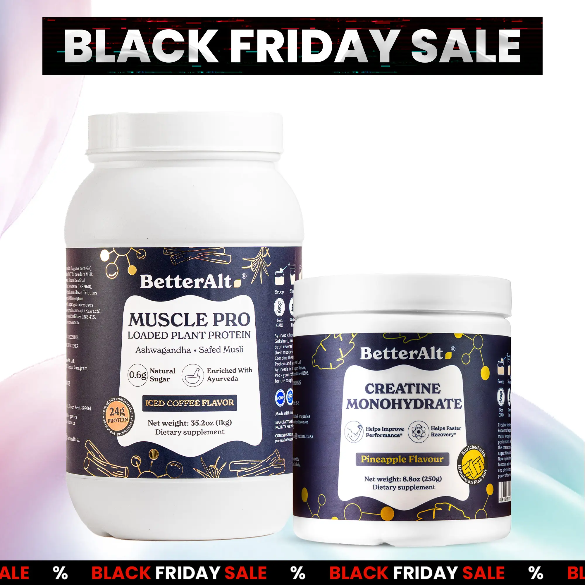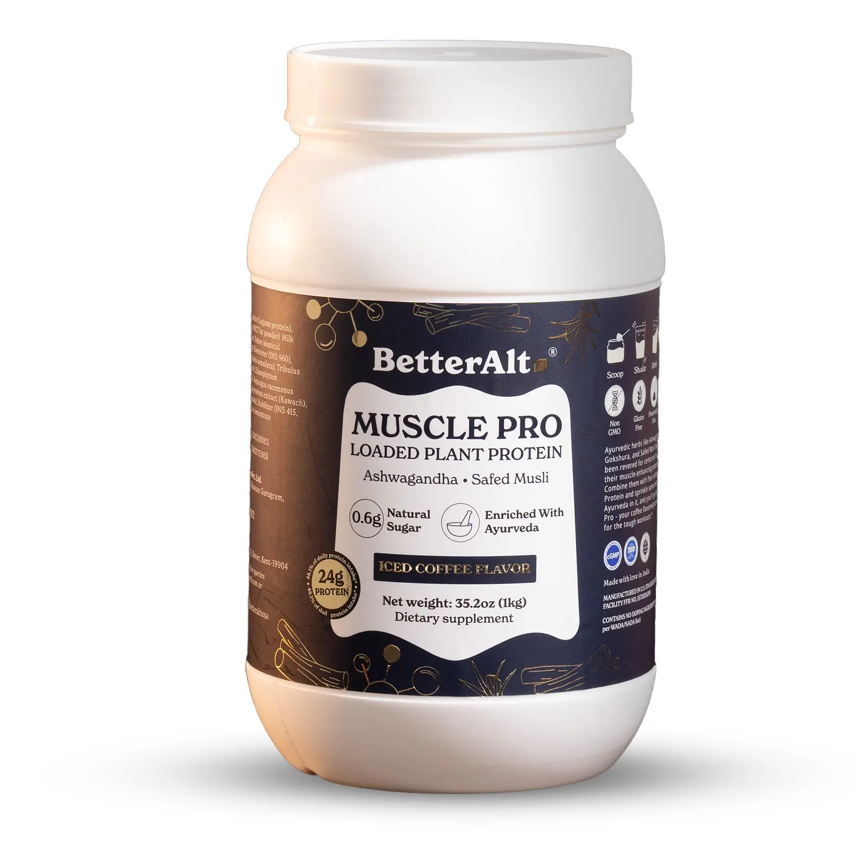 ·BetterAlt Muscle Pro is a plant-powered protein supplement packed with pea protein isolate, MCT powder, and 5 Ayurvedic herbs to help enhance your post-workout routine.