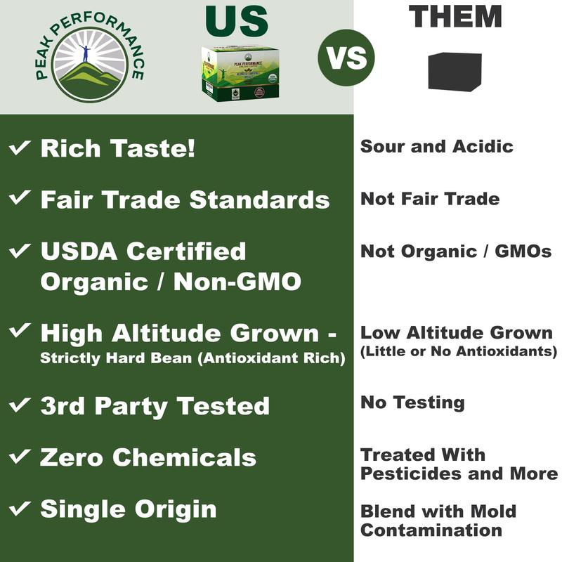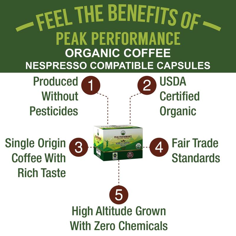 Peak Performance Organic Capsules for Nespresso Machines - Not Compatible with Vertuoline Brewers. USDA Certified Organic - Single Origin - High Altitude - Fair Trade. If We Could Make This Coffee Any Healthier We Would! Medium Roast Capsules.
