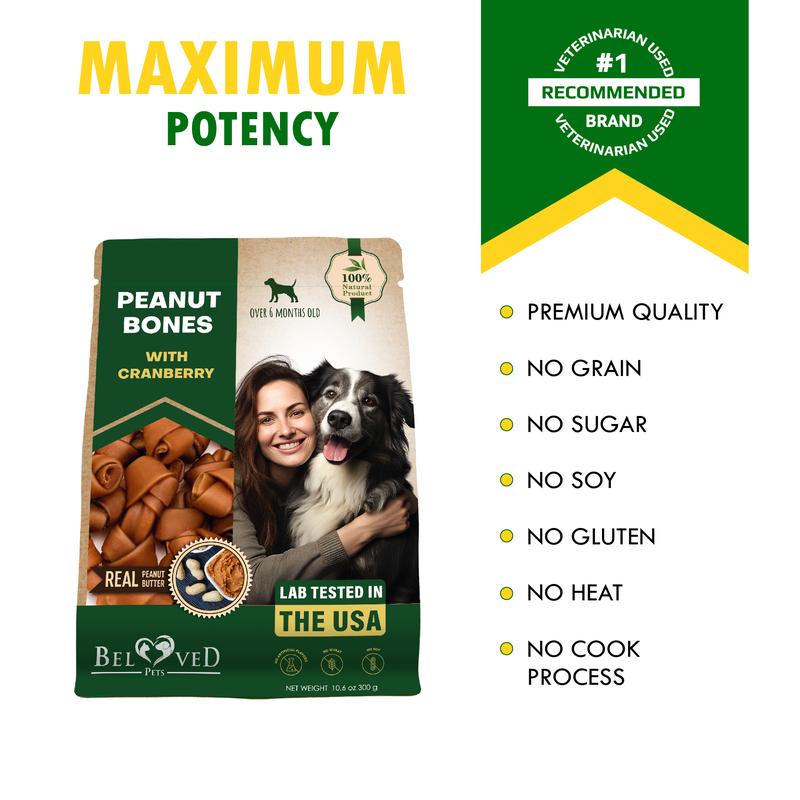 Dog peanut butter bones with cranberry: Treat your pup to high-quality, natural, and healthy food with our long-lasting peanut butter bones. These chews are ideal for training and promoting dental health by reducing plaque and tartar. They strengthen jaws, keep breath fresher, and provide a satisfying, nutritious reward that dogs love.